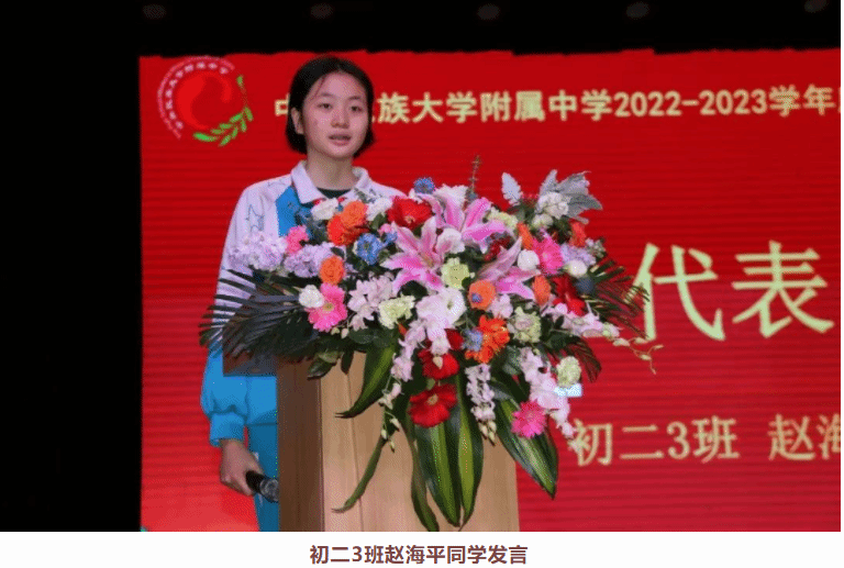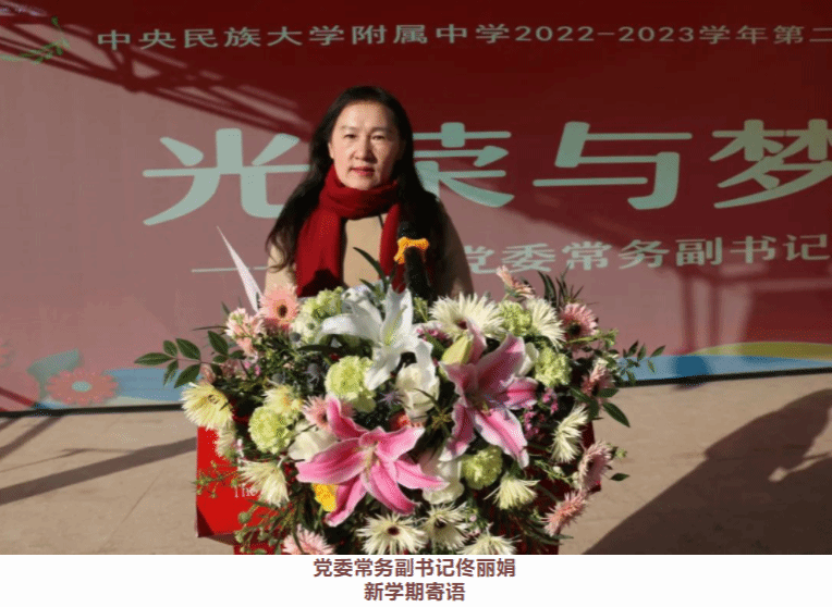 民大附中党委常务副书记佟丽娟在致辞中提到,2023年是全国各族人民贯彻落实党的二十大精神之年,也是我们william威廉中文官网附中建校110周年。我们每个民附人都承载着赓续红色血脉的光荣与使命,把“小我融入大我,把青春奉献祖国”,让党的二十大精神在民附这片热土落地生根,让铸牢中华民族共同体意识的生动实践成为学校高质量特色办学的闪亮名片。