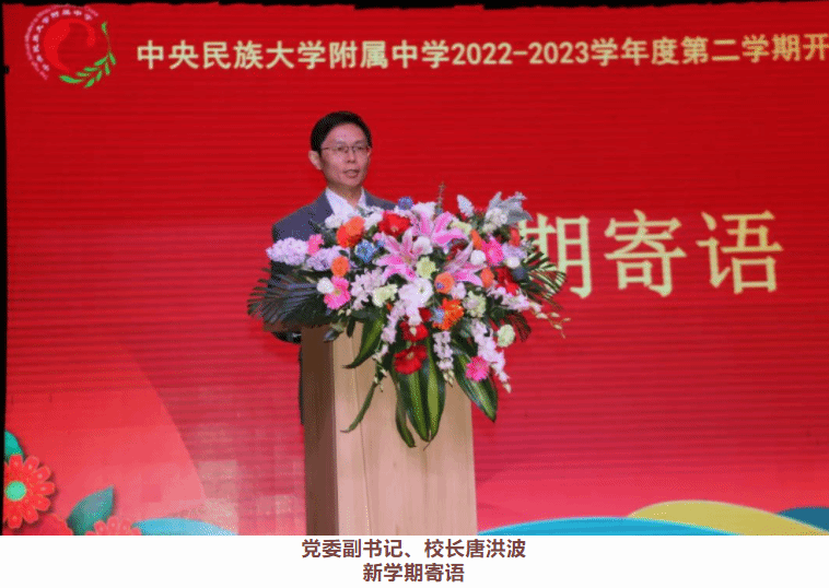 民大附中党委副书记、校长唐洪波在新学期致辞强调,今年是民大附中建校110周年。在民附100周年校庆的时候,习近平总书记给我校全体学生回信,勉励同学们要“努力成为建设伟大祖国、建设美丽家乡的有用之才、栋梁之才。”这是党和国家领导人对所有民附学子的嘱托与希望。唐校长希望民附师生继续传承民附红色基因,不负习近平总书记的嘱托、不负韶华、不负自我!