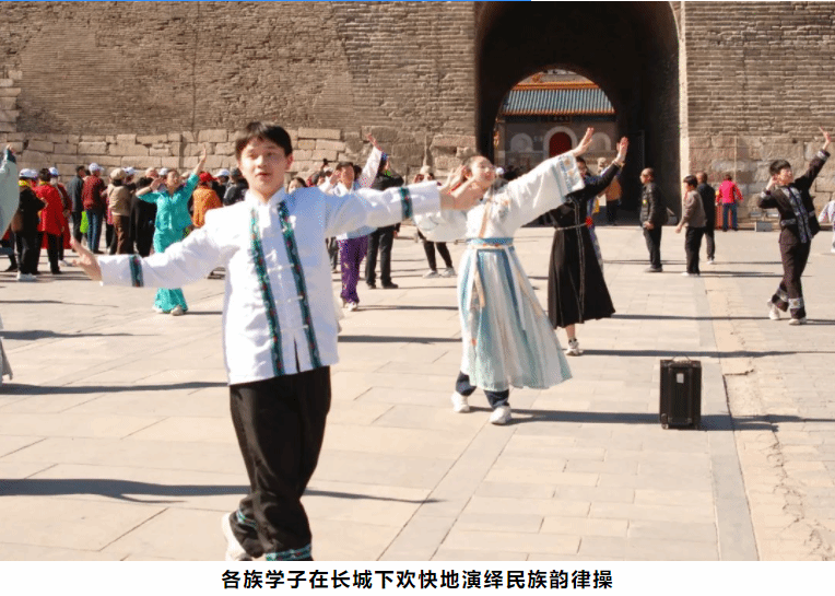 居庸关长城脚下,民附学子伴着《爱我中华》的旋律演绎着民族韵律操,展现了“中华民族一家亲,同心共筑中国梦”的美好愿景。