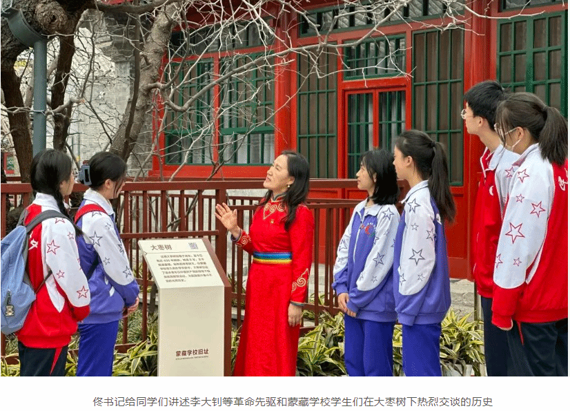 蒙藏学校旧址西院,有一棵近400岁的大枣树,苍劲挺拔。我校党委常务副书记佟丽娟站在枣树下,给学生们上了一节生动的党课,佟书记讲到,近百年前,就在这棵树下,李大钊等革命先驱和蒙藏学校的学生们热烈交谈,传播马克思主义,启迪他们的思想,照亮他们前行的路。