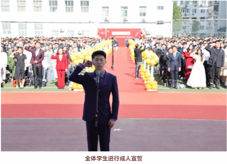 高三学子盛装打扮,在老师和家长的共同见证下,神情庄重地跨过“成人门”,他们从学校领导手中接过《中华人民共和国宪法》读本,佩戴成人纪念章,在成人门前合影留念。成人门两端,连接着过往与未来,跨过成人门,寓意着青年学子告别稚嫩与懵懂,走向成熟与坚定,步入学业与生活的崭新起点。