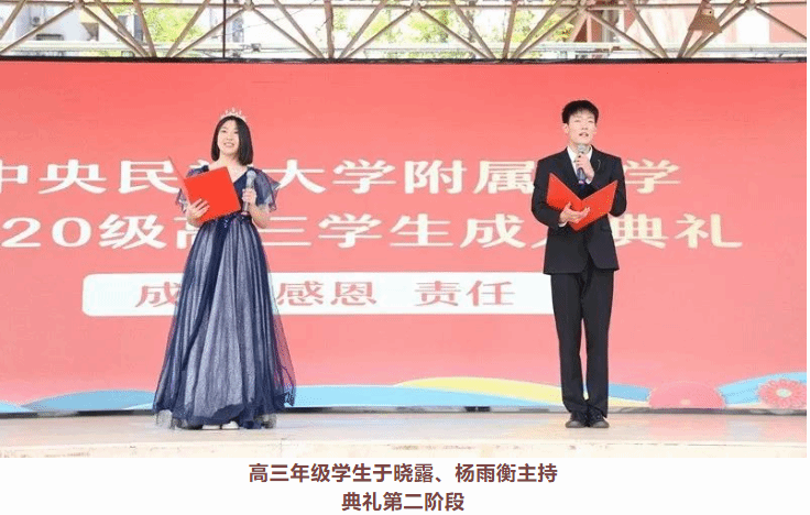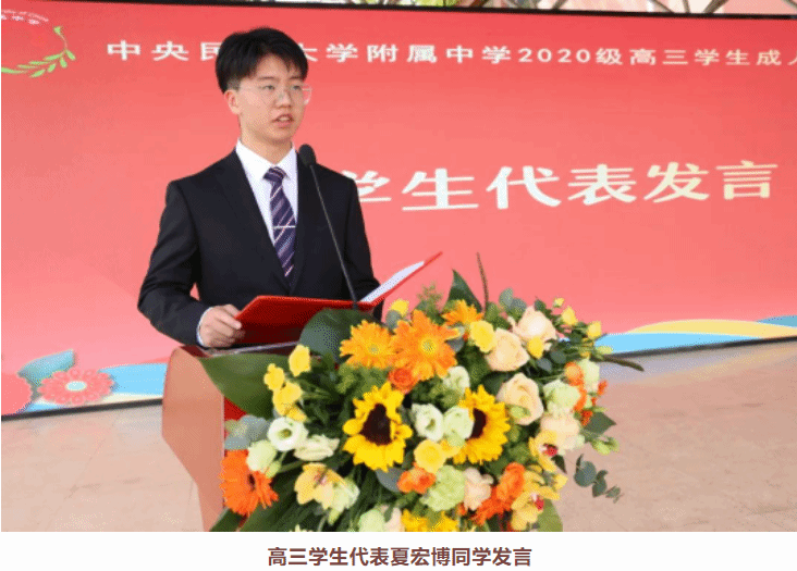 陌上春已绿,此间花正繁。在这万物复苏的美好时节里,我们在这里隆重举行2023届高三学子成人典礼。首先,我代表学校向同学们表示祝贺!十八岁,像一朵璀璨的鲜花,绚丽地绽放,祝贺你们成为共和国最年轻的成年公民!“成人礼”是我国优秀传统文化中最重要的礼仪之一,从古代的“冠笄之礼”到今天的“成人之门”,庆祝的方式不断创新,但传承的血脉和精神不变,寄寓的内涵和价值如故,承载的使命和责任深邃。当你们跨过成人门,面向国旗,举起右手,发出誓言的这一刻,就意味着你们将开启新的人生征程,你们将承载着奋斗与激情,在责任与担当、梦想与挑战、内省与反思的平衡中走向成熟,见天地,见众生,成真我,正所谓:十八而志,梦想起航。成年意味着你们享有更多权利、履行更多义务。根据《中华人民共和国宪法》规定,十八岁后,你们被赋予选举权和被选举权等政治权利,可以参加选举投票、参选公职等政治活动,可以为国家发展、社会进步贡献更多力量。你们在享有自由和权利的同时,更要三思而行,不可鲁莽冲动,要遵守宪法和法律,要为自己的行为承担相应的法律后果。成年意味着心怀感恩、肩负责任。18岁,长大了,意味着你们已经是可以为自己负责的人,今后你们不仅需要关怀,还要学会承担责任,对自己和他人负责,对父母和师长负责,对国家和社会负责,做一个心怀感恩、胸怀家国的负责之人。要科学规划,成就自我。要学会规划自己未来的人生,想想你们自己想要什么,并为之付出努力,眼下的高考虽不是改变你们命运的唯一道路,但一定是最好的机会,要抓住时机,奋发努力,笃行不怠,用奋斗青春点亮美好未来。要感恩父母,回报恩情。过去的十八年里,父母关心你、照顾你,为你遮风挡雨,撑起一片晴空。成年意味着父母已经不再年轻,你们要逐渐承担起更多家庭的责任,也要逐步割舍对父母依赖的心理,反之成为父母的骄傲和依靠。要热爱祖国,服务人民。成年更意味着对国家、对社会的责任。习近平总书记说“未来属于青年,希望寄予青年”,2035年远景目标纲要为我们擘画了美好发展蓝图,展现在我们面前的是无限的机遇和广阔的舞台。作为新时代的弄潮儿,要将个人发展融入大变革的时代当中去,希望你们志存高远,脚踏实地,锤炼品格,艰苦奋斗,扬奋斗风帆,助复兴之梦,努力在实现中华民族伟大复兴的中国梦中放飞青春理想,成为可爱、可信、可为、可靠的民附新青年,书写民附新华章。三个月后,你们将迎来成年后的第一场考验,从民附校园走向诗与远方,实现梦想。世上有的爱,是将你们越拉越近,有的爱,却是望着你们的背影渐行渐远。此时爱你,就要给你自由,让你独立。此时爱你,就让你今天厚积,明天薄发。今年是民大附中建校110周年,在民大附中建校100周年时,习近平总书记寄语民附学子“珍惜美好时光,砥砺品德,陶冶情操,刻苦学习,全面发展,掌握真才实学,努力成为建设伟大祖国、建设美丽家乡的有用之才、栋梁之才”,这就是民附学子成人成事的理想追求。希望同学们胸怀大志、心怀善良、踔厉奋发、勇毅前行,感受美好、拥抱幸福,将自己的个人成长融入中华民族伟大复兴中,让青春在时代的浪潮里扬帆起航,在祖国的星空中闪亮发光。最后,祝愿你们在成年后的第一次人生大考中梦想成真!