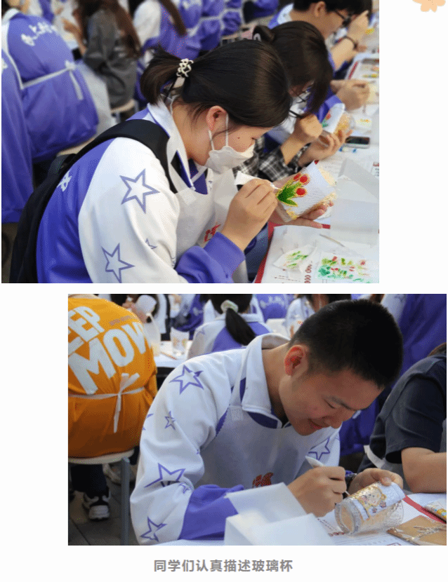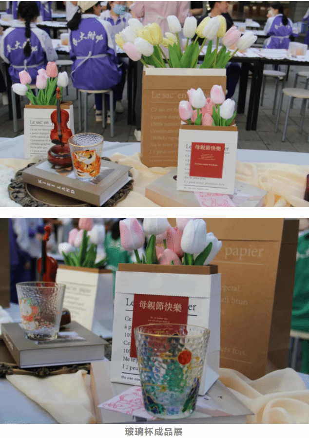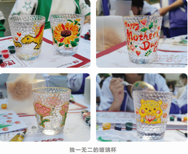 在“独一无二的手绘玻璃杯”活动中,同学们在老师的指导下,精心描绘多彩的图案,在他们专注的神情和细细的勾勒中,我们看到了同学们对妈妈的深情与爱意。