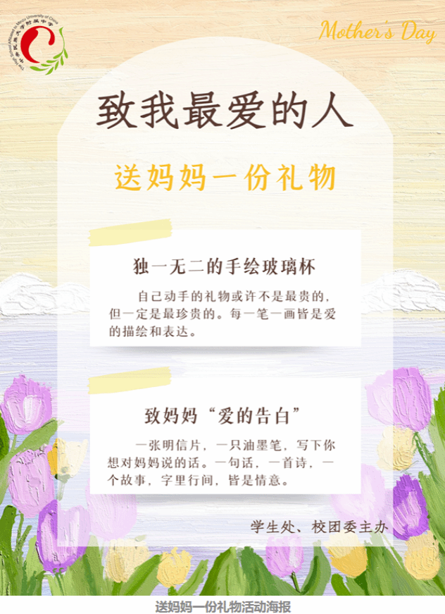 为引导学生在母亲节给妈妈送上一份独特而温暖的礼物,5月12日下午,我校在海淀校区举办了“送妈妈一份礼物”的主题活动。