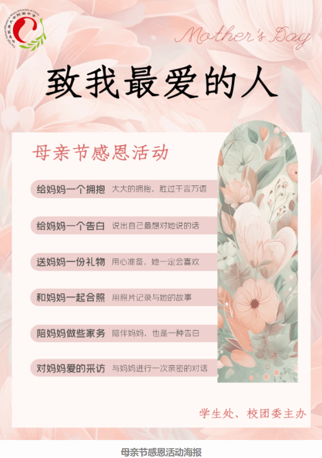 今年,我们倡议同学们:给妈妈一个拥抱、致妈妈一次告白、送妈妈一份礼物、邀妈妈一起合照、陪妈妈做些家务、对妈妈爱的专访等,鼓励同学们用多样化的方式,向妈妈表达爱与感激。