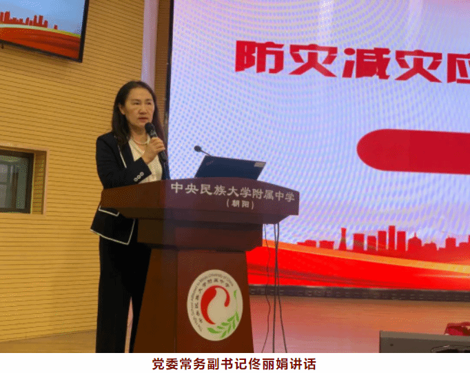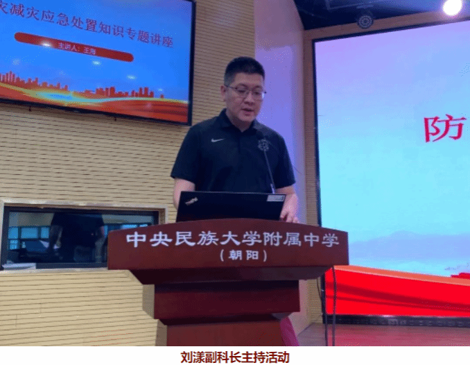 为进一步增强防灾减灾意识,普及推广师生防灾减灾知识和避灾自救技能,我校近日在朝阳校区大礼堂开展了"防震减灾应急处置知识专题讲座"活动。本次活动特邀请原北京紧急救援培训基地训练部主任王海担任讲座主讲。我校党委常务副书记佟丽娟、朝阳校区综合办主任韩山、德育科副科长刘漾及高一年级200余名同学参加了本次活动。活动由刘漾副科长主持。