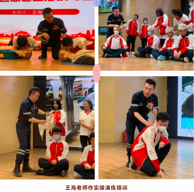 讲座过程中,王海老师通过现场演练为学生生动呈现了许多急救知识,并多次邀请学生上台进行模拟练习,如:心肺复苏、人工呼吸、胸外心脏按压、防踩踏自救、三角巾包扎等,增加了学生们的实践经验。