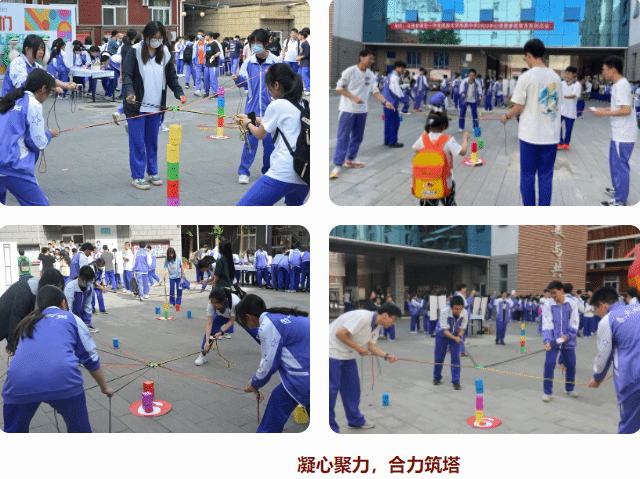 在“合力筑塔”活动中,师生一起拉紧绳索来控制塔钩移动,用塔钩将一块块塔吊起,最终搭建成一座高塔。直到搭建完那一刻,大家悬着的心才终于放下,团队协作和信任的魅力也在此刻蔓延开来。