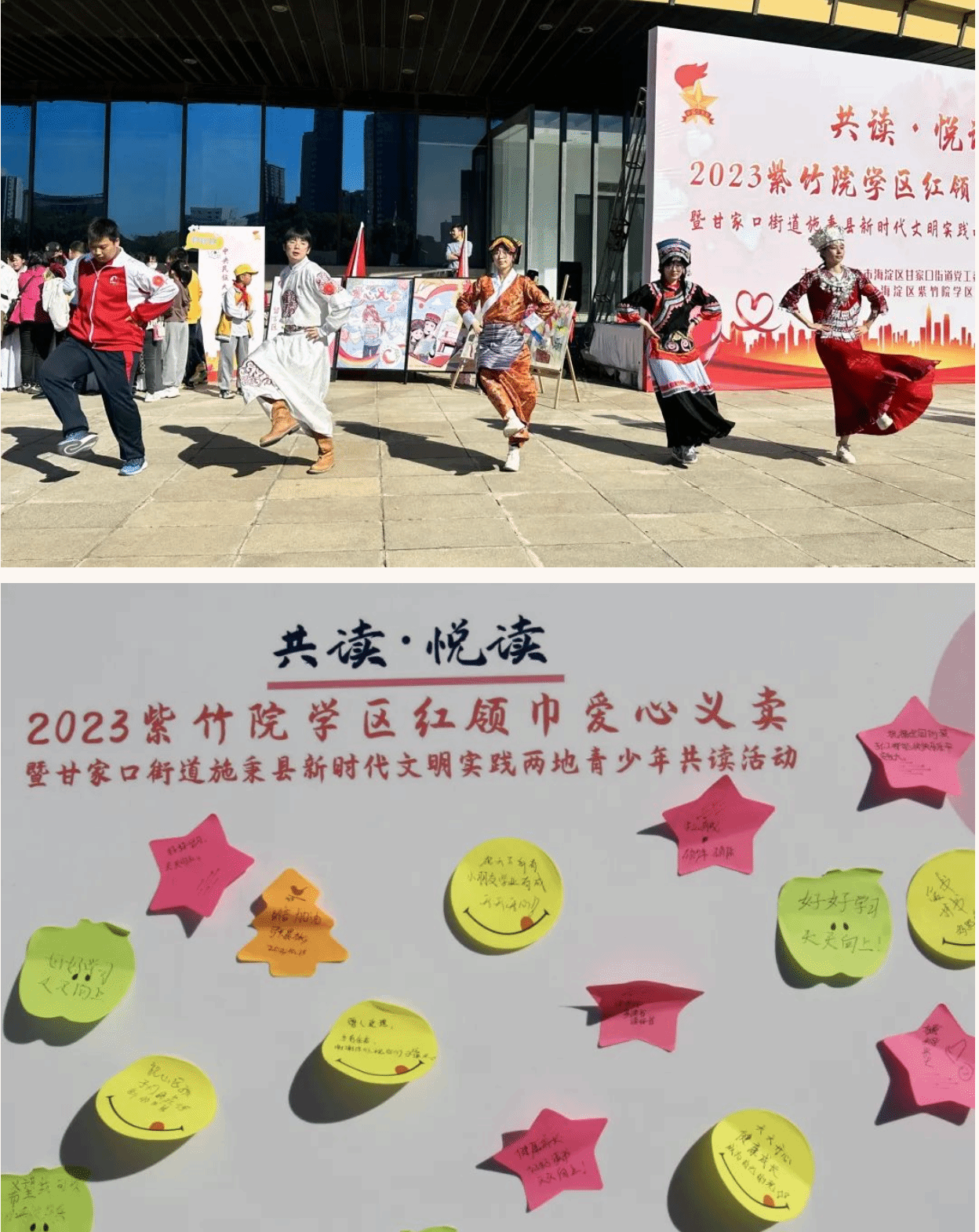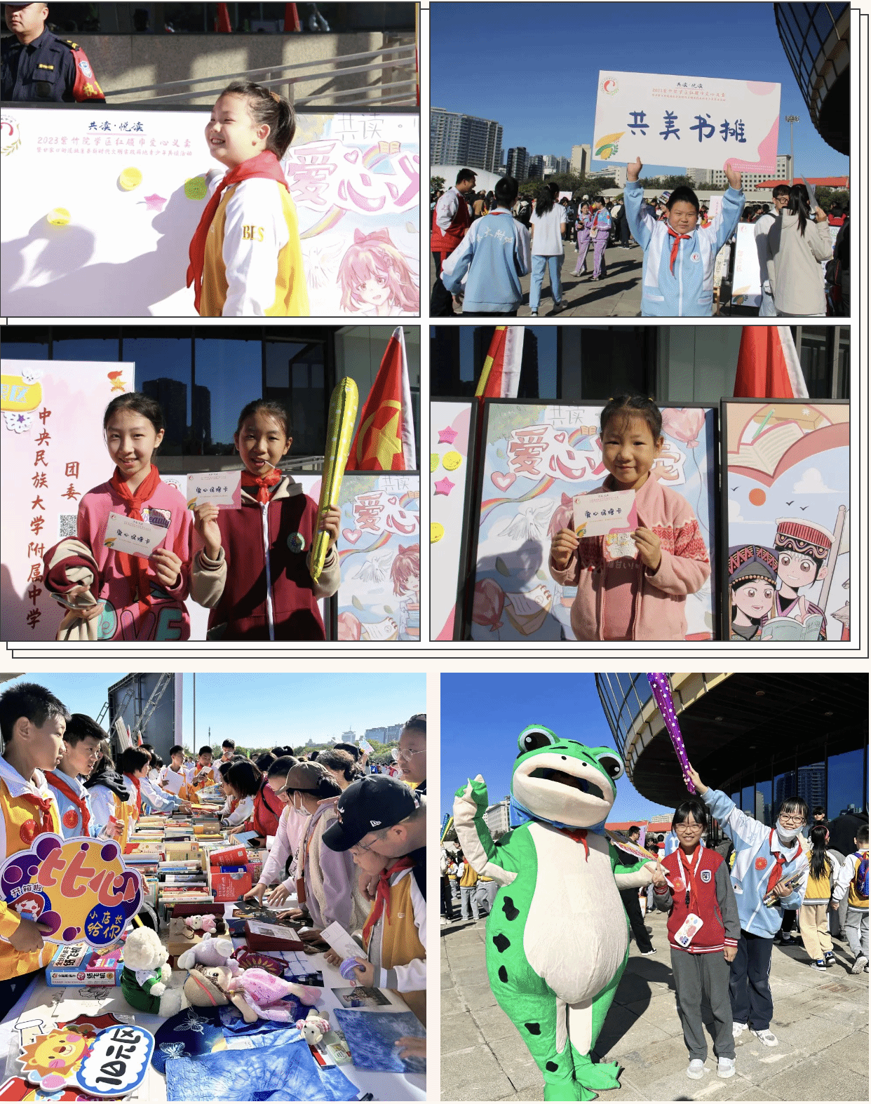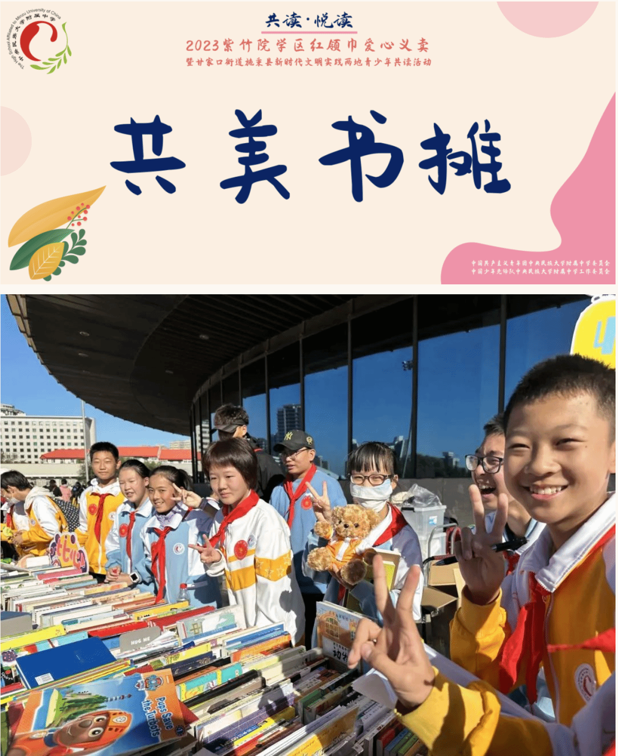 10月21日上午,在海淀区新时代文明实践中心办公室指导下,由甘家口街道新时代文明实践所、紫竹院学区管理中心共同主办的“共读·悦读”2023紫竹院学区红领巾爱心义卖暨甘家口街道施秉县新时代文明实践两地青少年共读活动在中央电视塔广场举行。我校团委、少工委组织20余名共青团员、少先队员代表参加活动,支起了民附“共美书摊”,在志愿服务奉献爱心中,展我民附学子风采。