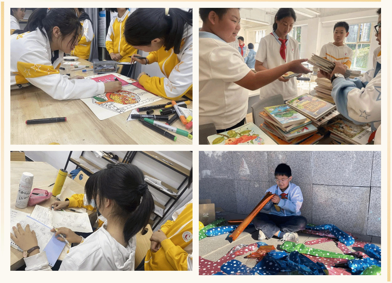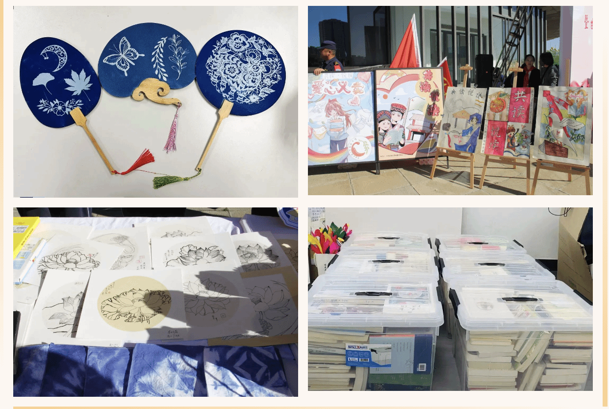 本次活动得到了我校初高中师生的积极响应,在校党委的部署下,我校团委、少工委面向初高中部学子募集1500余本闲置图书、若干文具及手工艺品,我校民族印染社团向本次活动捐赠了师生扎染的手绢及利用蓝晒工艺制作的扇子,高二年级9班的同学们捐赠了美术课上绘制的绘画作品20余份。学生们热情投入,准备工作有条不紊,大家用画笔、绘图软件制作了精美的海报、制订营销策略等,力求物尽其用,人尽其力,奉献爱心。