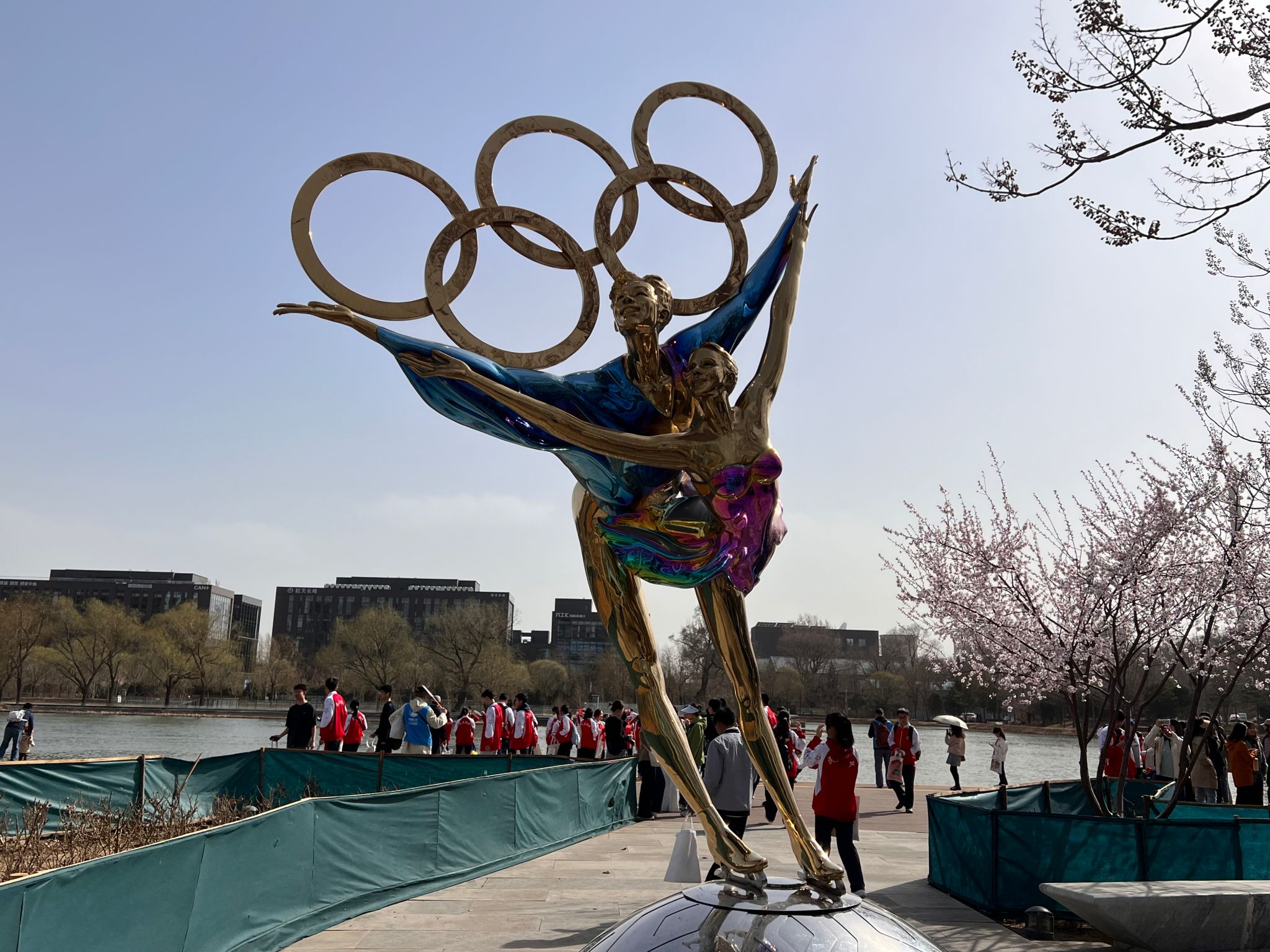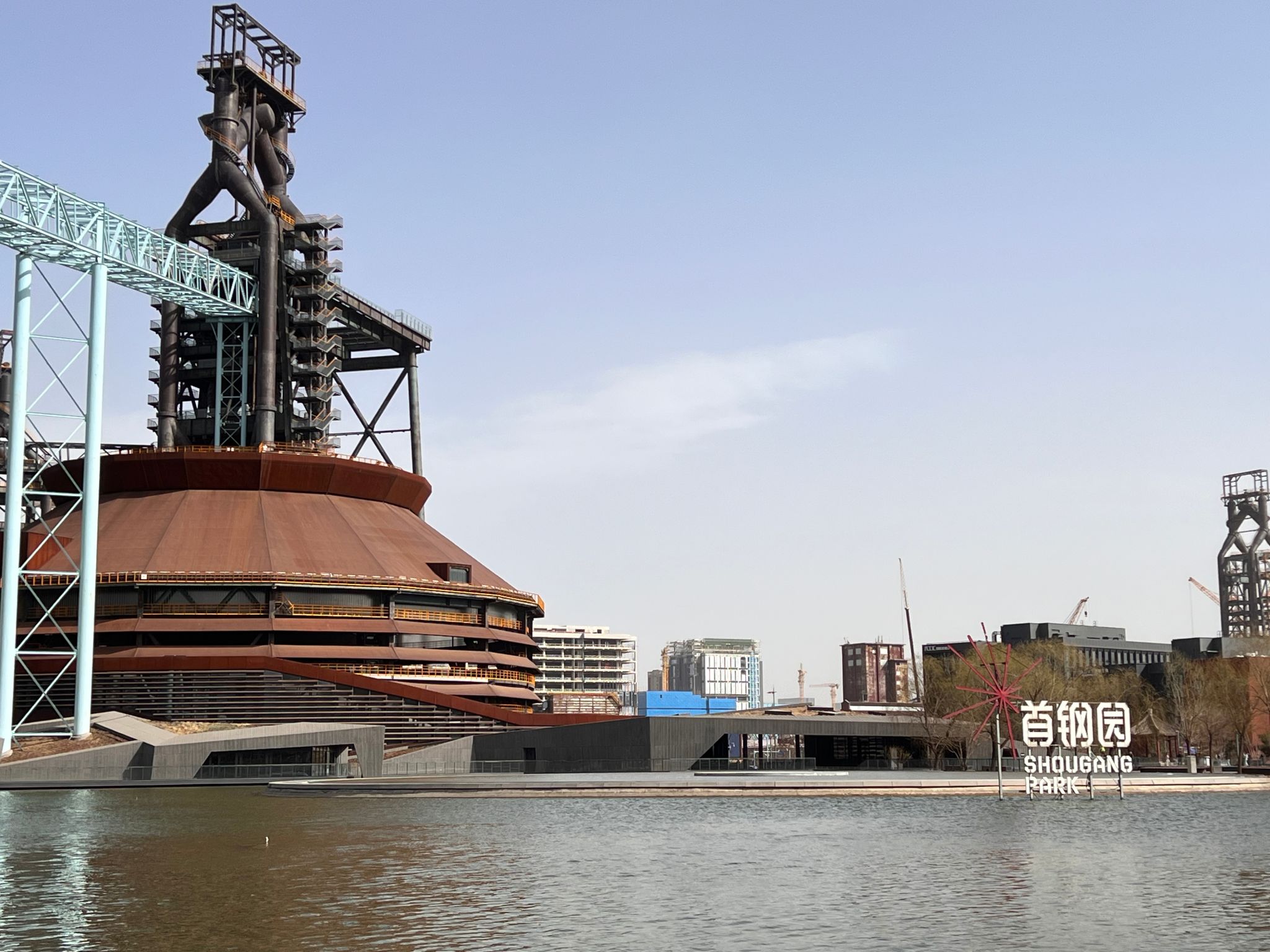 经过瞭仓,我们抵达风景秀美的秀池。向西看,水波荡漾,群鱼潜底,青山倒映,见证了传统工业区的绿色转型升级。向东看,三高炉坐在池边,伸出蓝色的钢架搭在一旁的冬奥组织委员会馆,它似乎在回味着过往的辉煌,又像在做一场首钢再辉煌之梦。