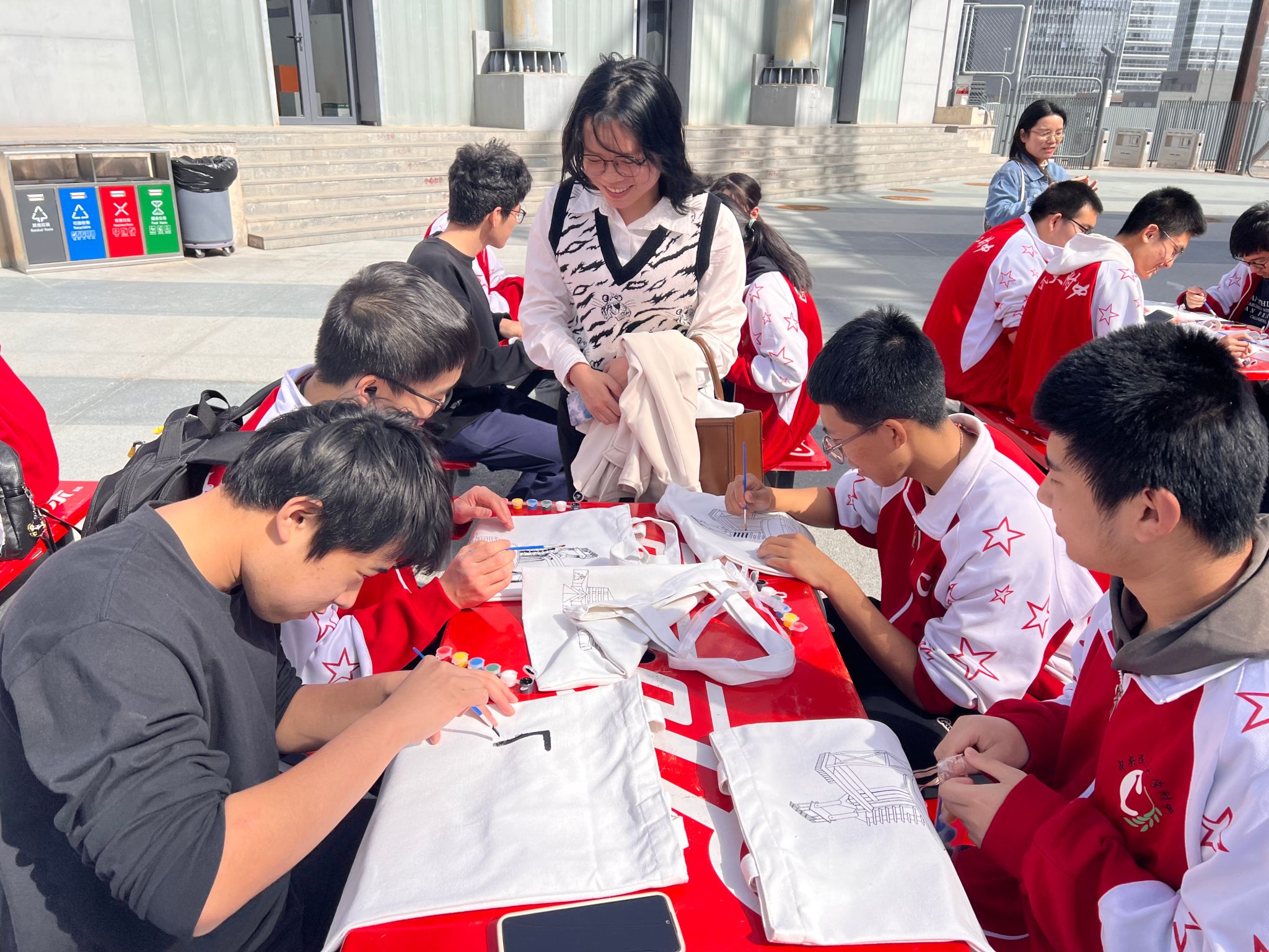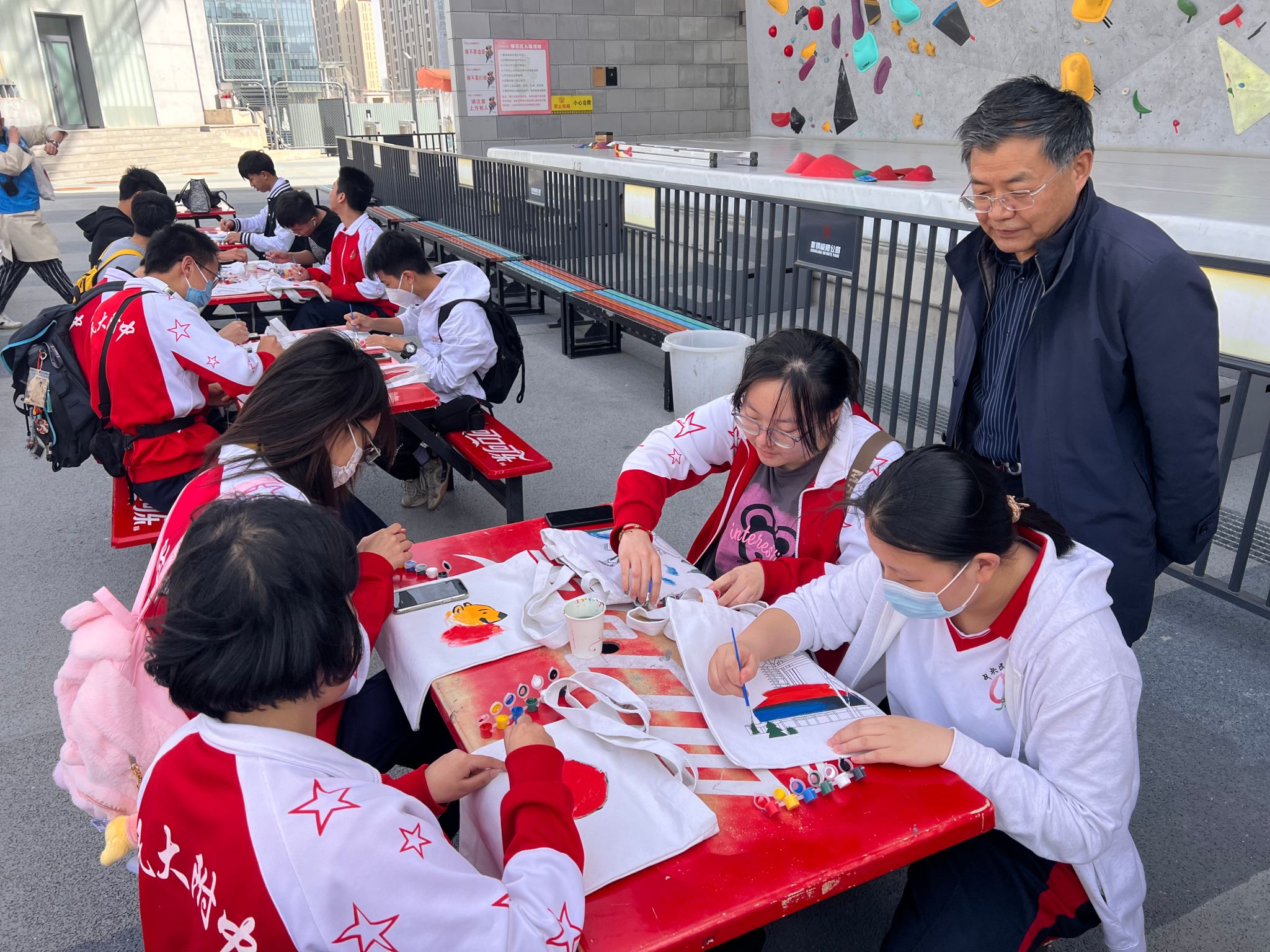 同学们首先去了极限公园里进行艺术创作,锈色的首钢在笔刷之下变成了色彩斑斓的乐园,想象与现实编织出欢声笑语。