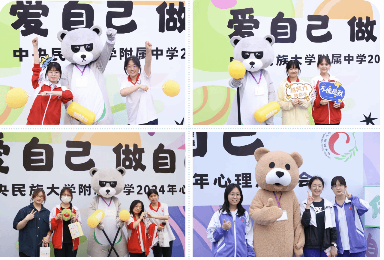 现场洋溢着积极欢乐的氛围,师生在彩虹拱门前体验被拥抱的温暖,驻足在往期“定格微笑”照片墙前回味与好友在一起的时刻,每一处布景和设置,都在引导师生关爱自己,悦纳自己。