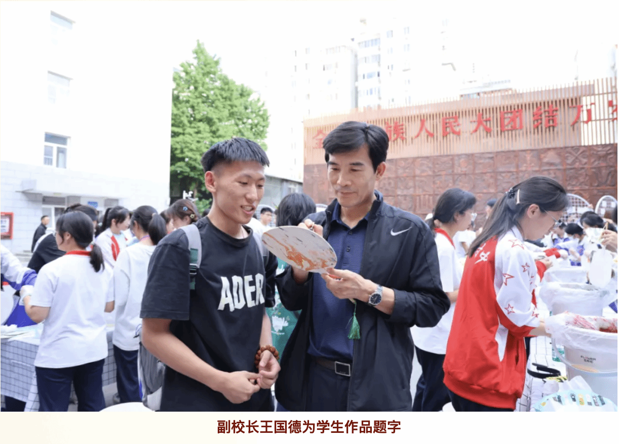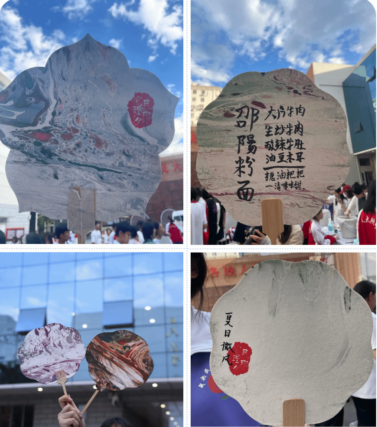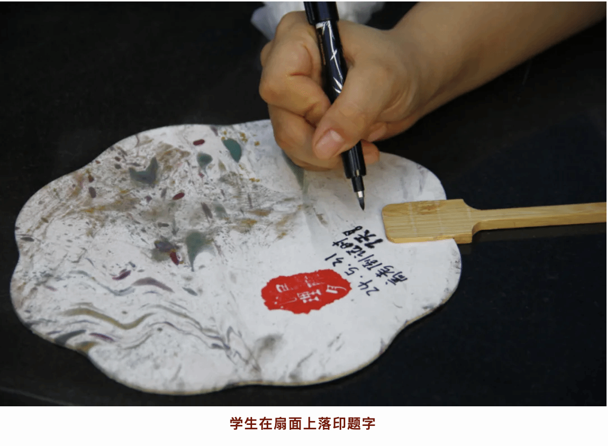 随性配色、飘然搅拌、缓缓入水、谨慎提起,转瞬间,扇面绚烂多彩,或写实山川湖泊,或抽象画中有话,可题字或落印,一幅独一无二的艺术品就此完成。在这个过程中,师生不仅展现了自己的审美与创意,也在每一次笔触与色彩的交融中,体验到了静心与减压的奇妙效果。