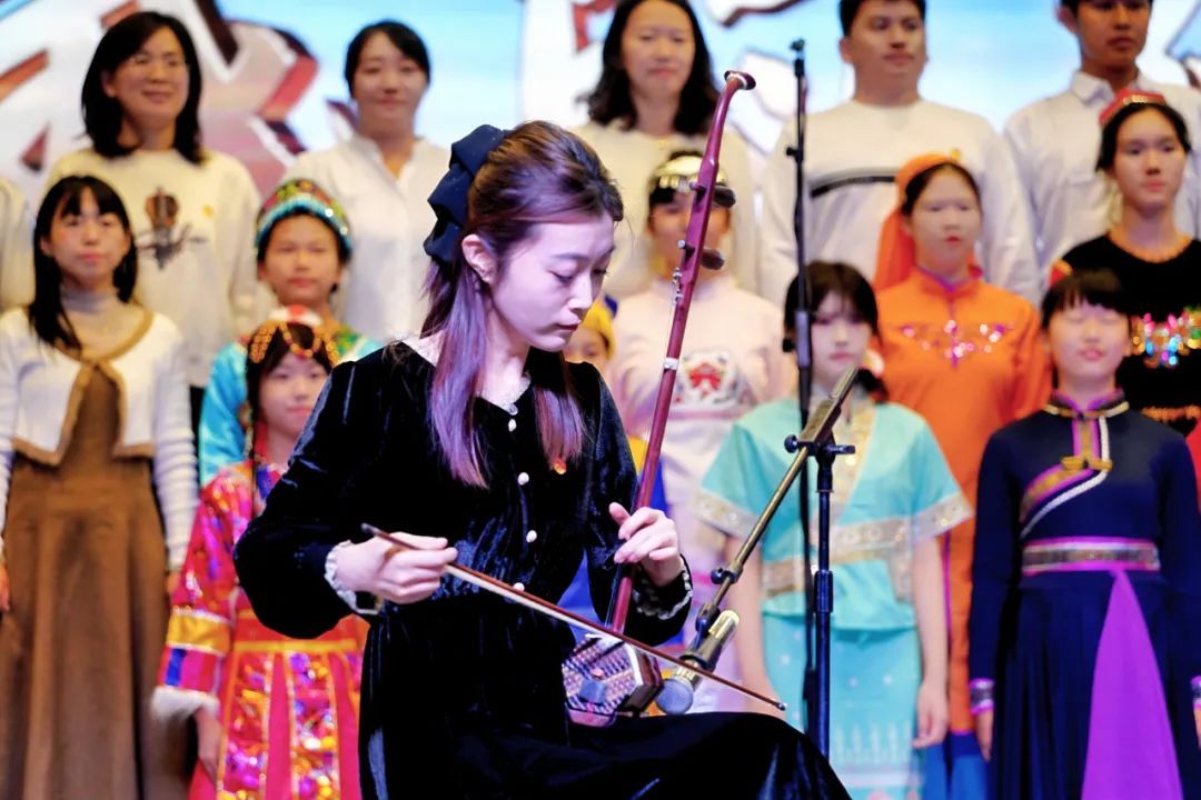 合唱展演在璀璨的灯光下热烈启幕,民附师生身着校服、正装与民族服饰,以饱满的热情和昂扬的姿态,齐声唱响《保卫黄河》,青春的歌声在民大礼堂中回荡,拉开了这场音乐盛宴的序幕。
