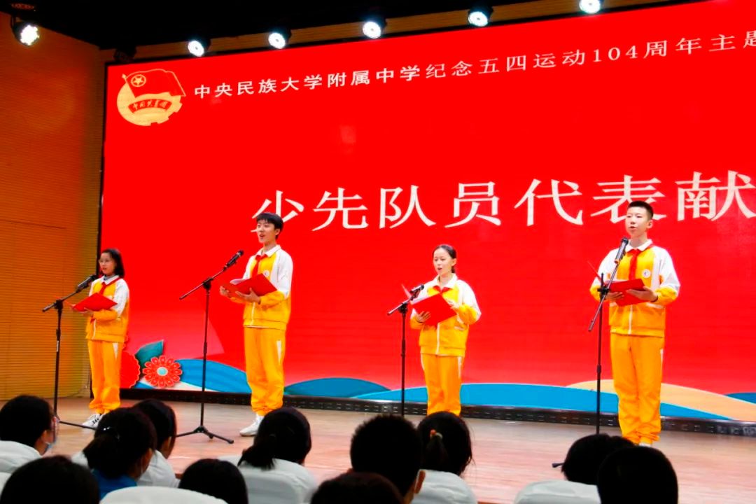 一抹抹鲜艳的红领巾在胸前闪耀,一句句铿锵的献词声声回荡!初一1班张铭轩、初一3班李思齐、初一4班汤佳宜、初一5班刘奕含同学代表民附少先队员献词。稚嫩的声音,坚定的誓言,抒发着对少先队的满腔热血,对共青团的无限向往,对共产党的崇高敬意,展示了新时代民附少先队员朝气蓬勃、昂扬向上的精神风貌,深深感染了现场师生。