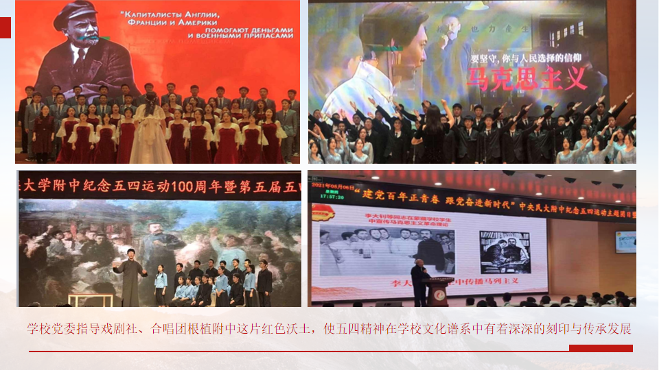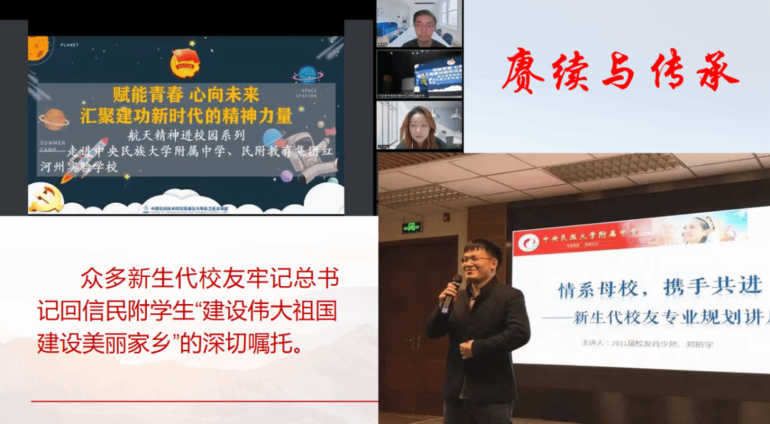 历经一代代人传承、发扬与积淀,五四精神早已成为百年来民附人与国家前途命运同频共振的鲜明标识。近年来,附中党委加强政治引领,指导学生处团委、校友会以铸牢中华民族共同体意识为主线,组织开展了一系列缅怀先烈,传承五四精神,厚植家国情怀的教育活动,也彰显着附中党组织用极大力量做好青年工作,确保党的事业薪火相传,确保中华民族永续发展的信心决心。