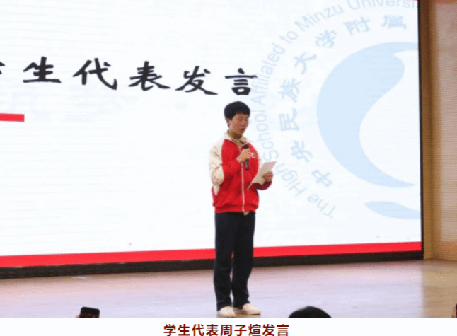 学生代表周子煊发言。他结合自己的实际经验分享了学习方法,他强调必须要在课堂上认真听讲,要高质量完成老师布置的作业,制订合适的考试策略,考前切忌紧张,要调整好心态。