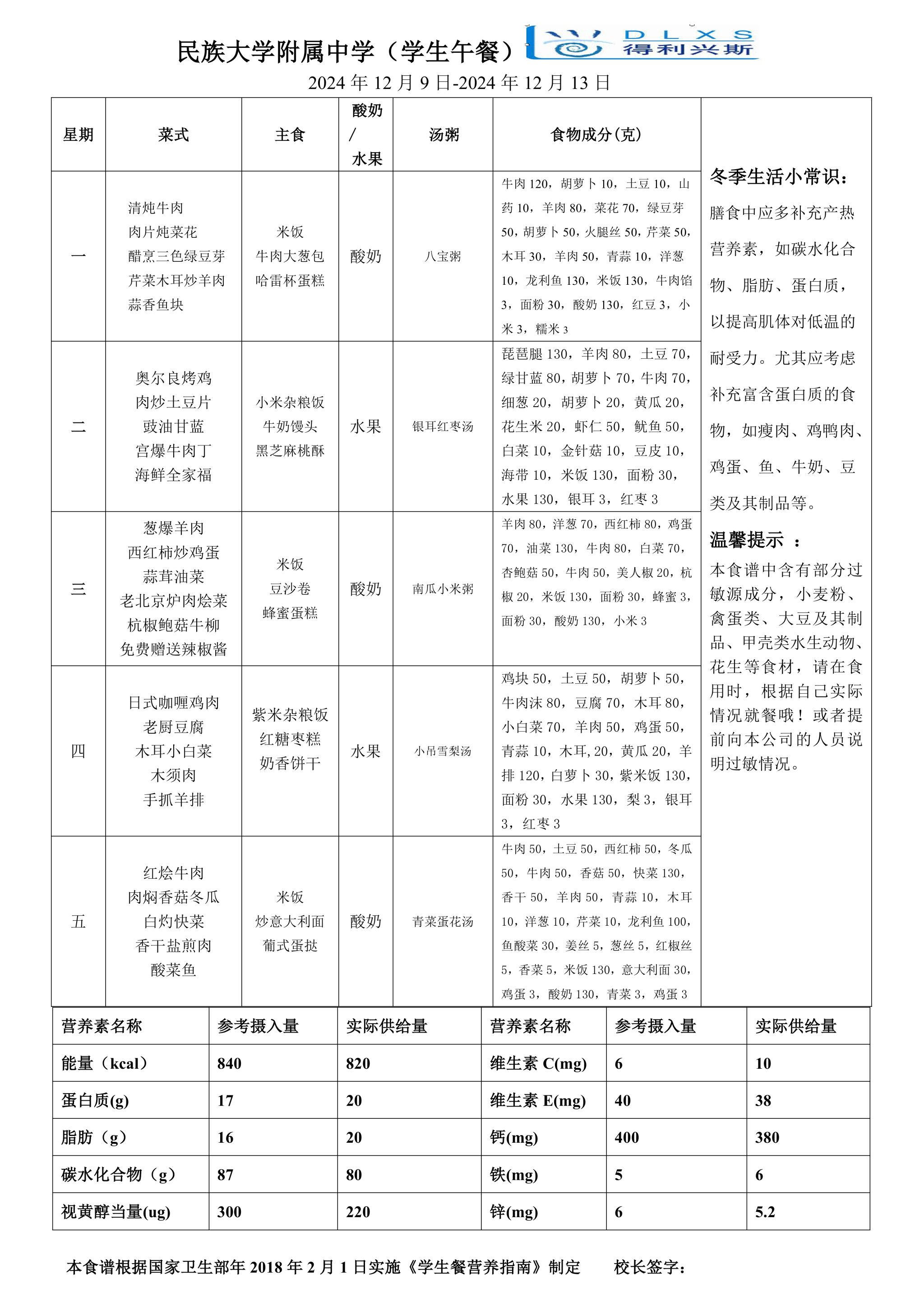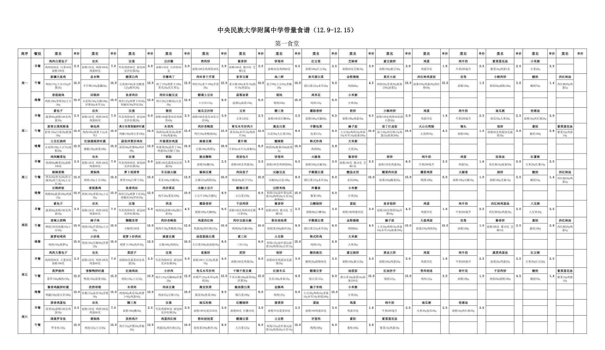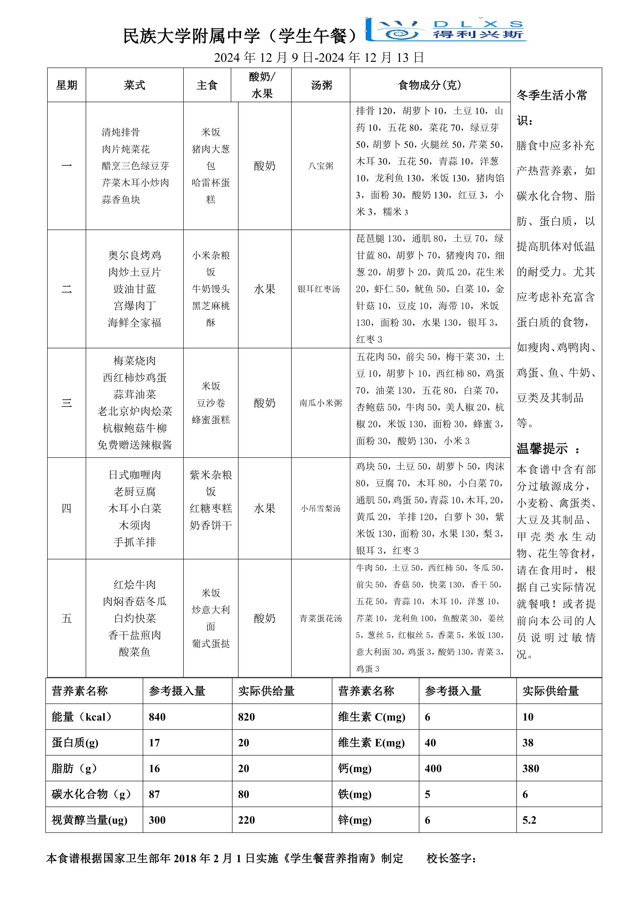 2024年春季学期海淀校区食堂菜谱(2024.12.09-12.15)