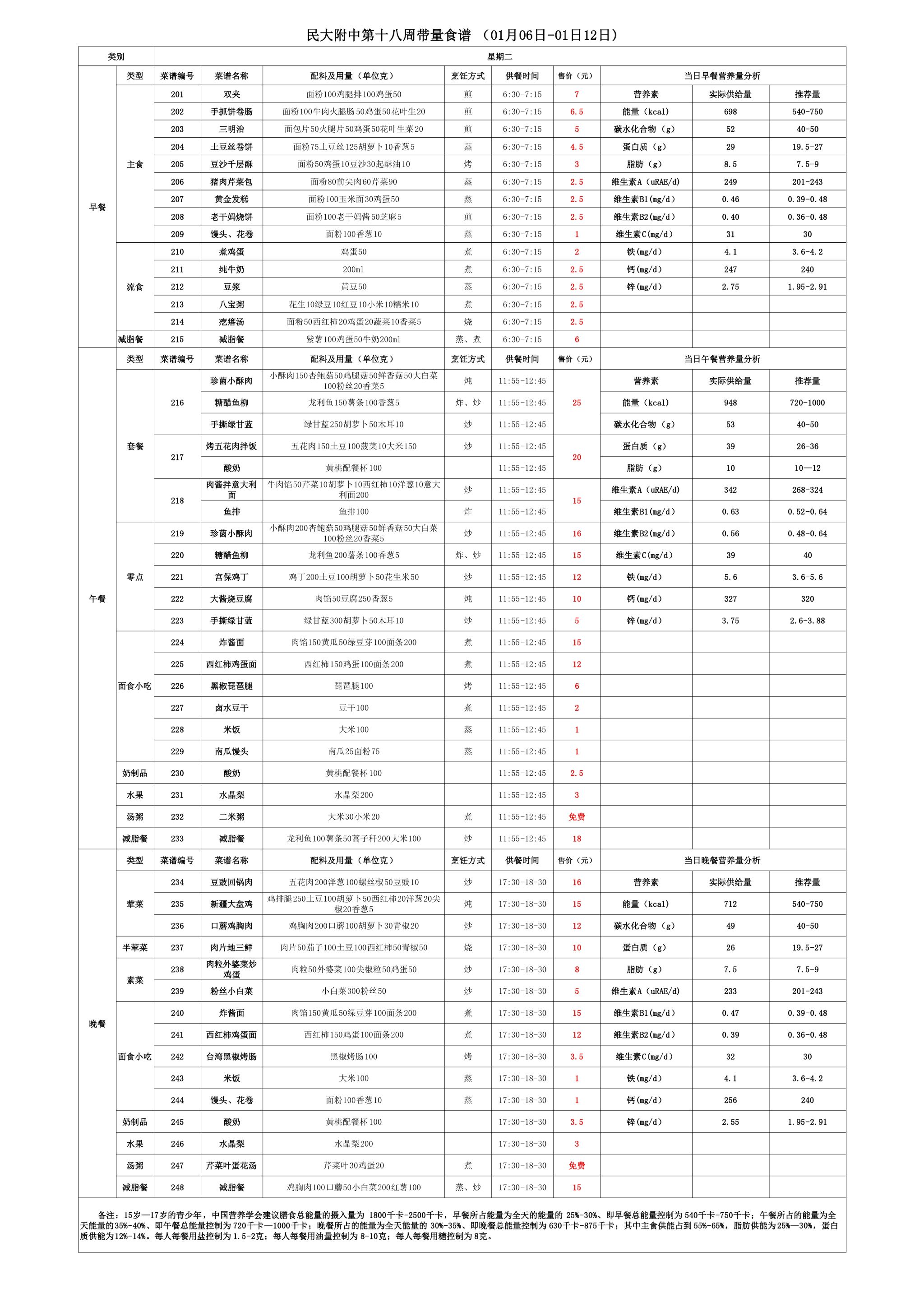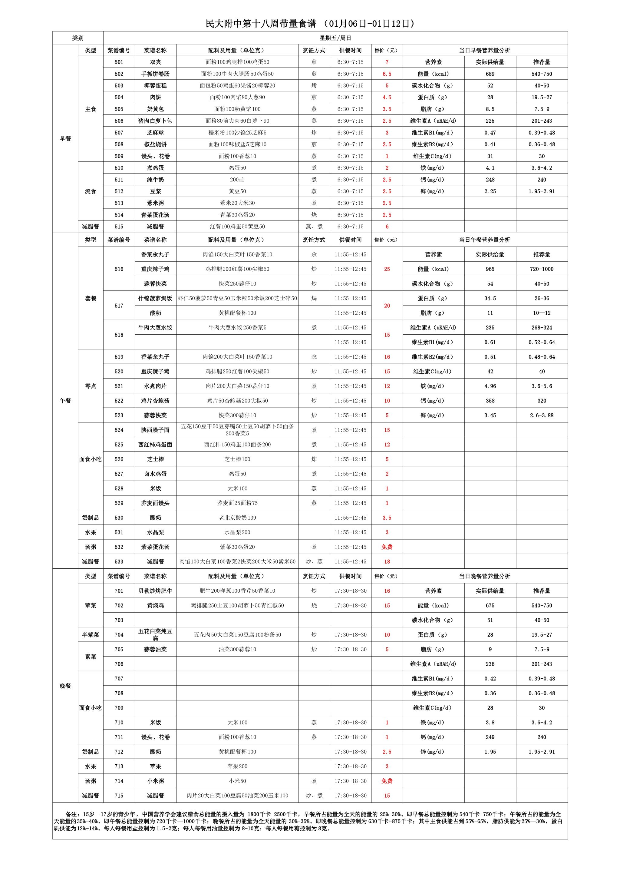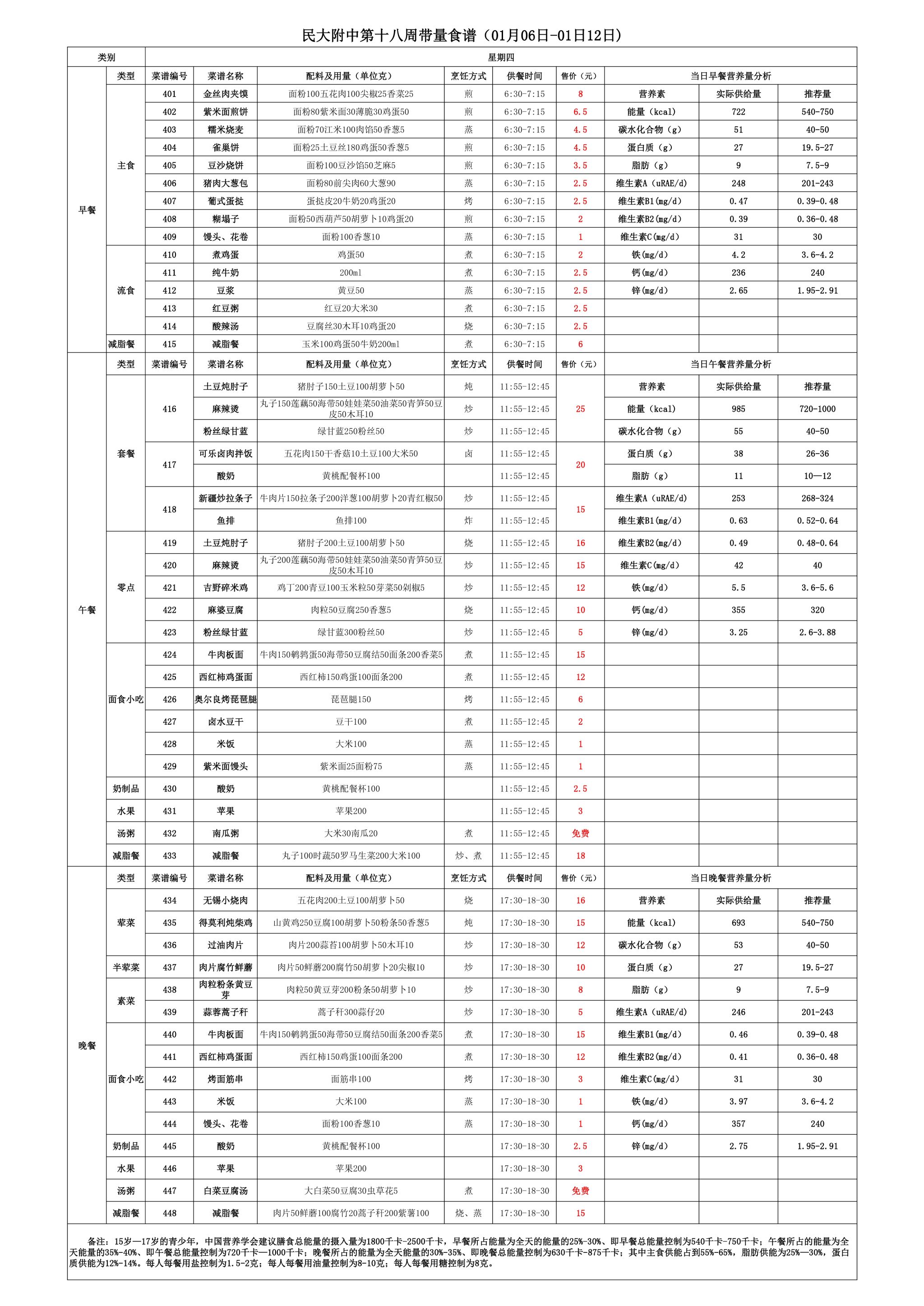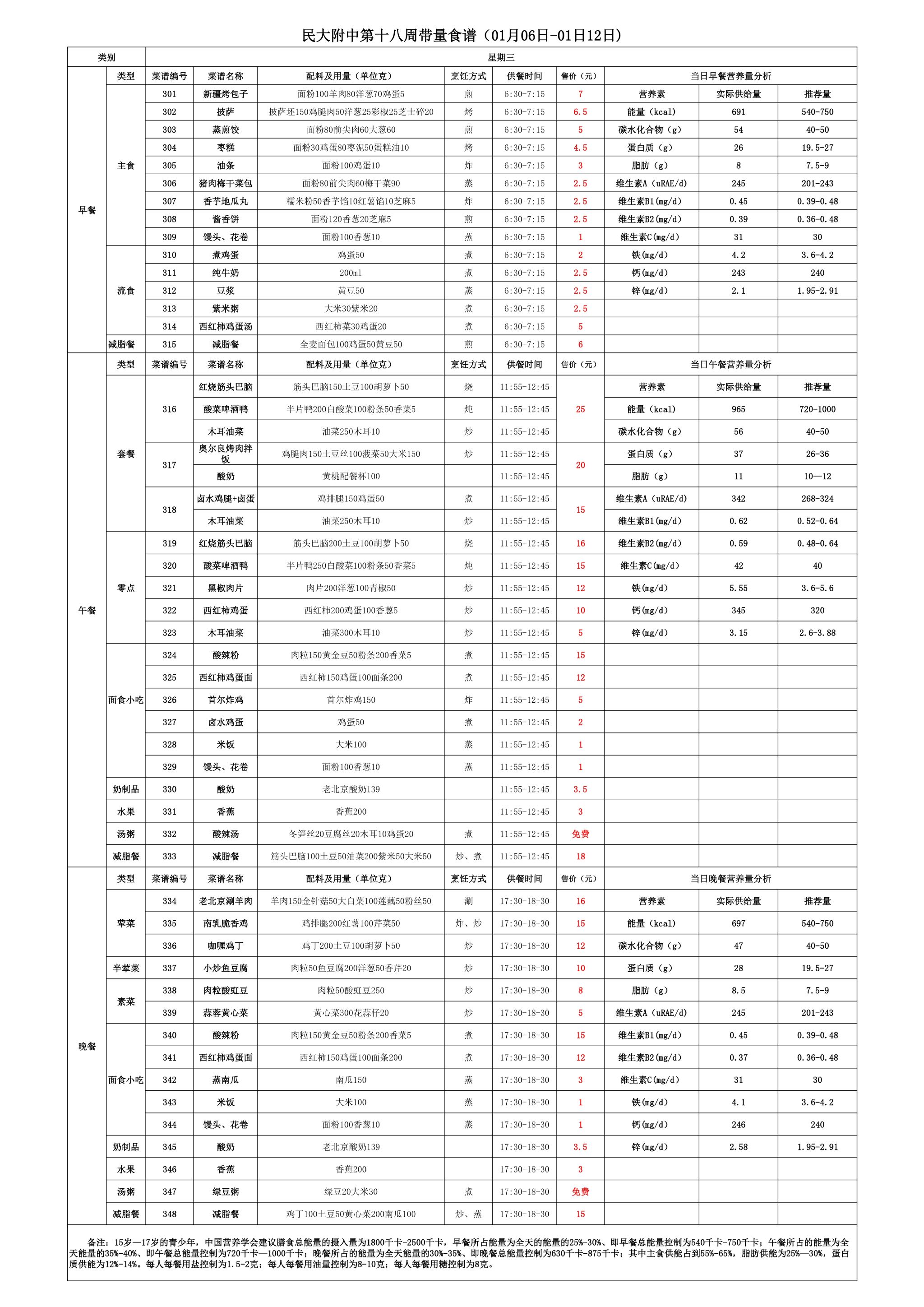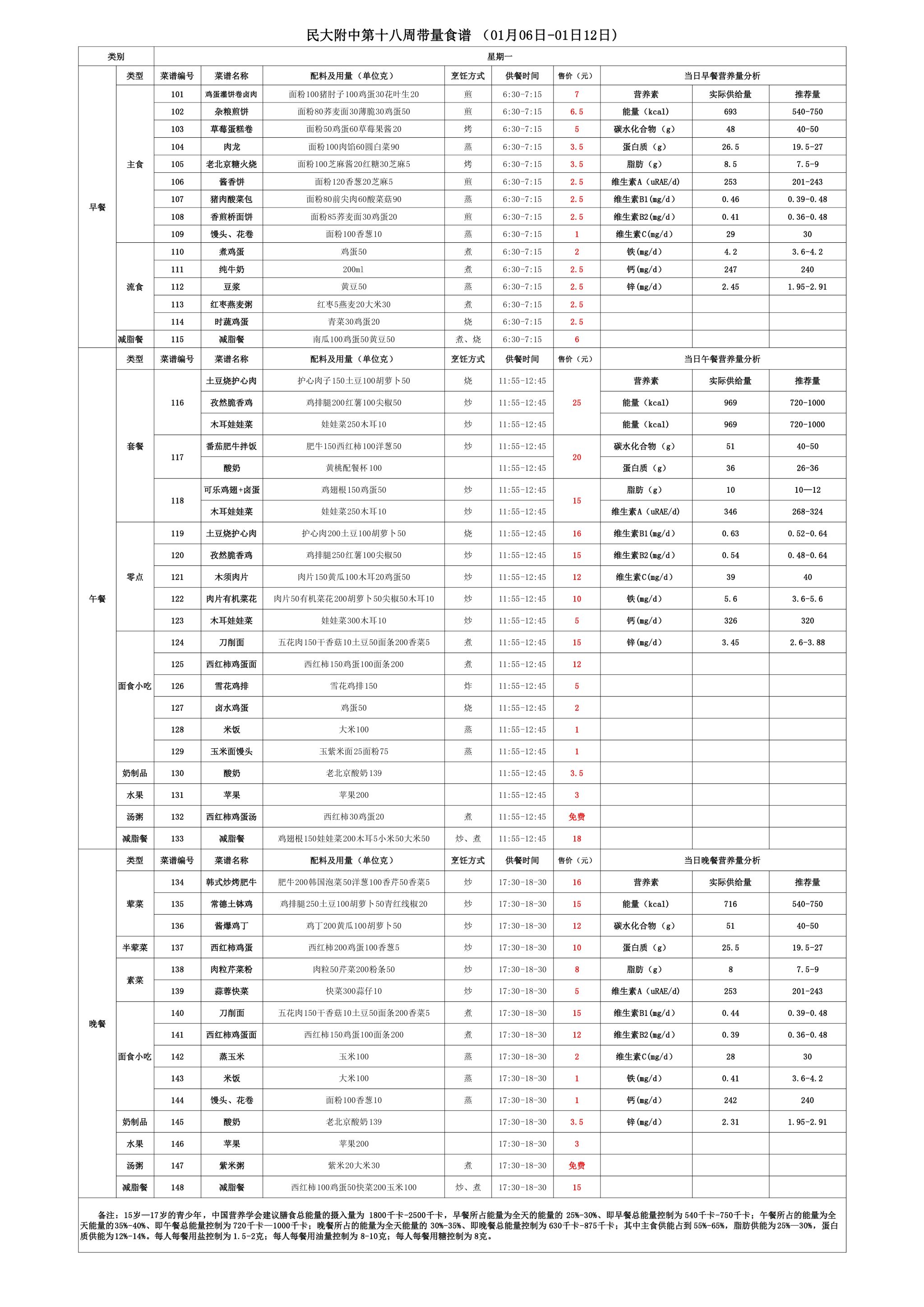 2024年秋季学期朝阳校区食堂菜谱(2024.01.06-2025.1.12)