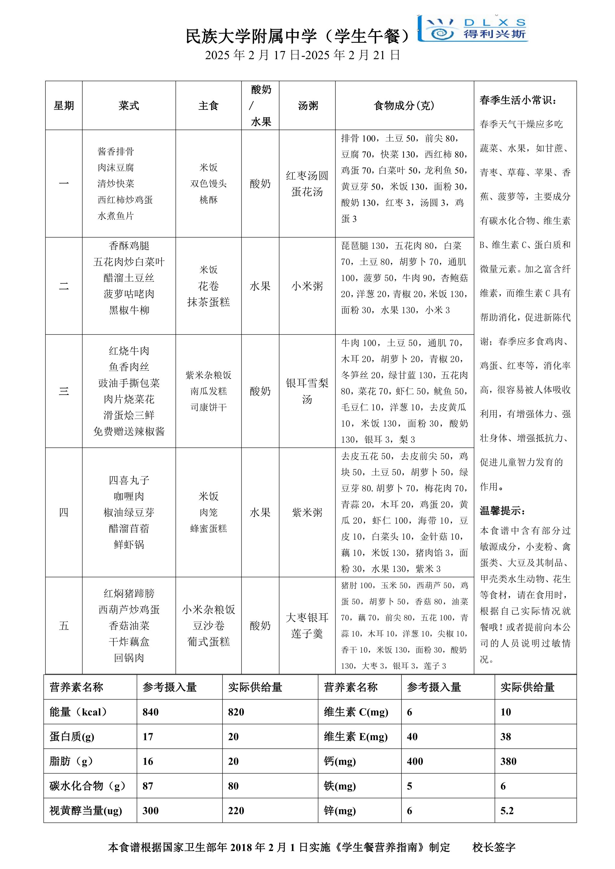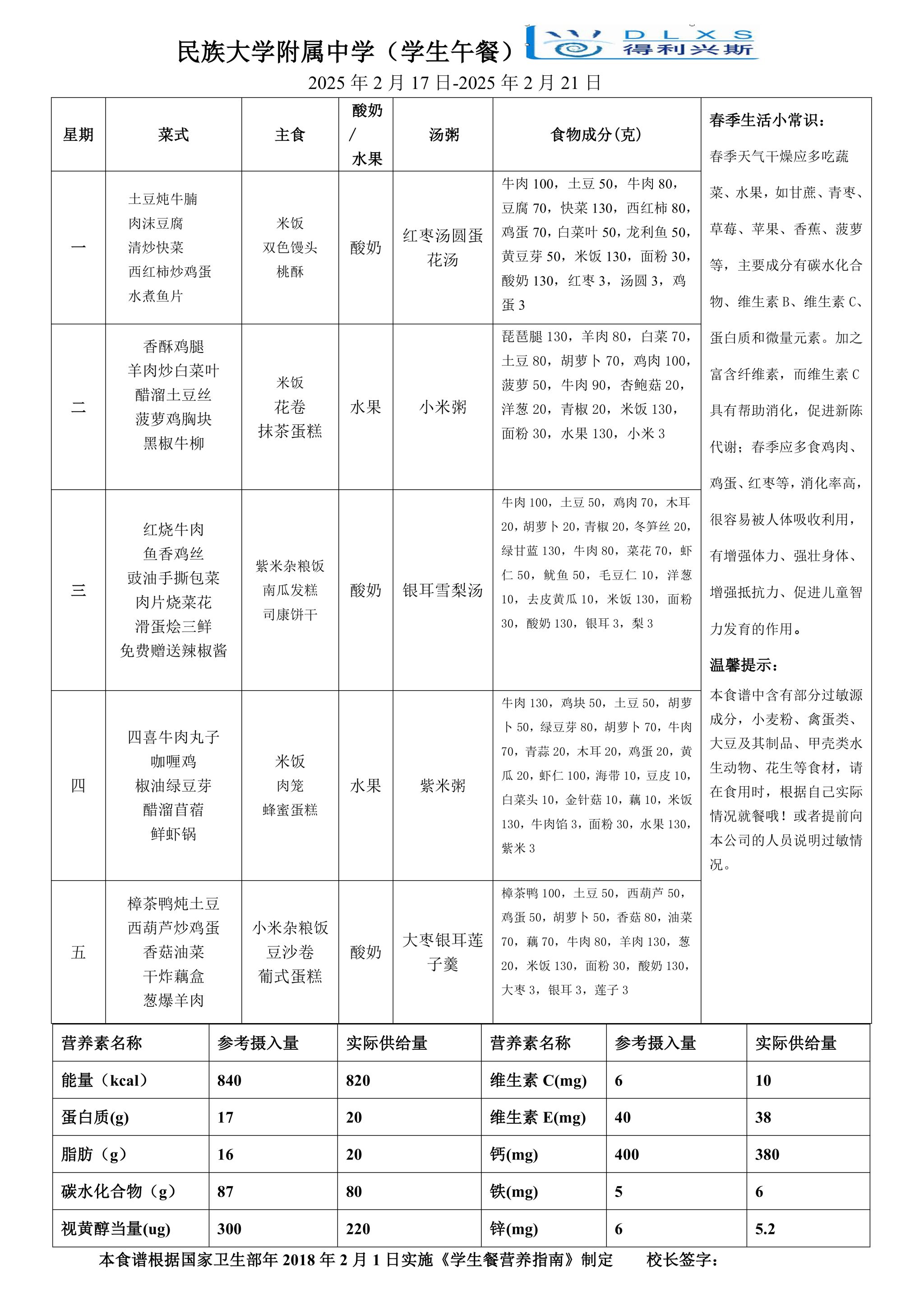 2025年春季学期民大附中初中部食谱(2025.02.17-2025.02.21)