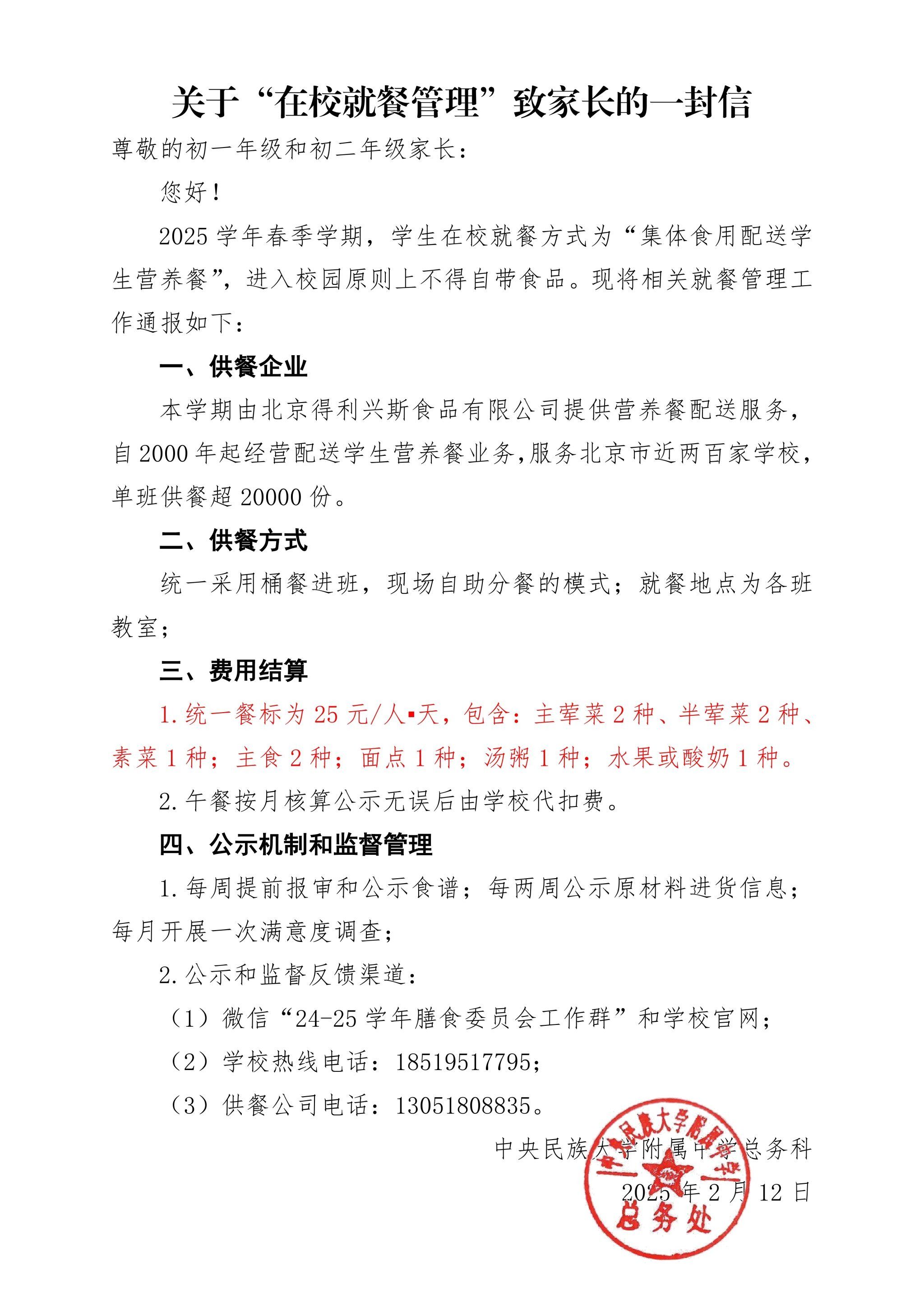 关于“在校就餐管理”致家长一封信(初中部)