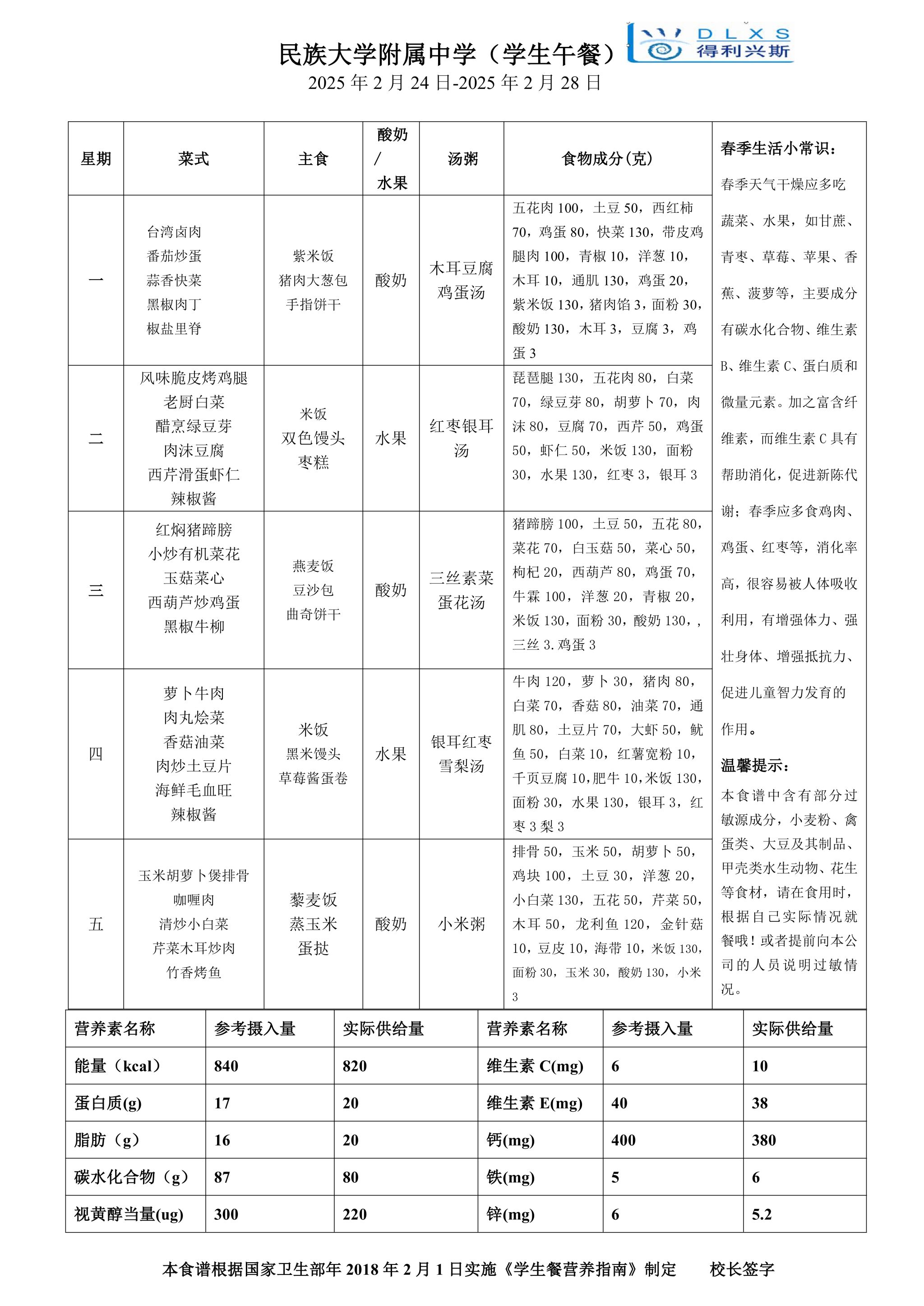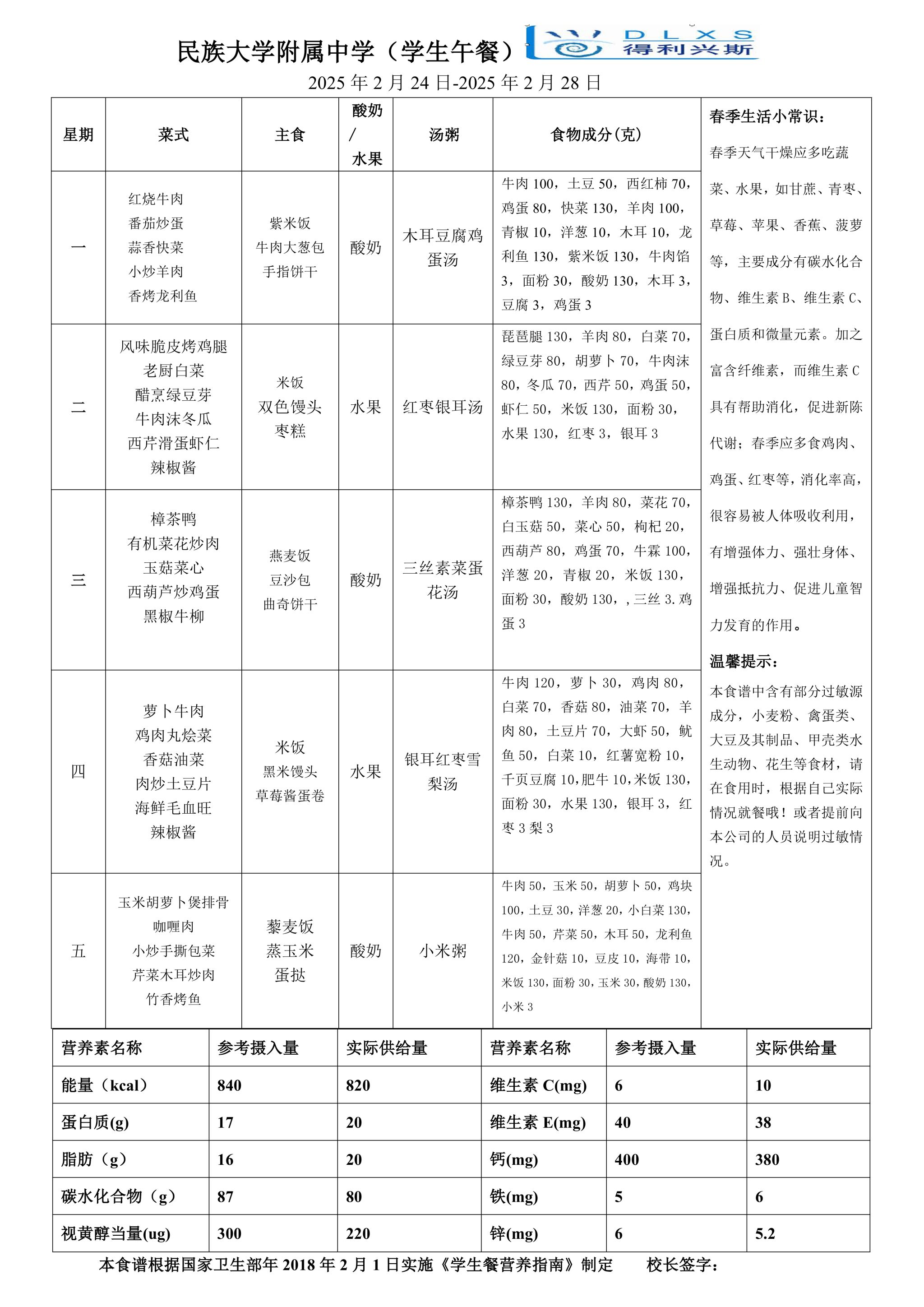 2025年春季学期海淀校区初中部外送餐菜谱(2025.02.24-02.28)