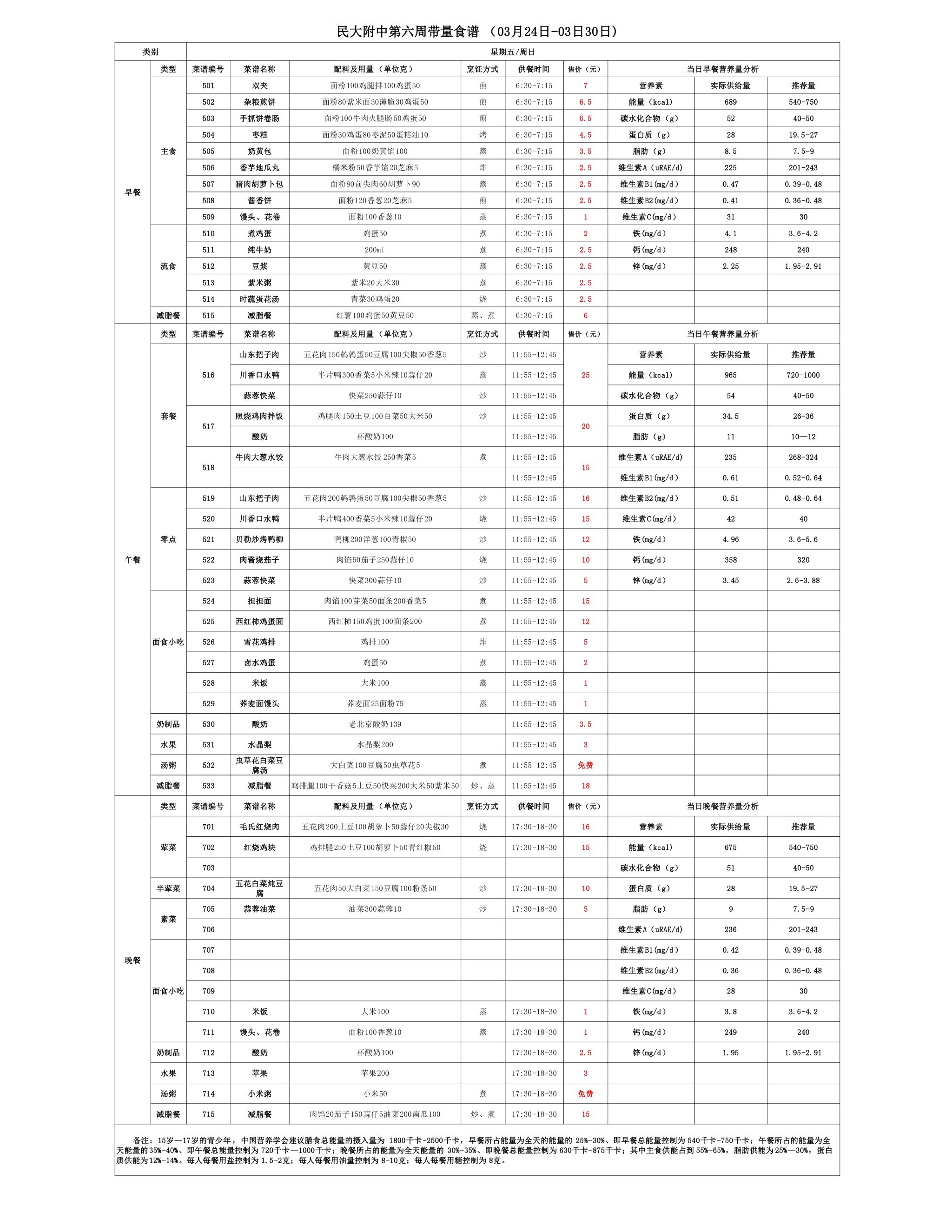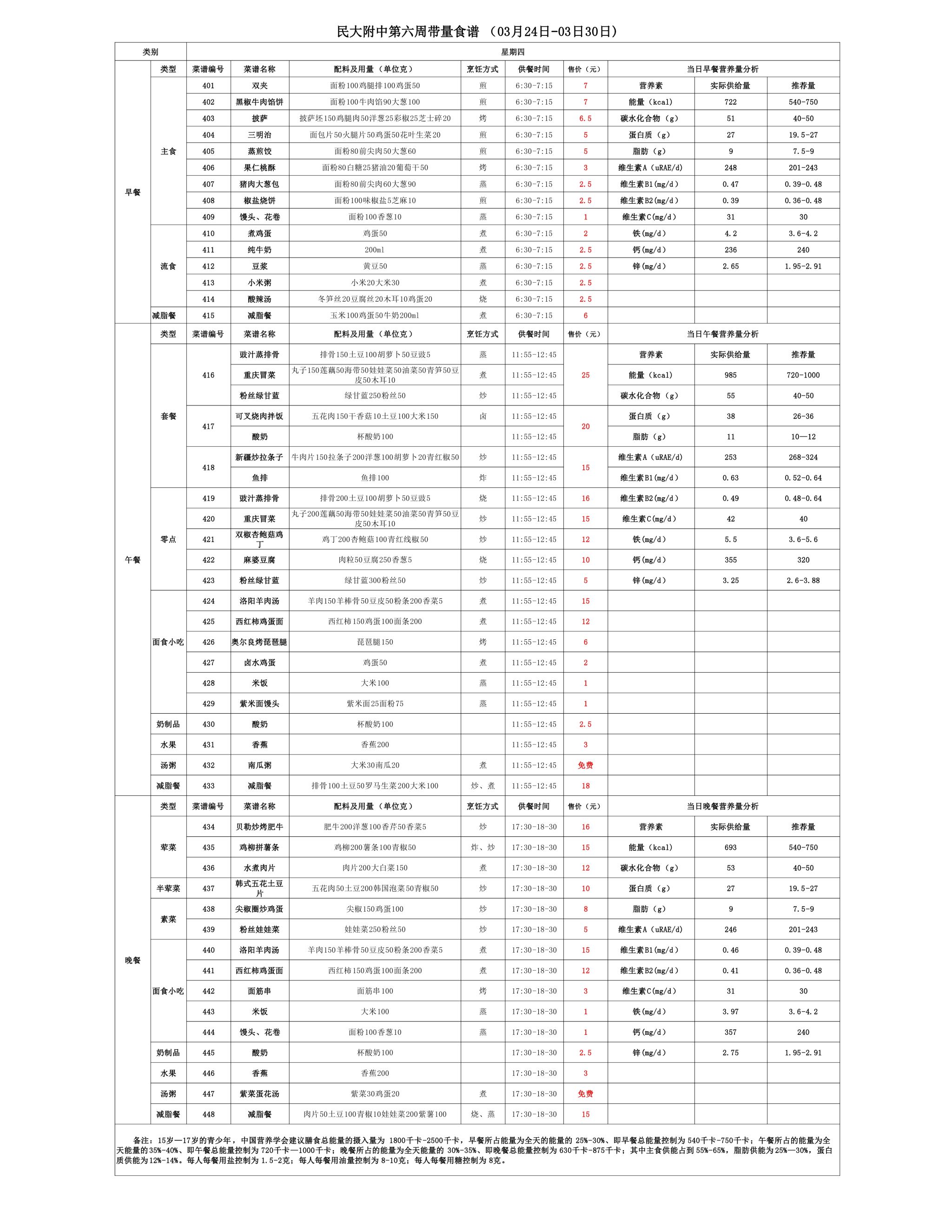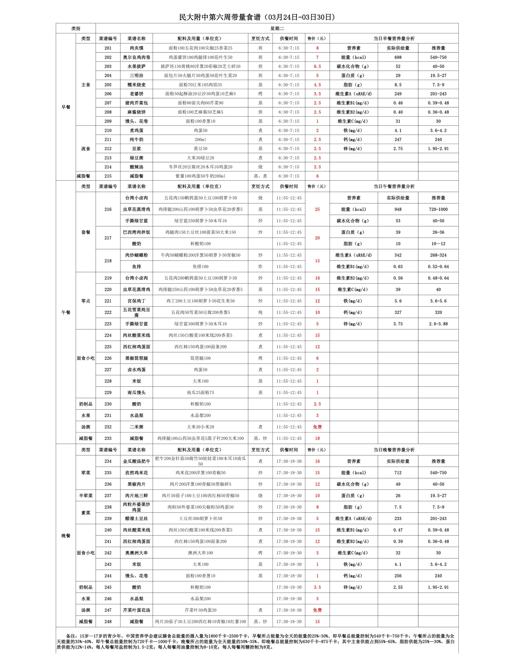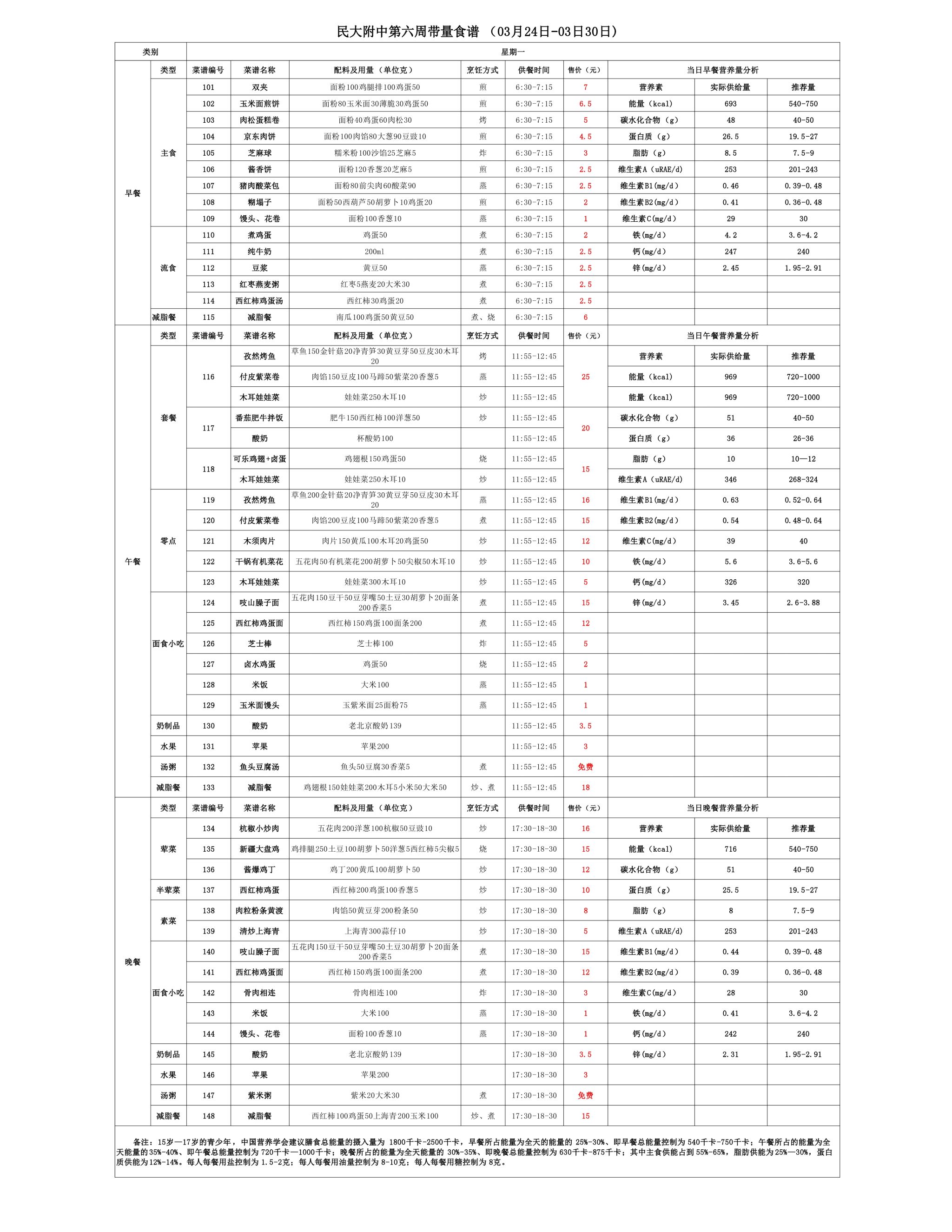2025年春季学期朝阳校区食堂菜谱(2025.03.24 - 03.30)
