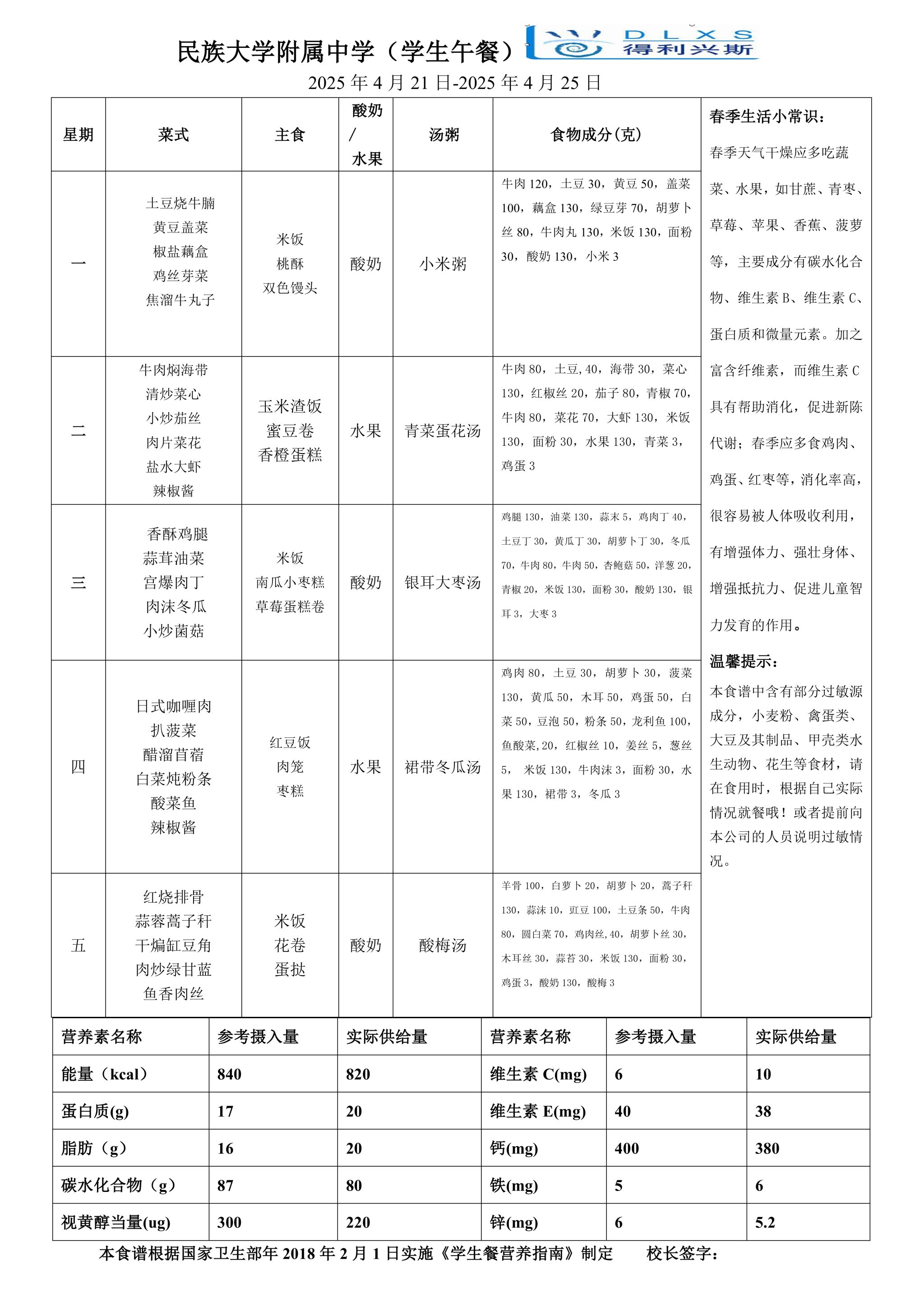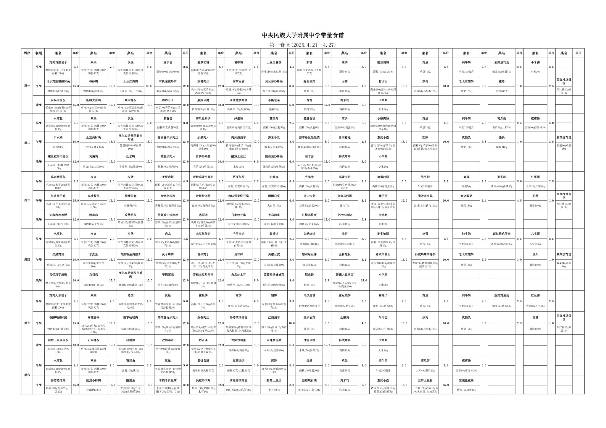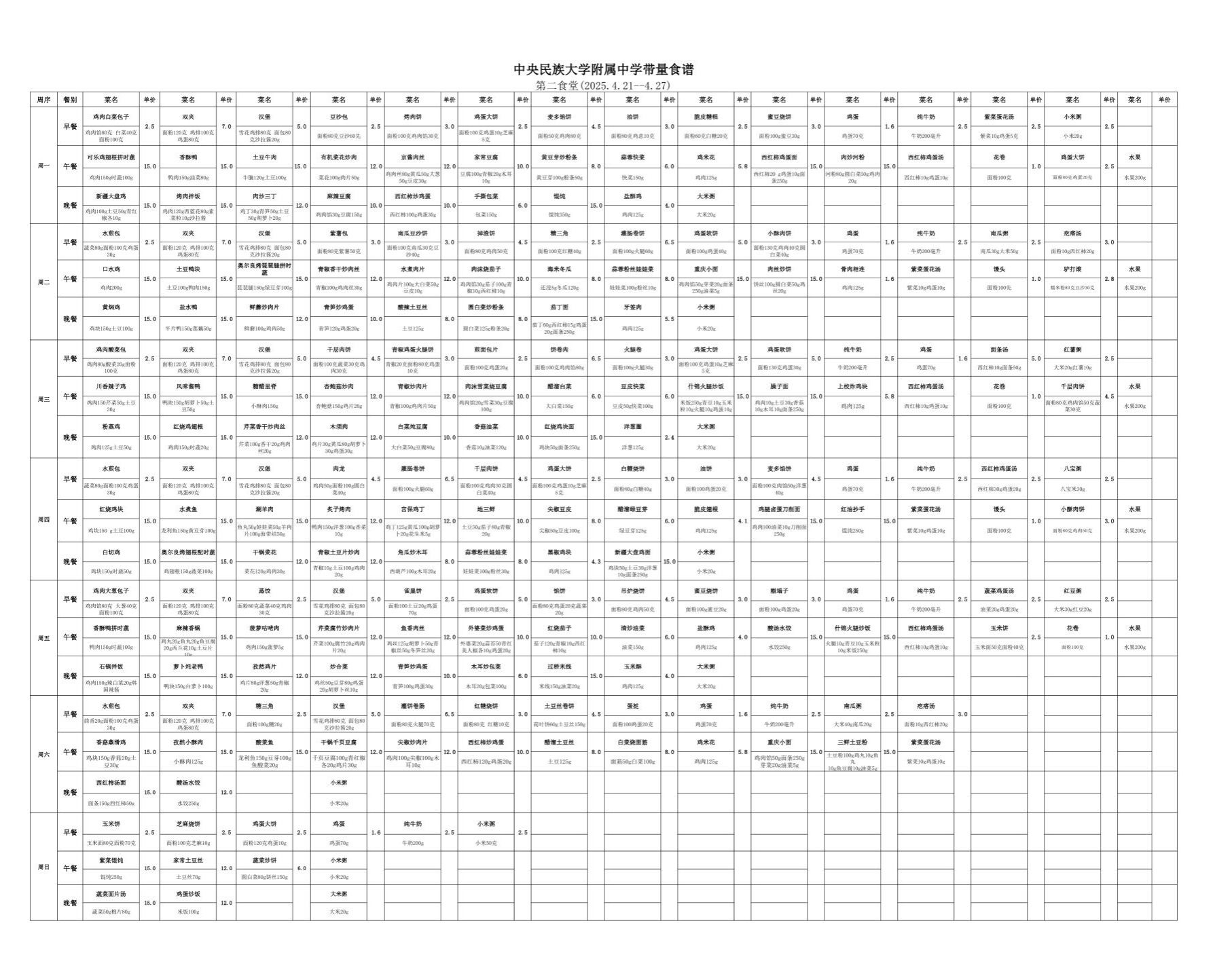 2025年春季学期海淀校区食堂菜谱(2025.04.21-04.27)
