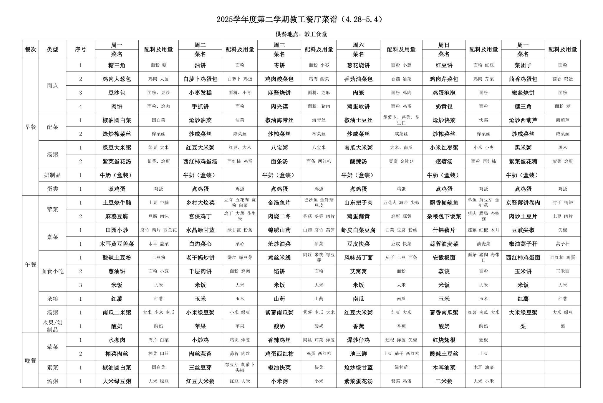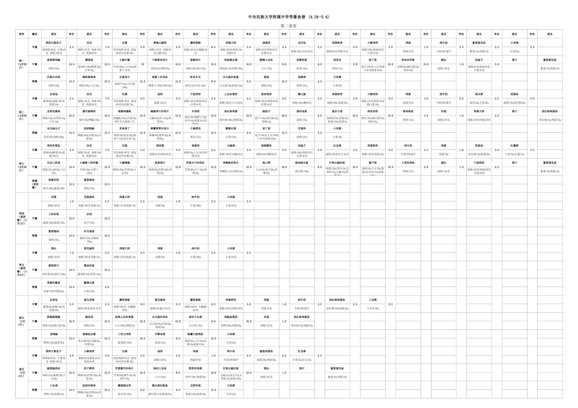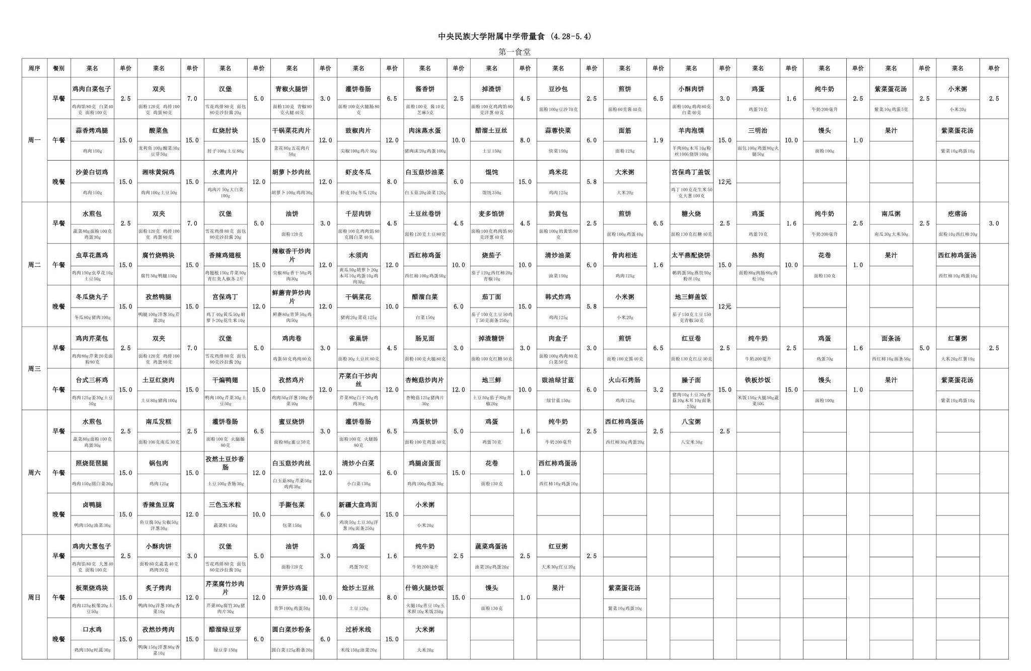 2025年春季学期海淀校区食堂菜谱(2025.04.28-05.04)