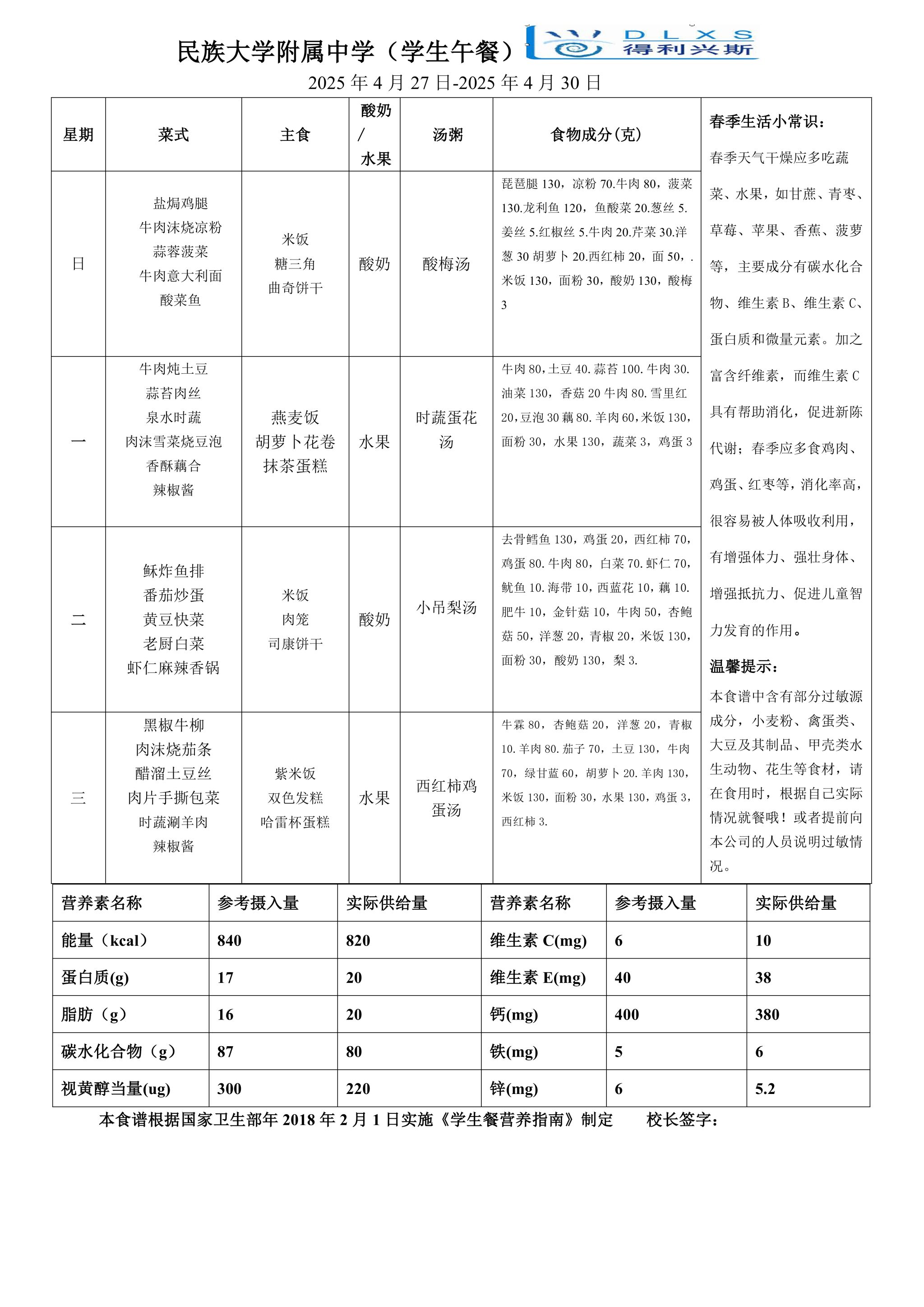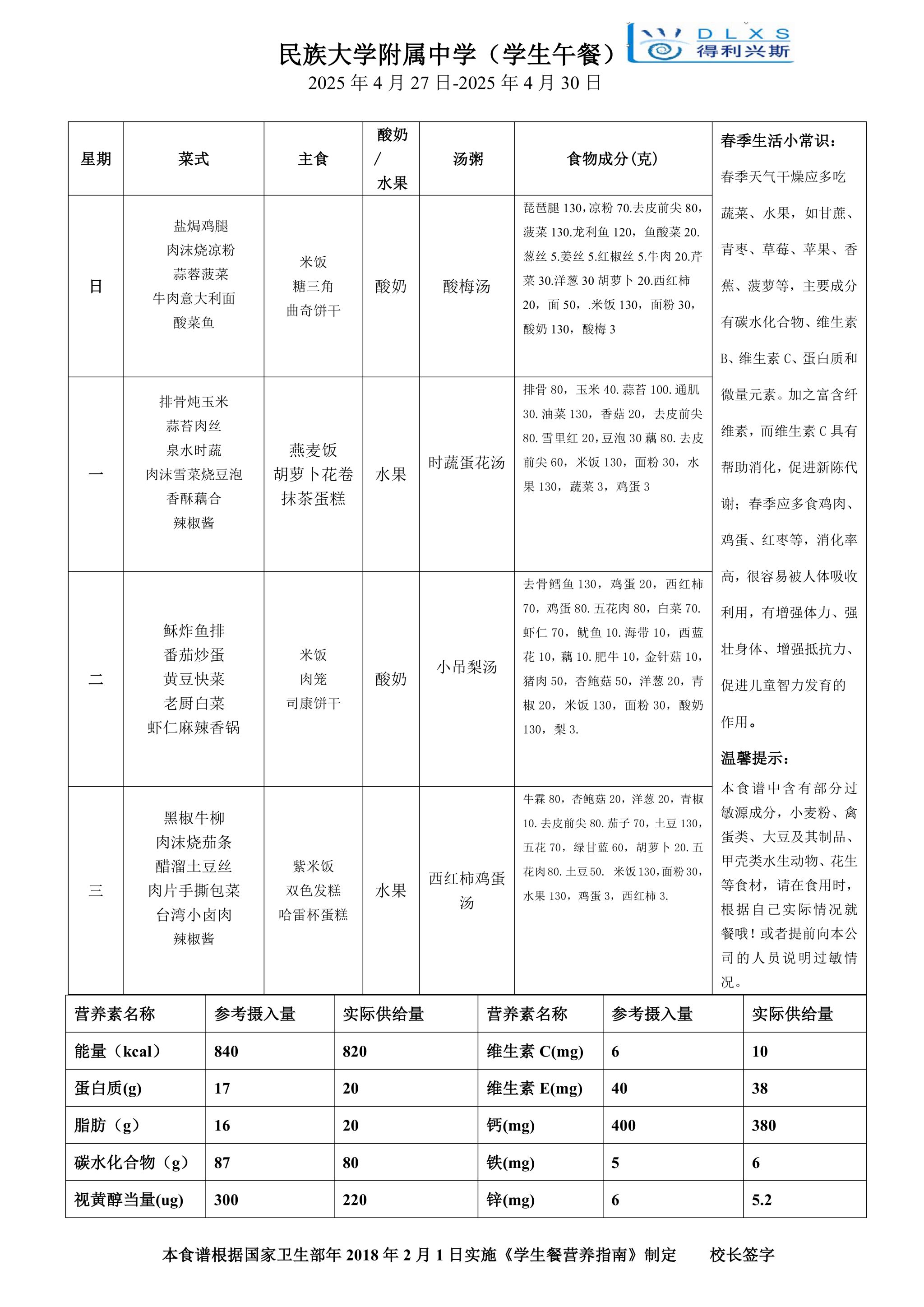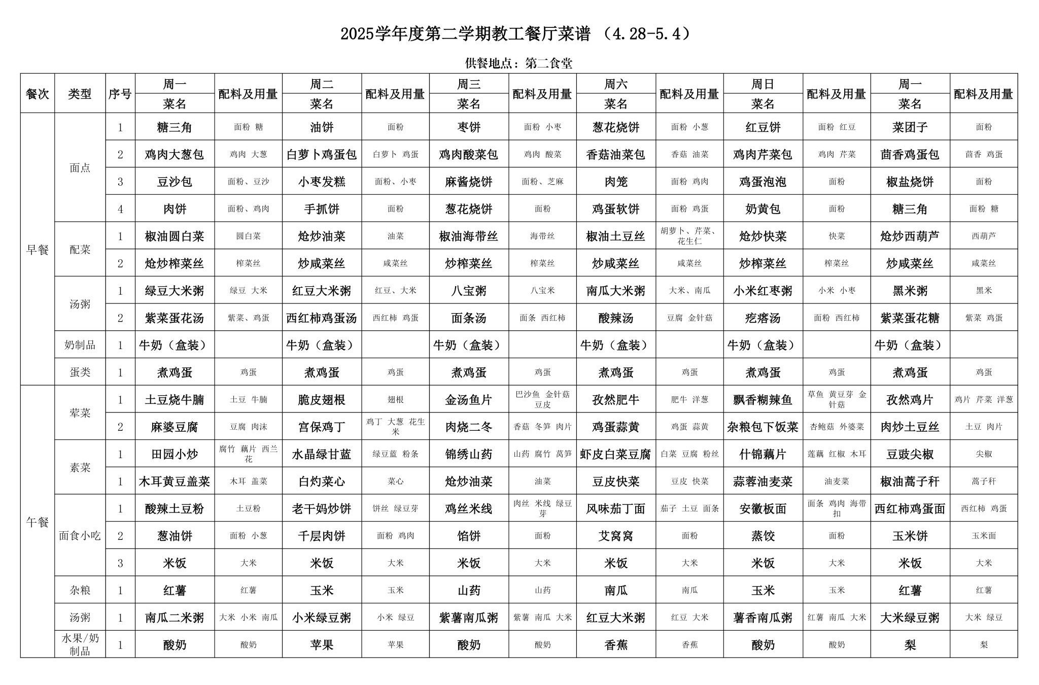 2025年春季学期海淀校区食堂菜谱(2025.04.28-05.04)
