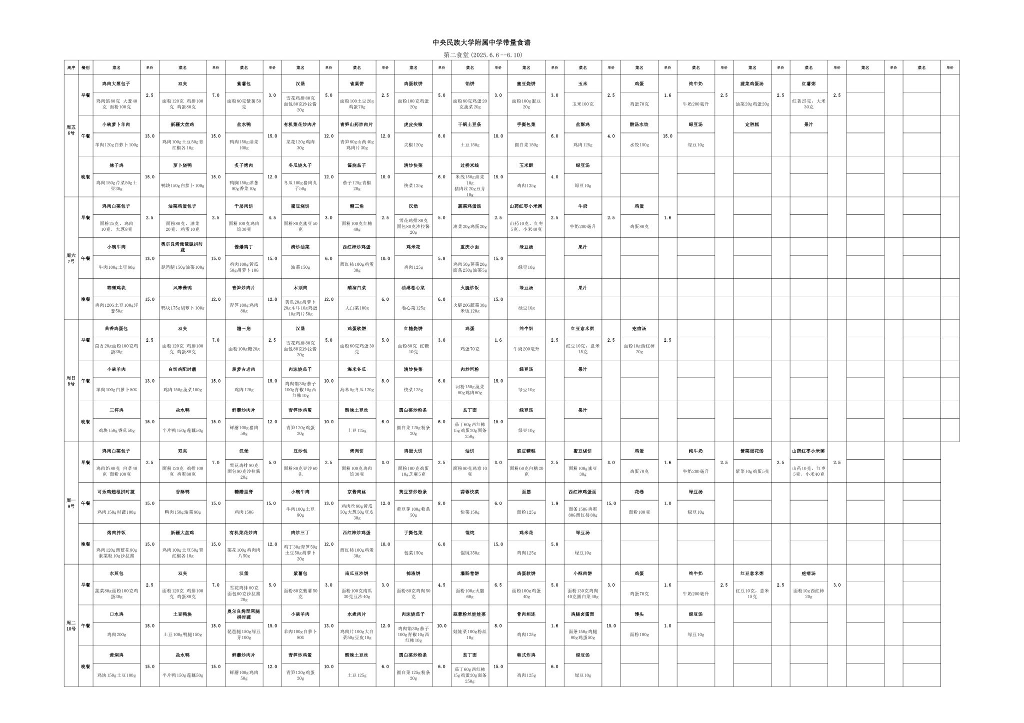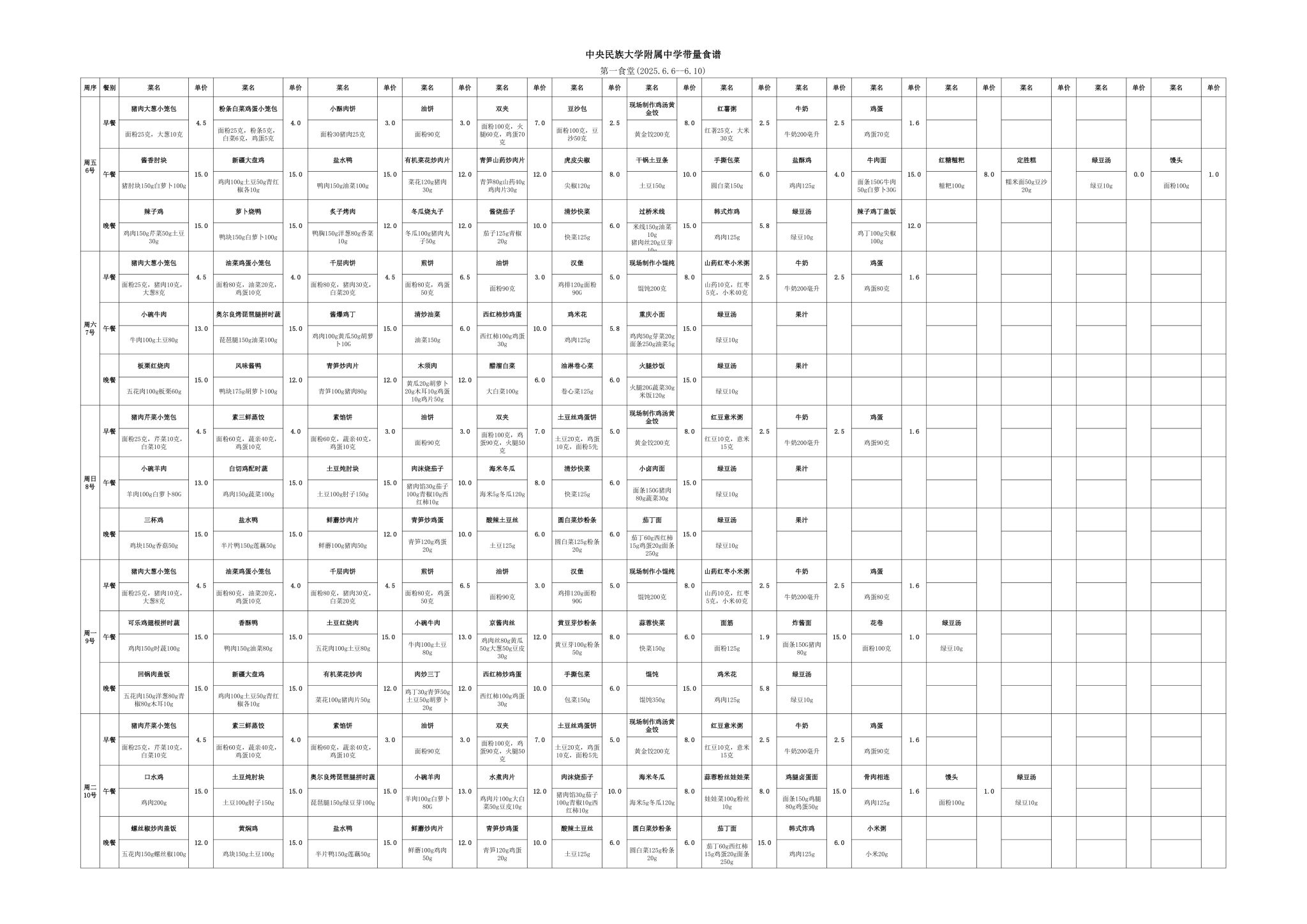 2025年春季学期海淀校区食堂菜谱(2025.6.6-6.10)