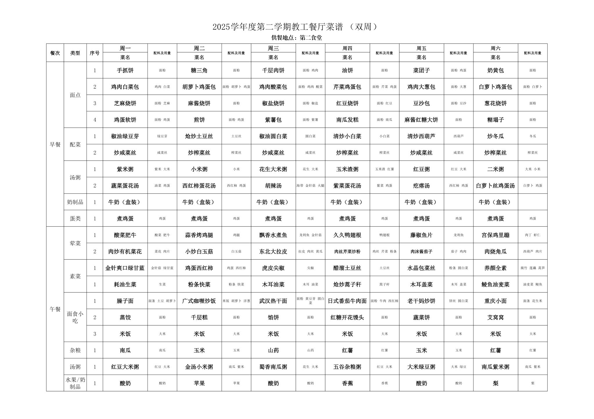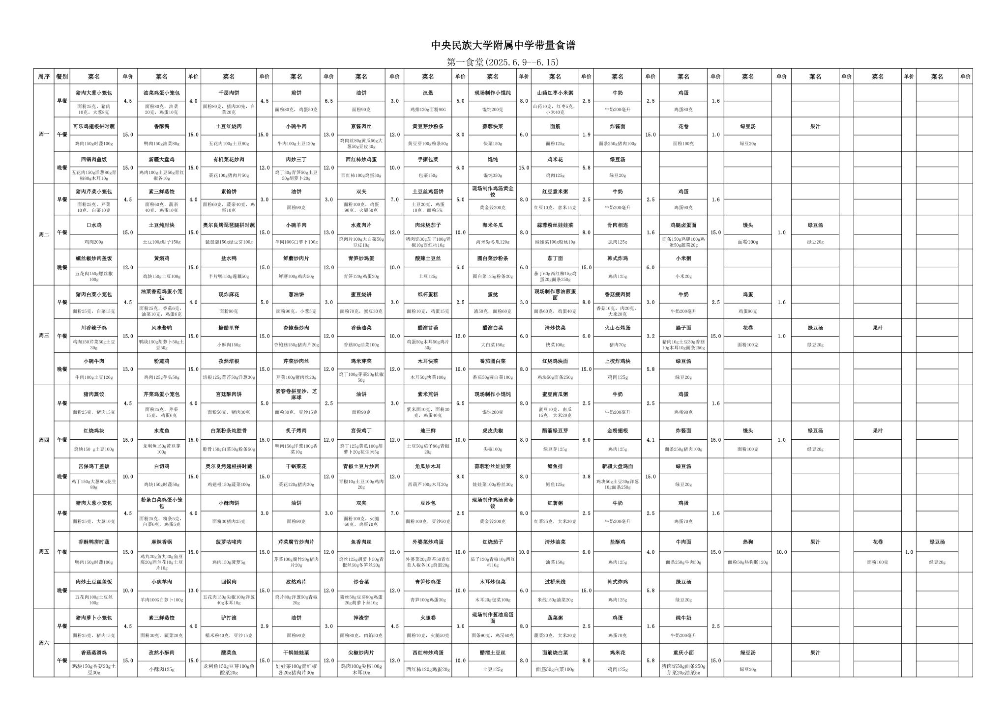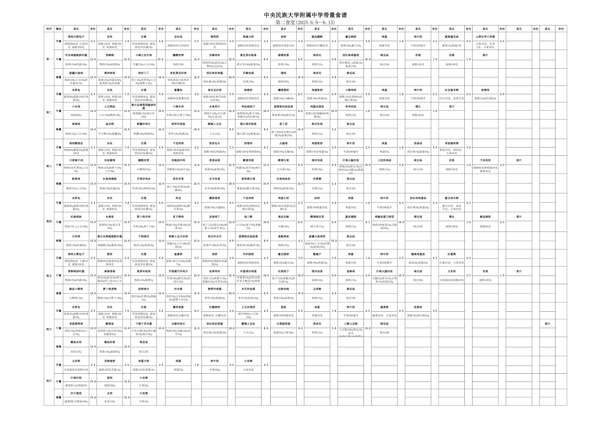 2025年春季学期海淀校区食堂菜谱(2025.06.09-06.15)