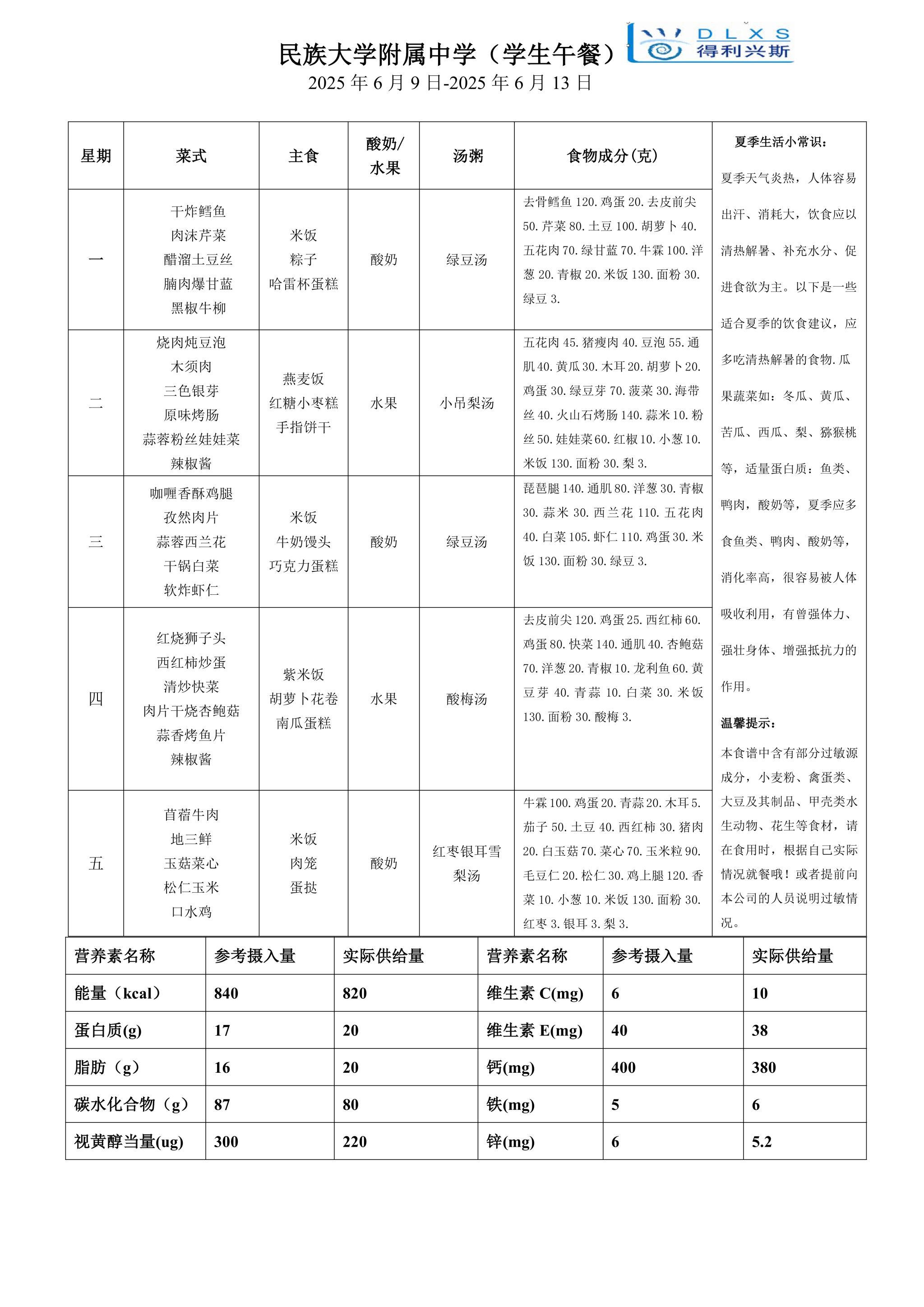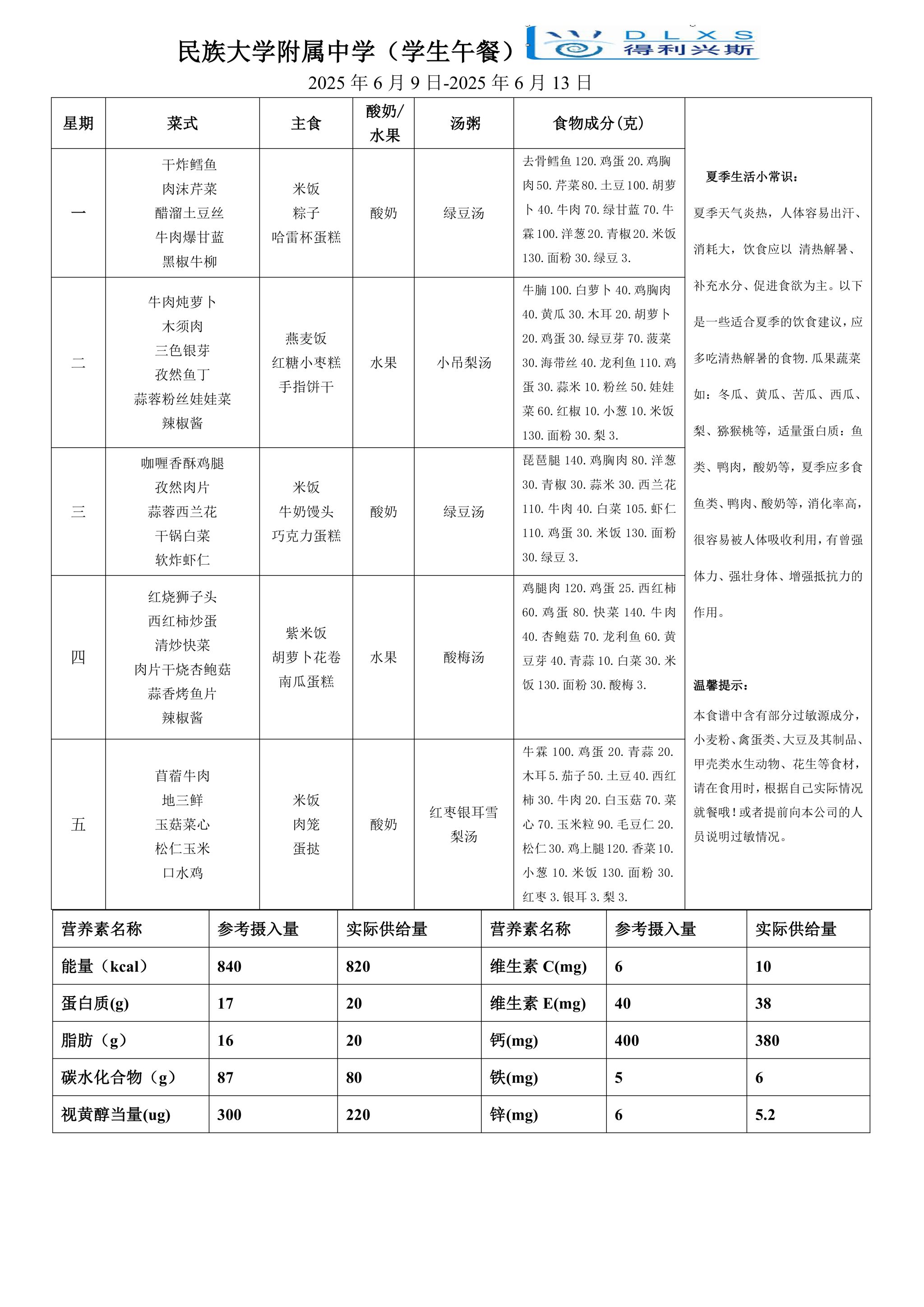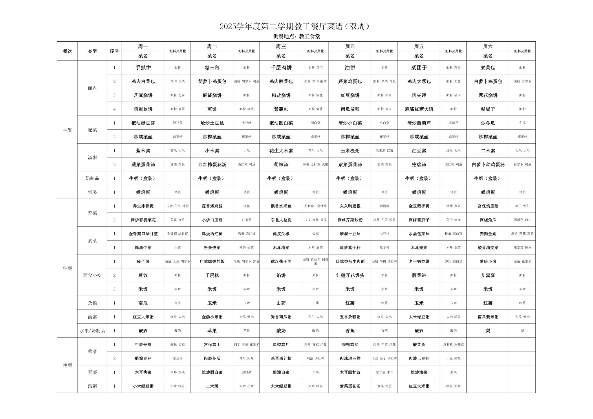 2025年春季学期海淀校区食堂菜谱(2025.06.09-06.15)