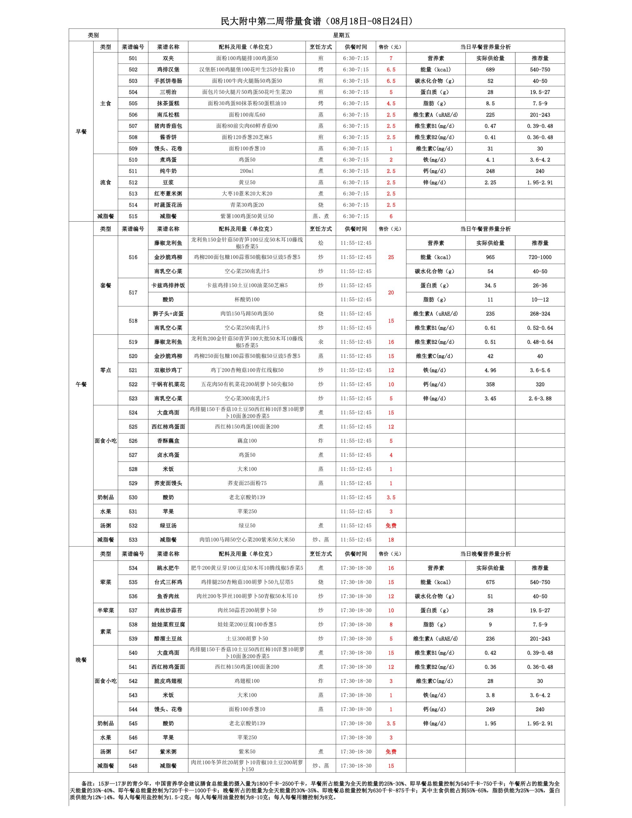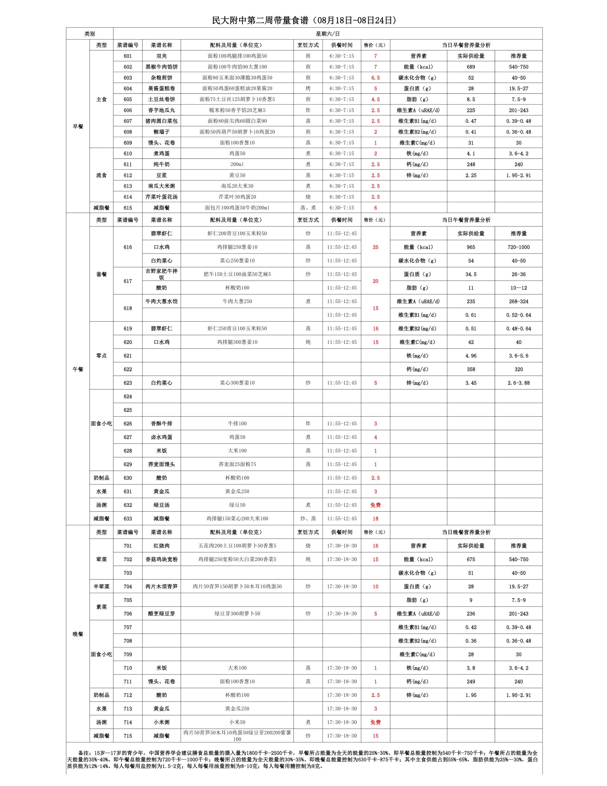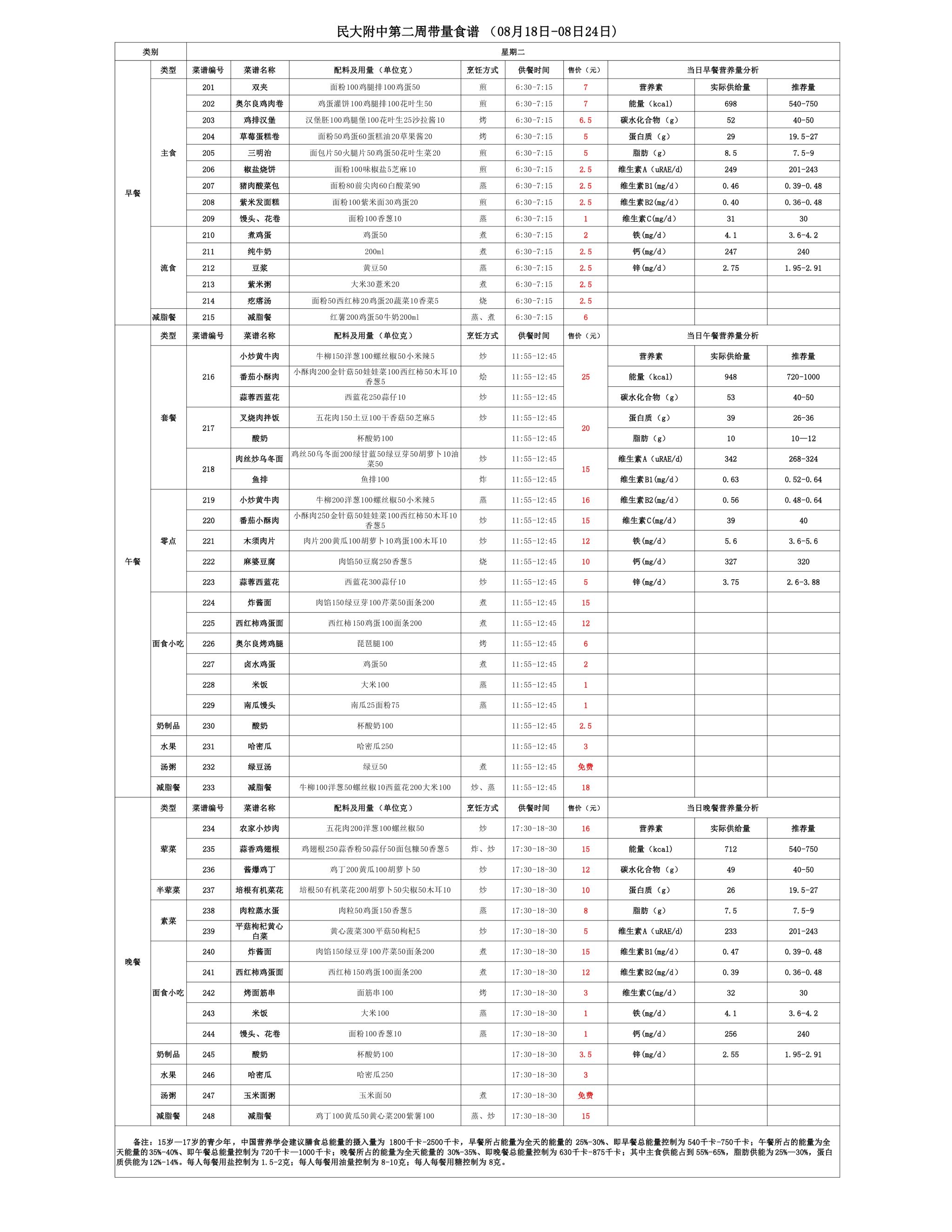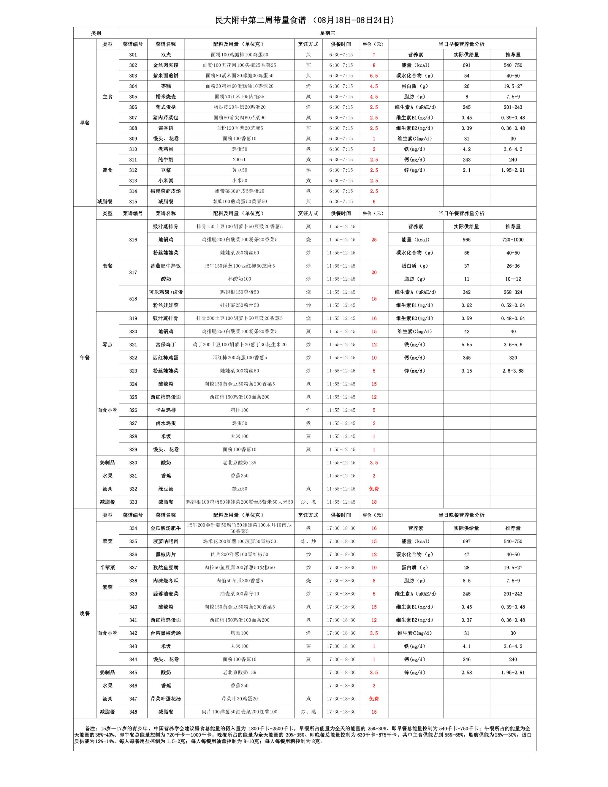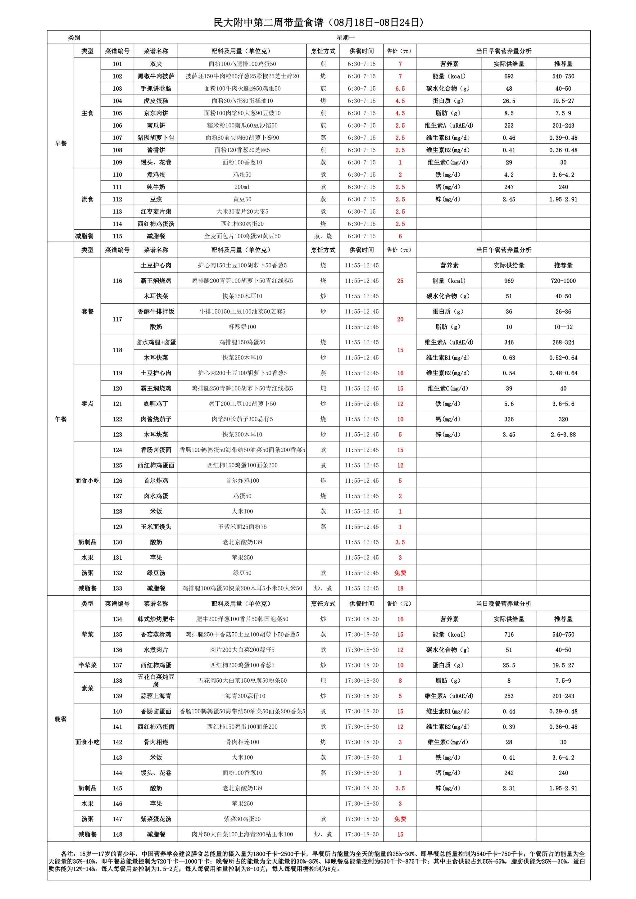 2025年夏季学期朝阳校区食堂菜谱(2025.08.18-08.24)