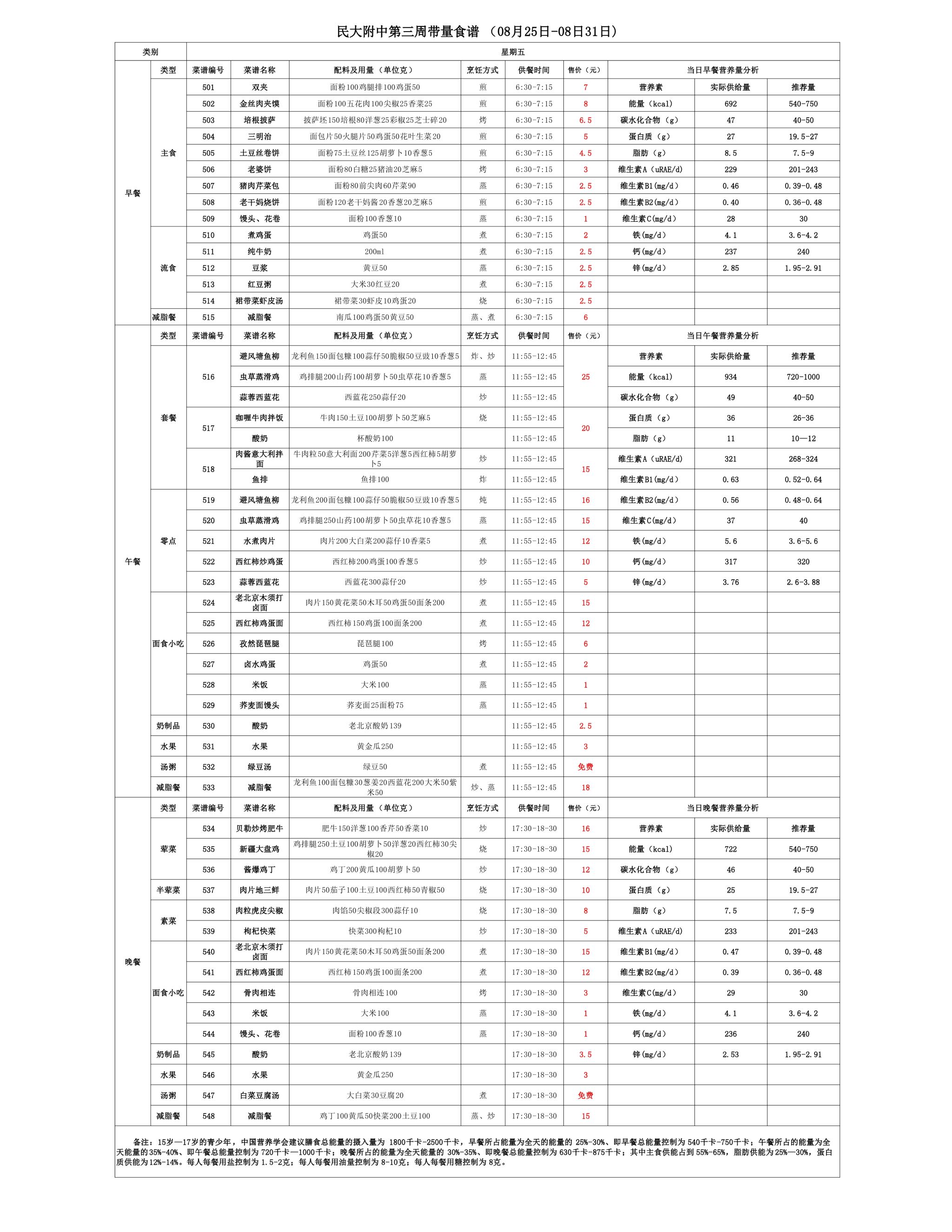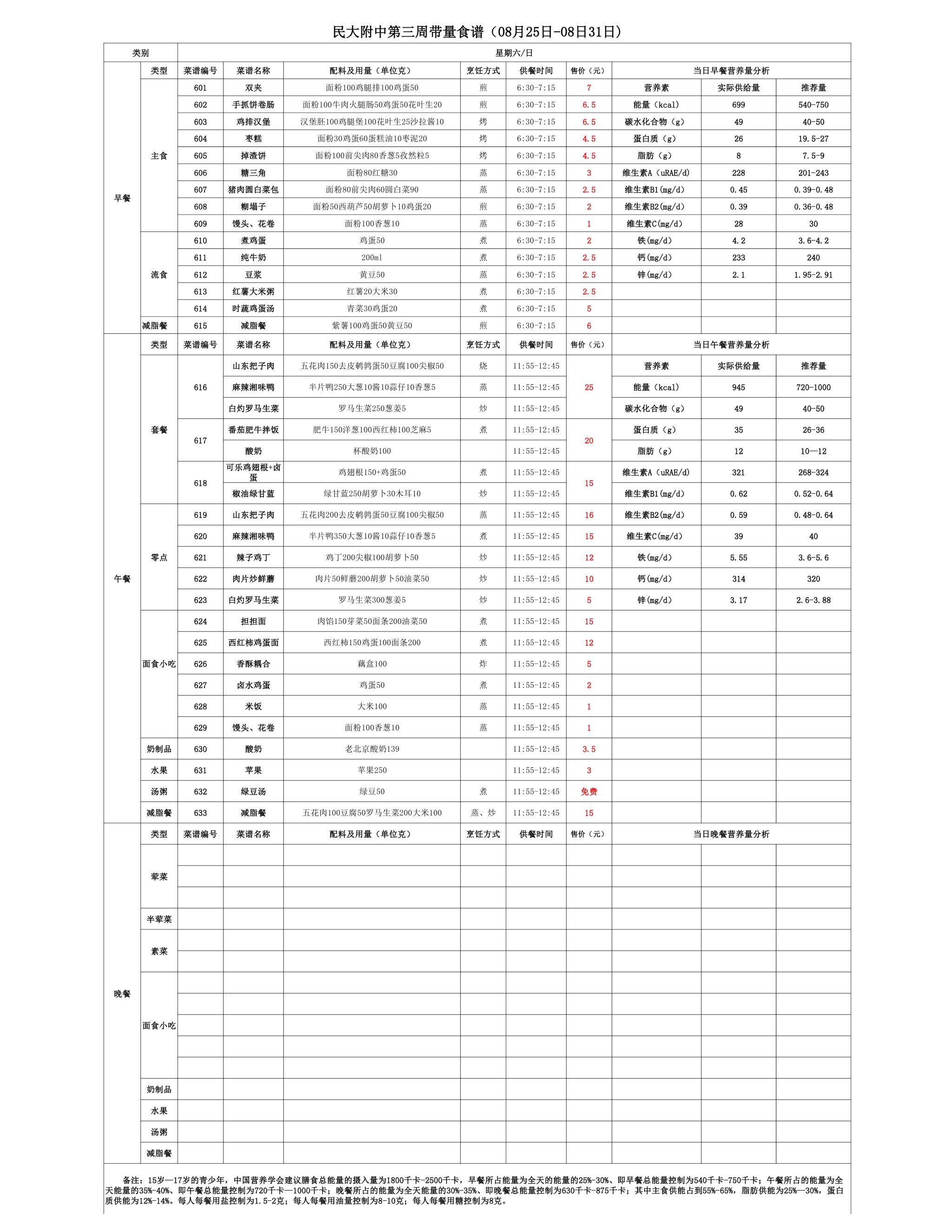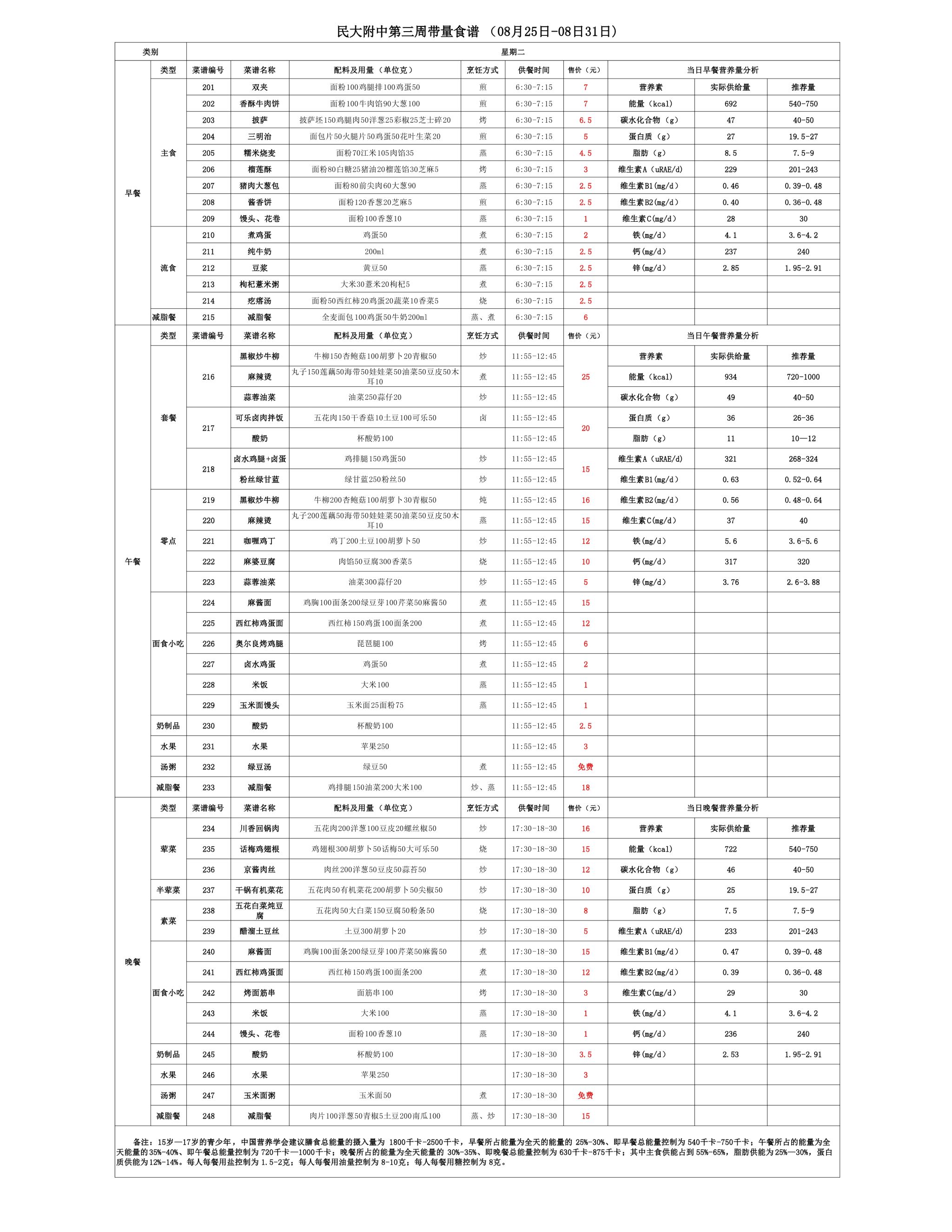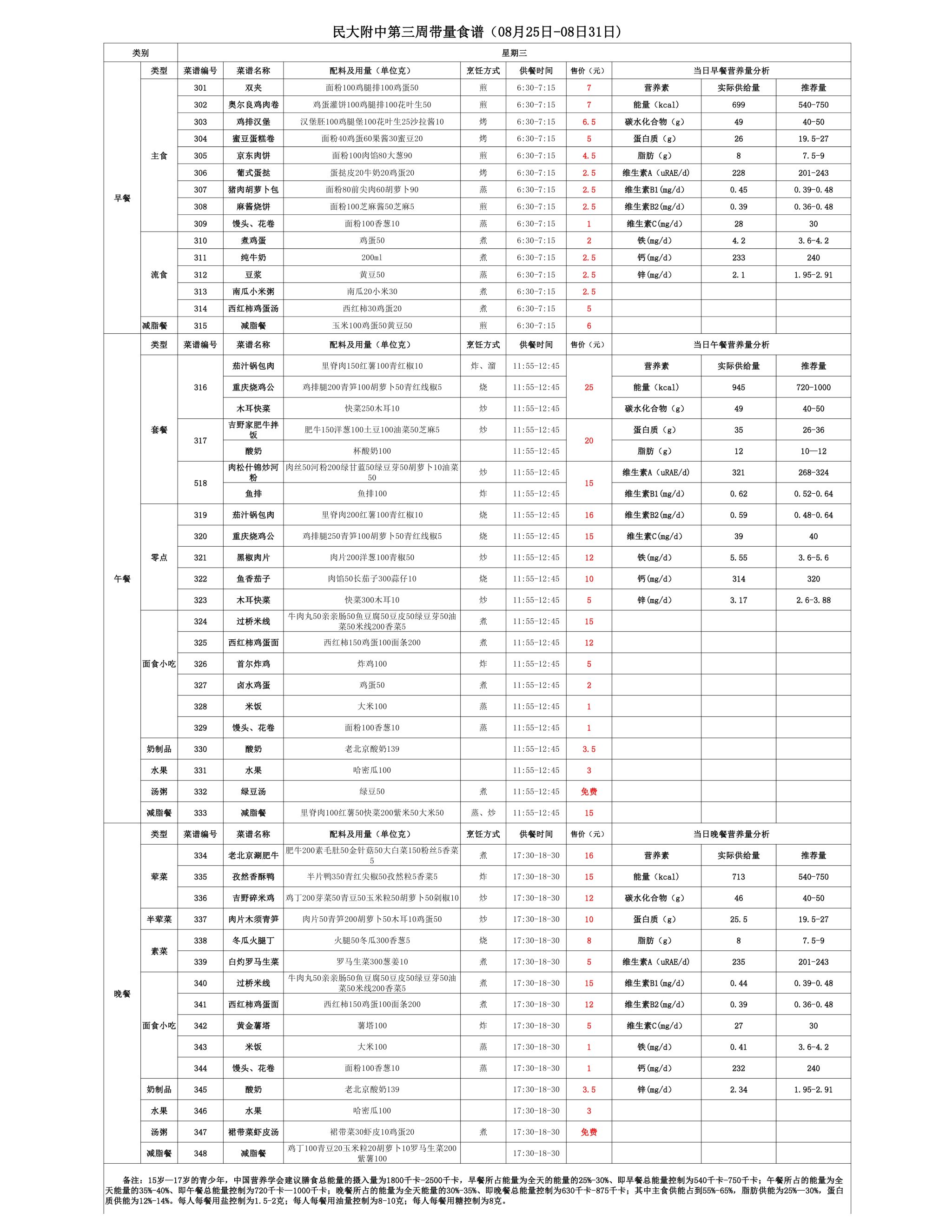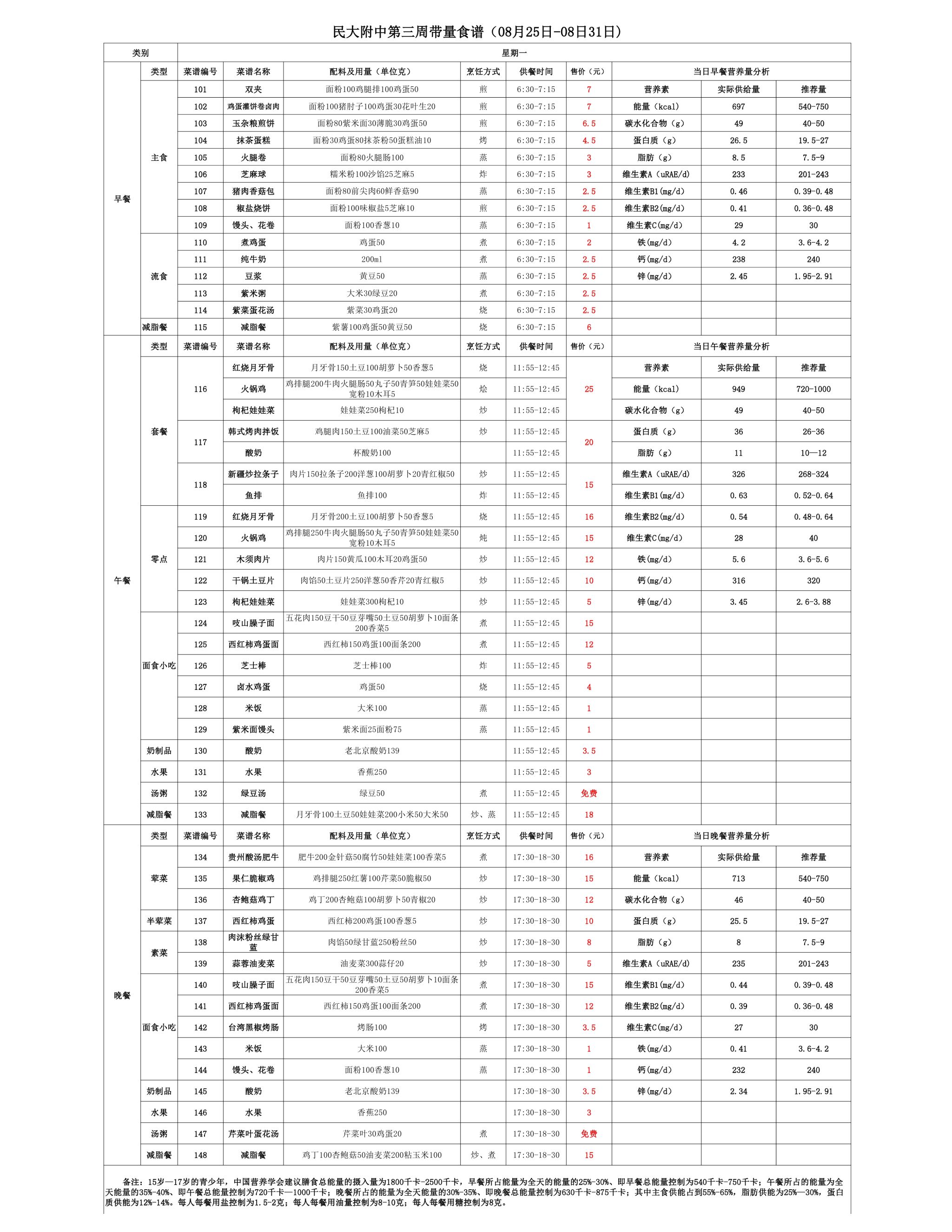 2025年夏季学期朝阳校区食堂菜谱(2025.08.25 - 08.31)