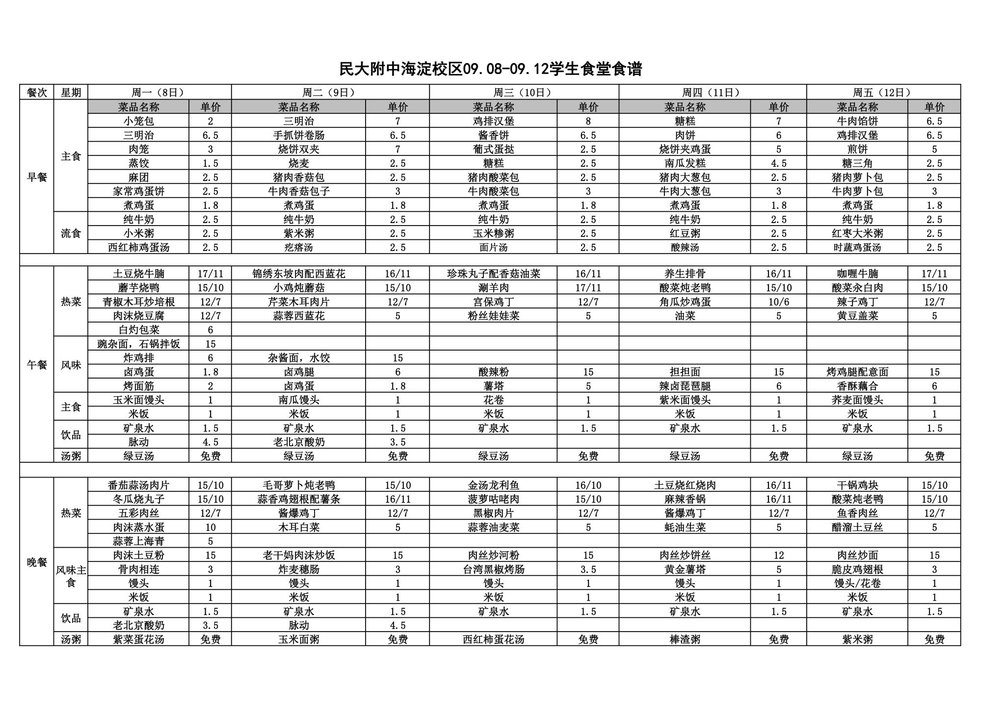 2025年秋季学期民大附中海淀校区学生食堂菜谱公示(2025.09.08-2025.09.12)