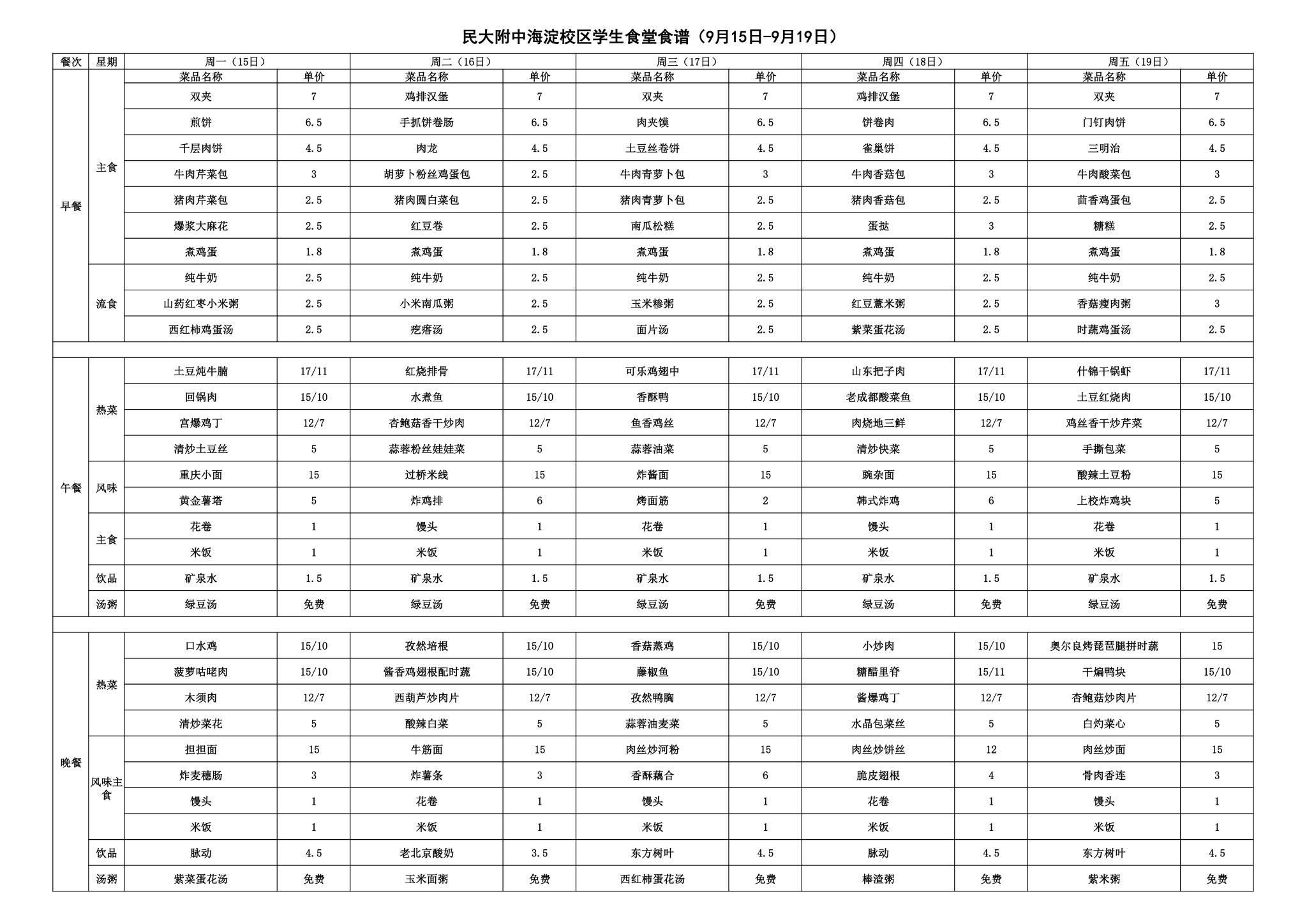2025年秋季学期民大附中海淀校区学生食堂菜谱公示(2025.09.15-2025.09.19)