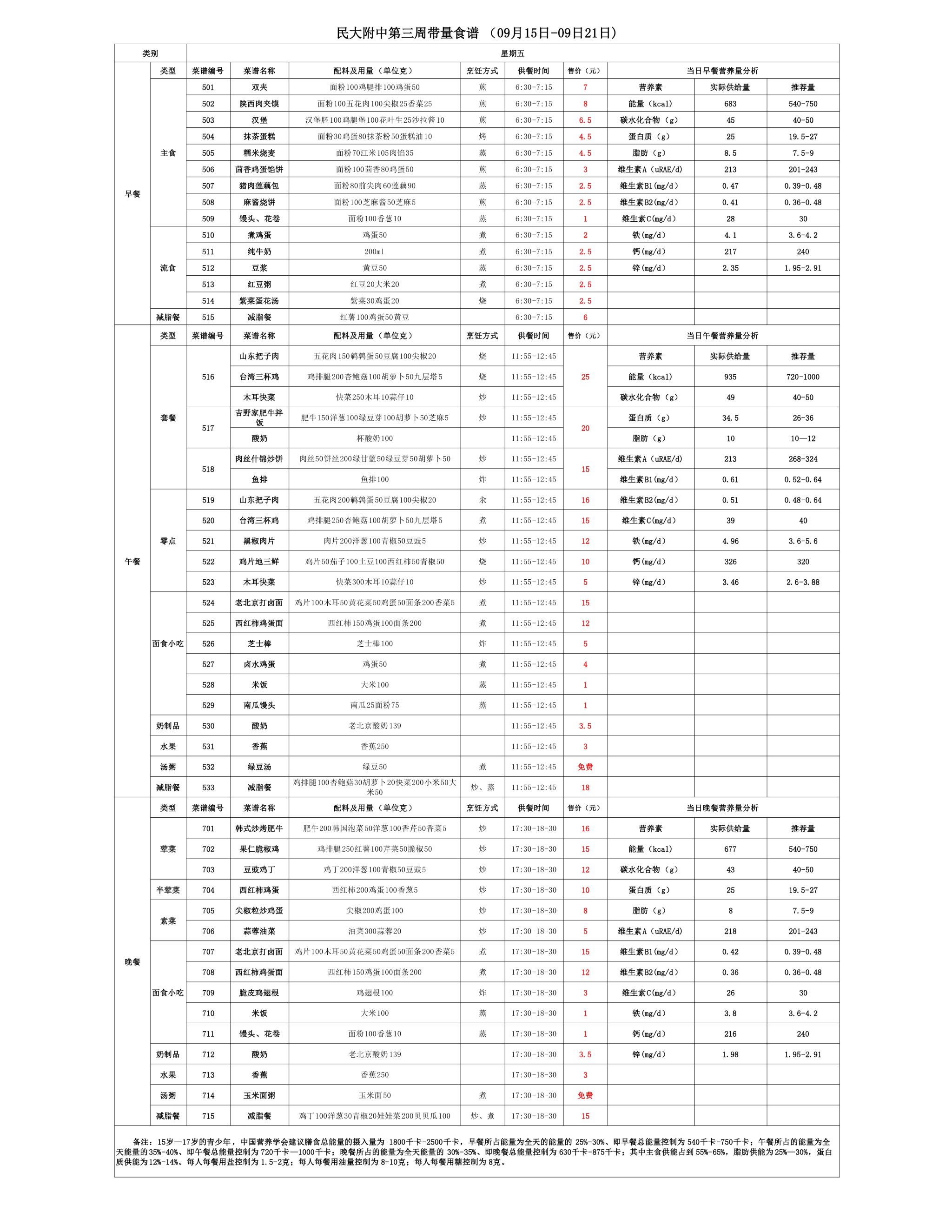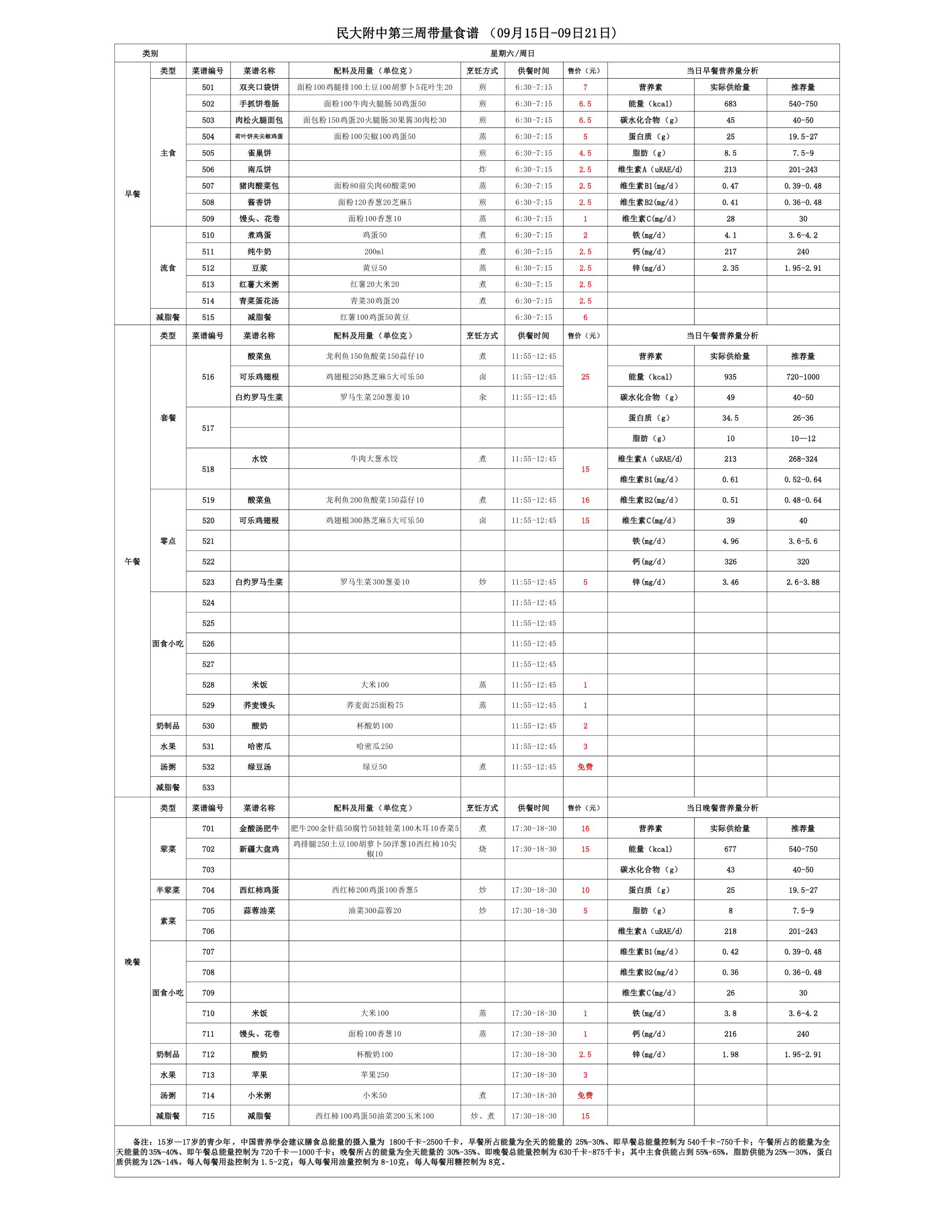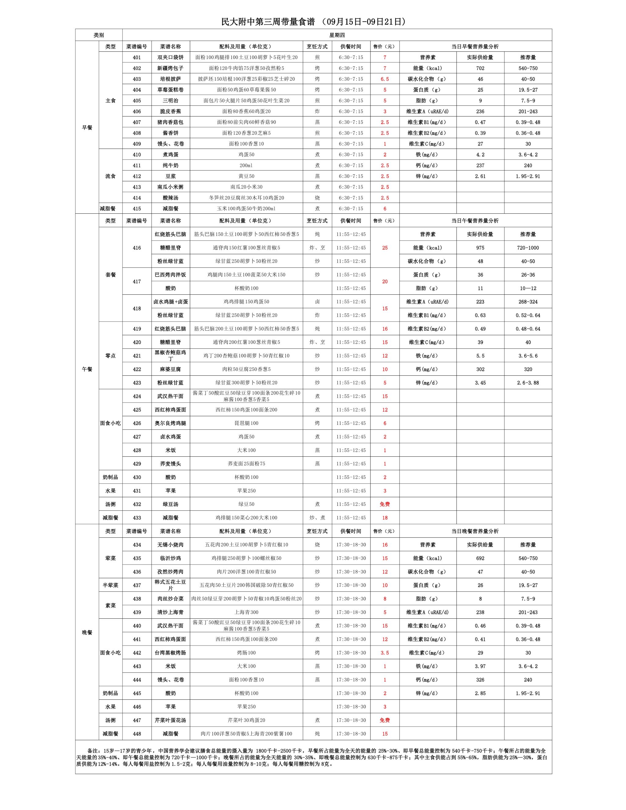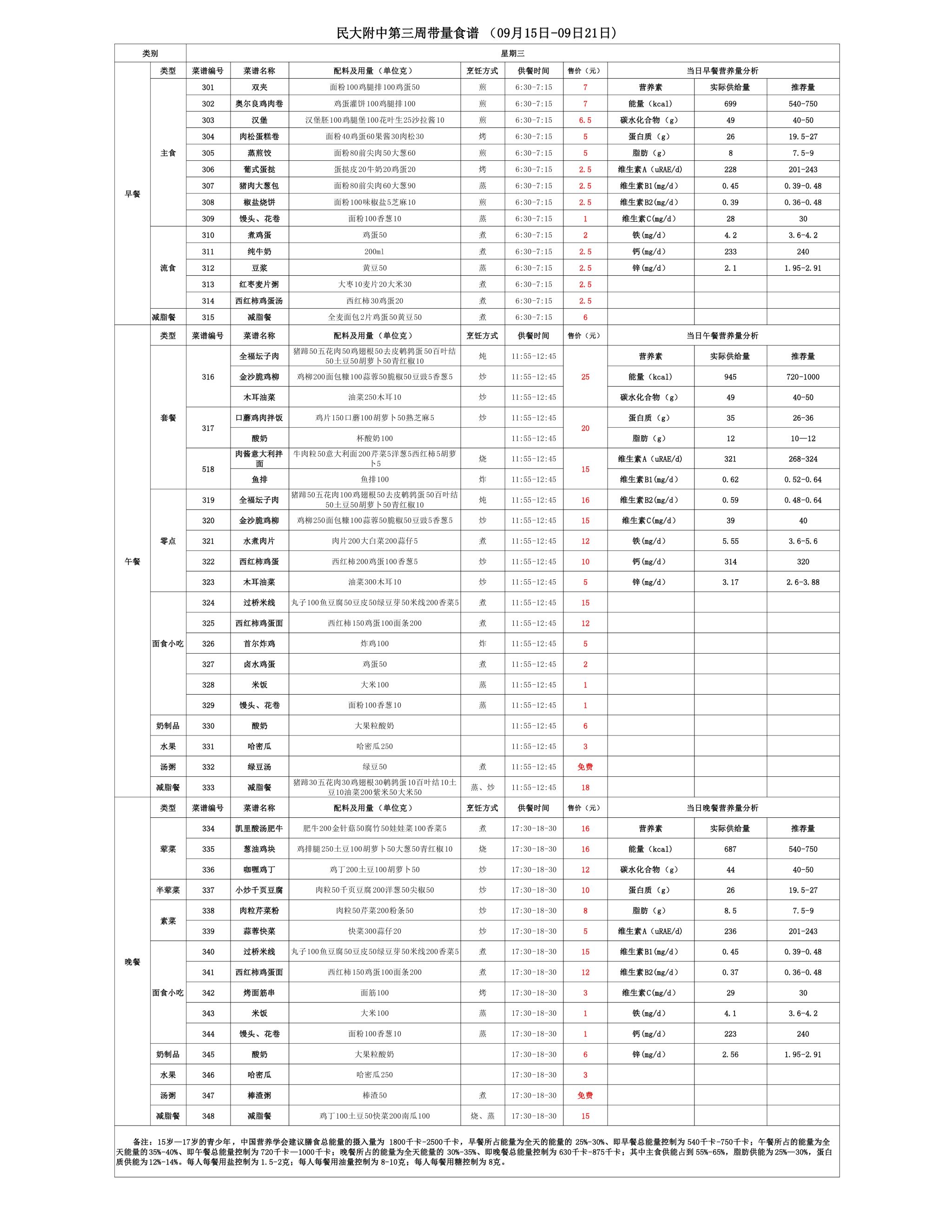 2025年秋季学期朝阳校区食堂菜谱(2025.09.15-09.21)