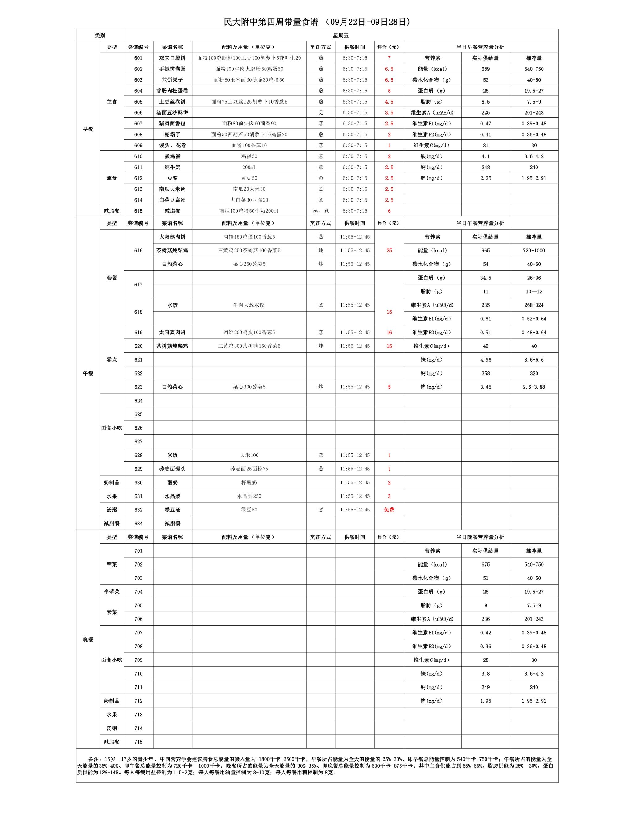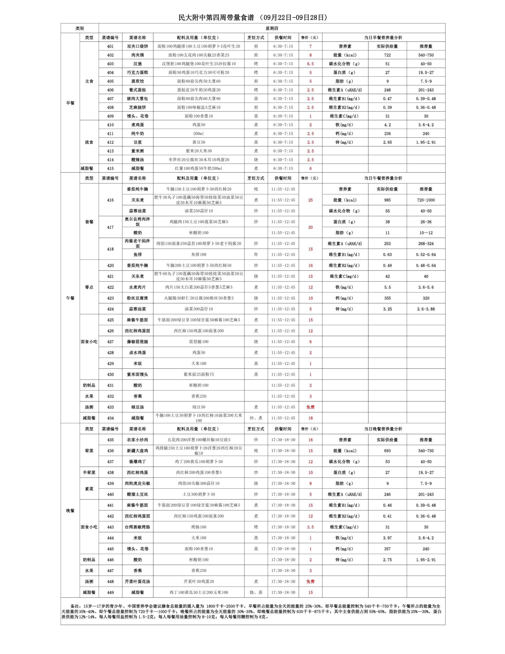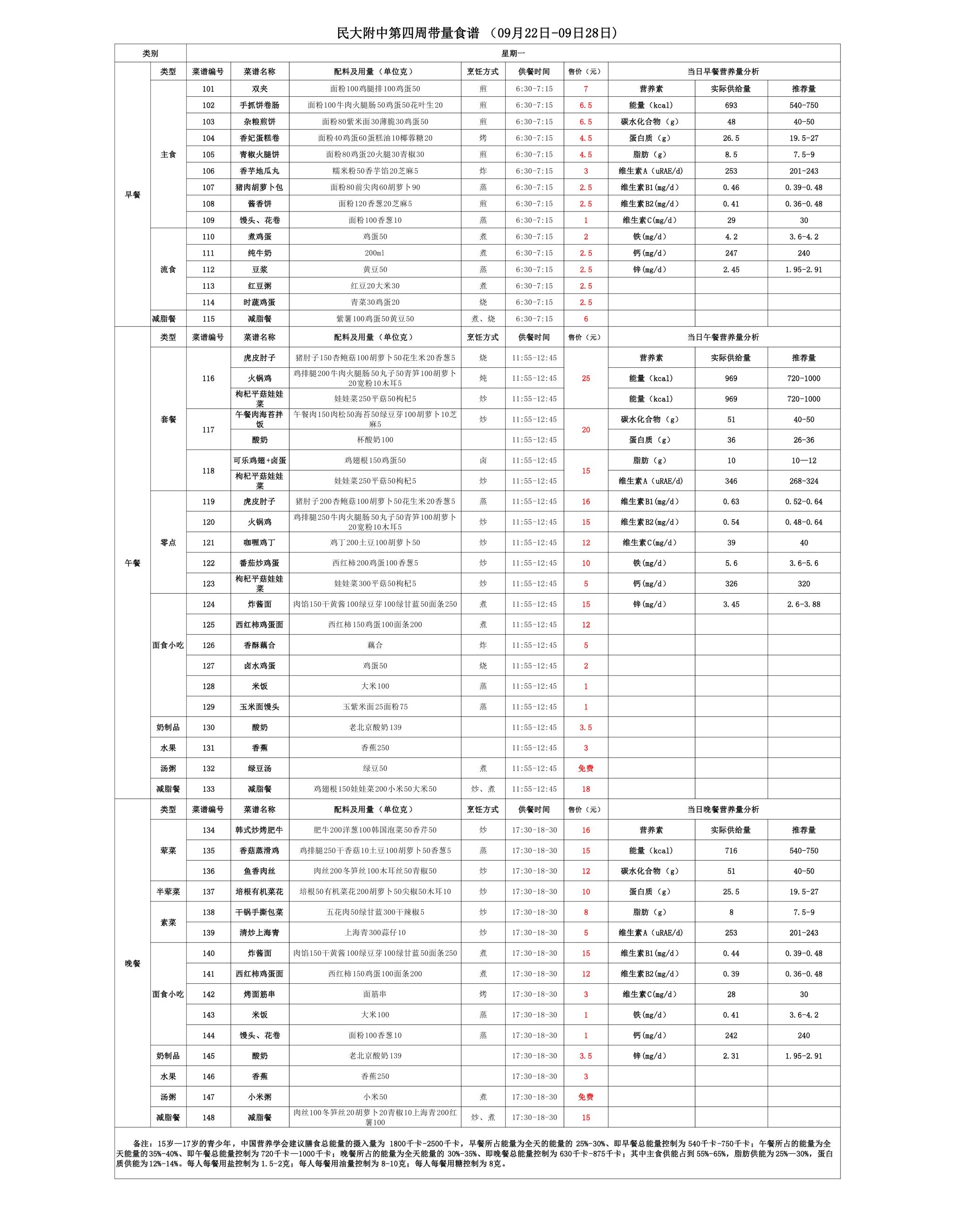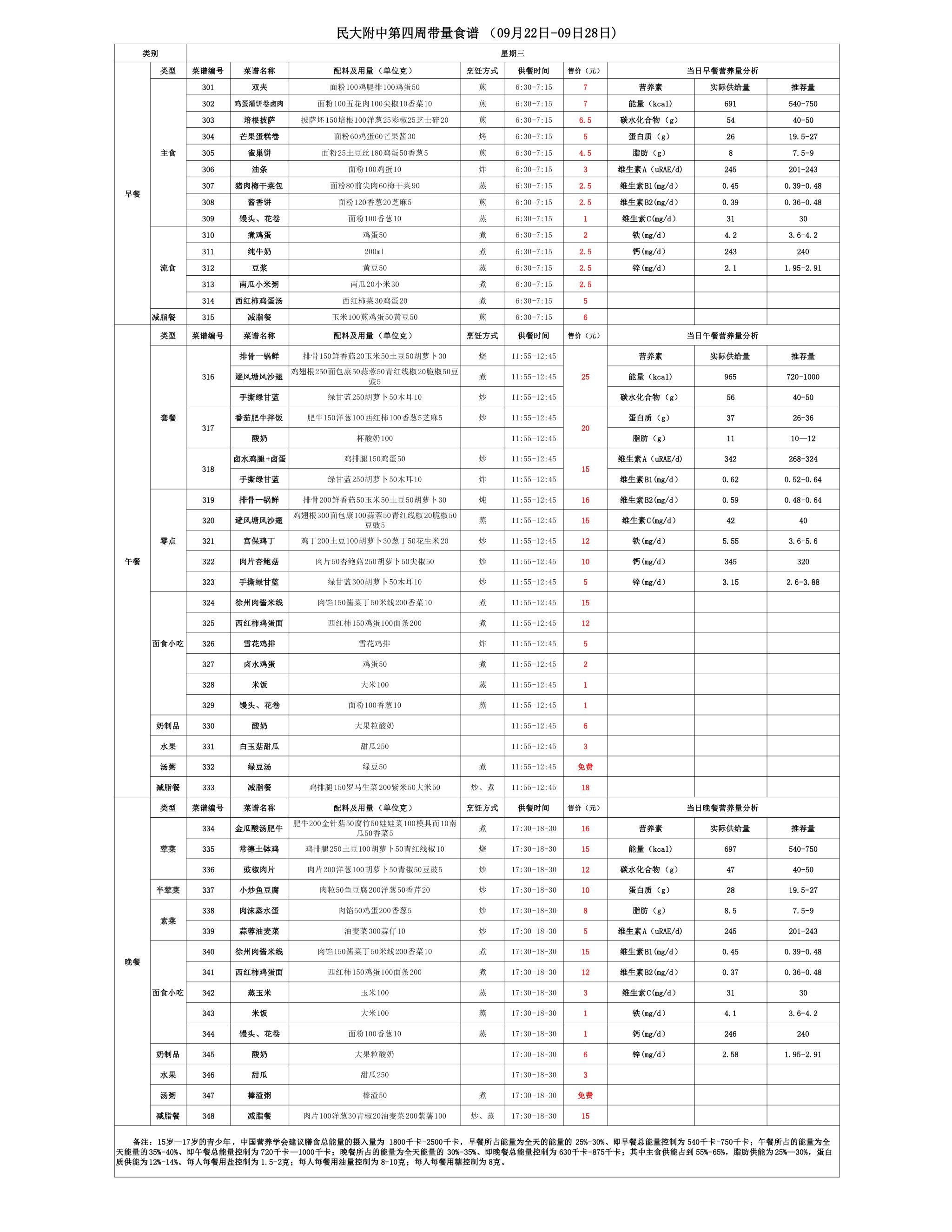 2025年秋季学期朝阳校区食堂菜谱(2025.09.22-09.28)
