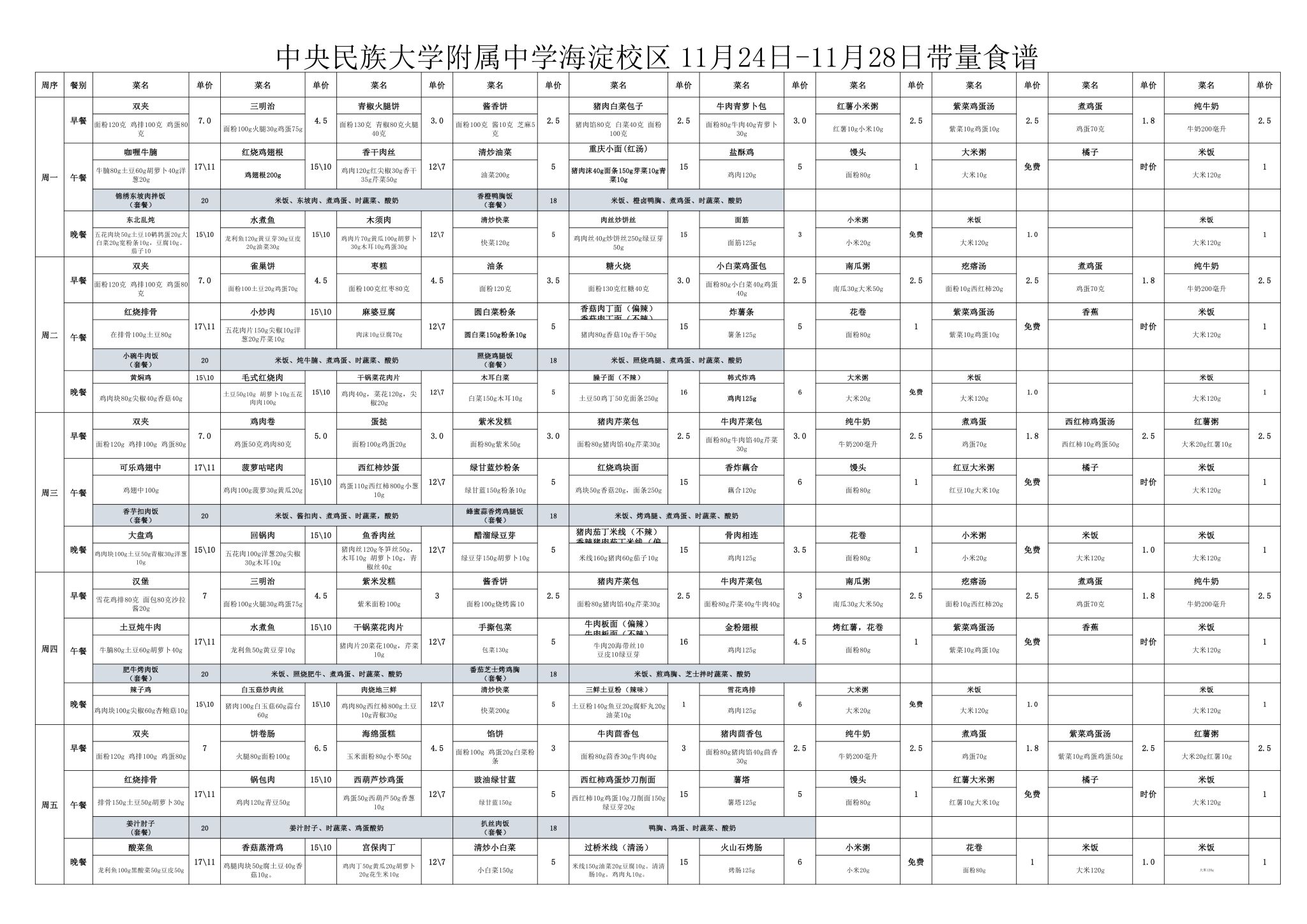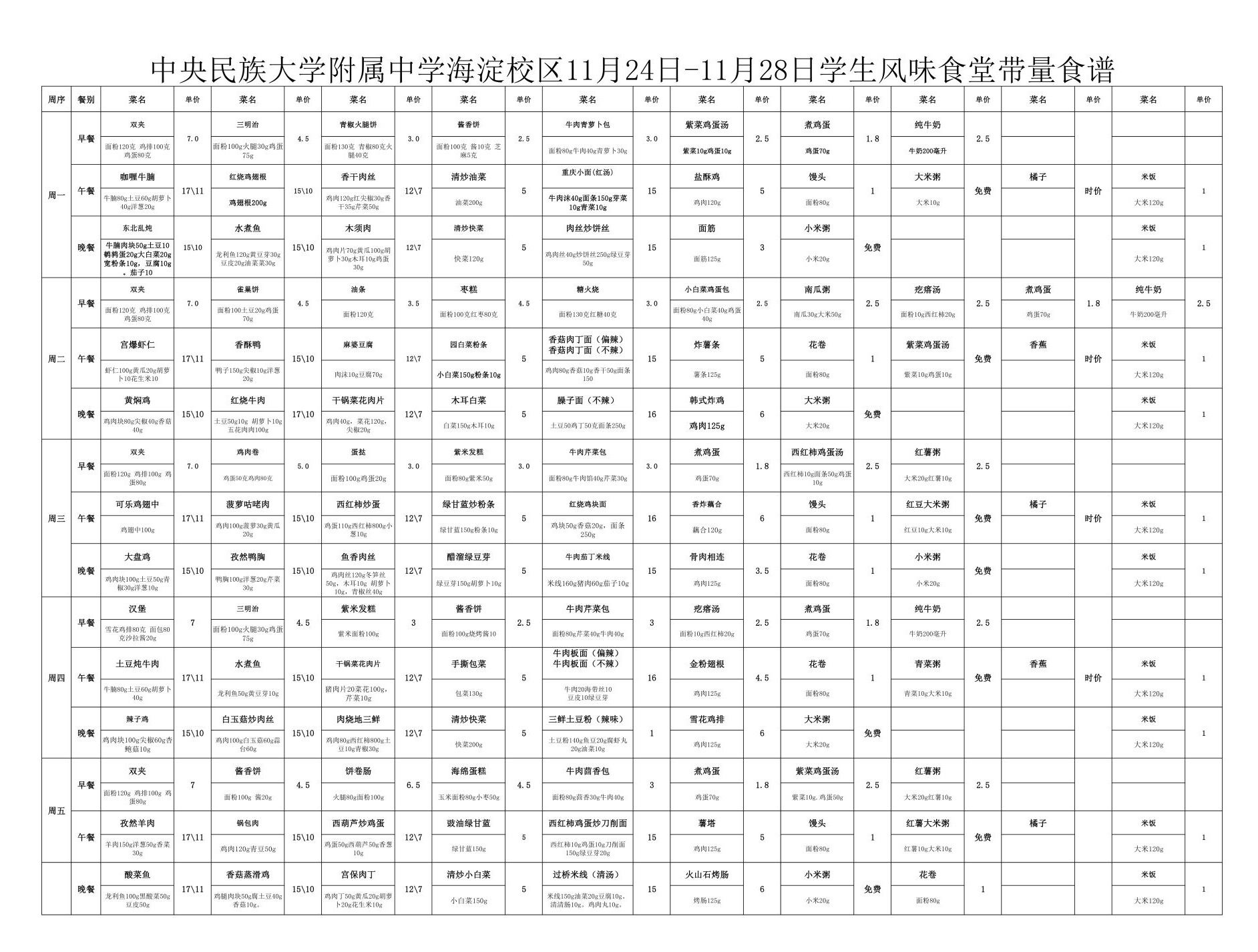 2025年秋季学期民大附中海淀校区学生食堂菜谱公示(2025.11.24-2025.11.28)