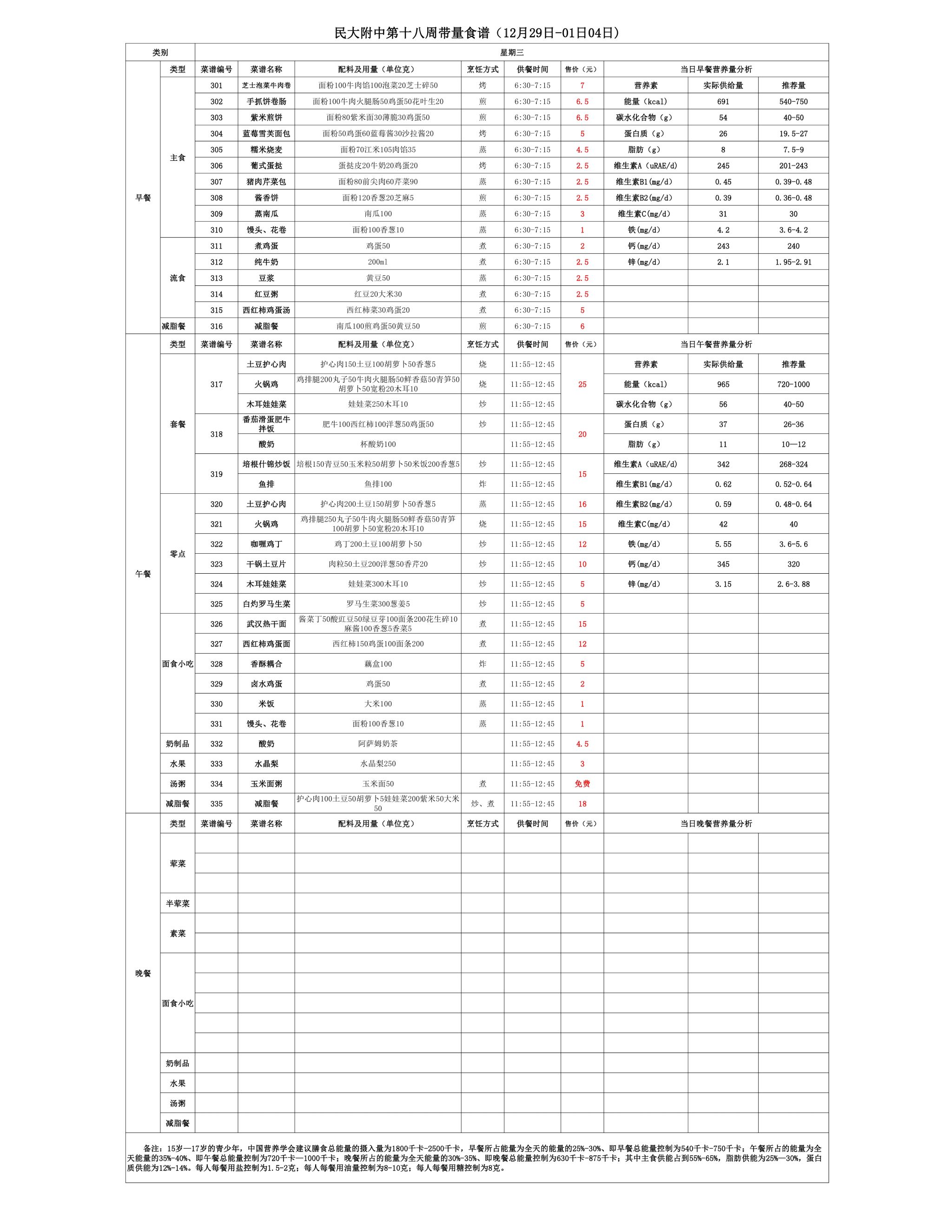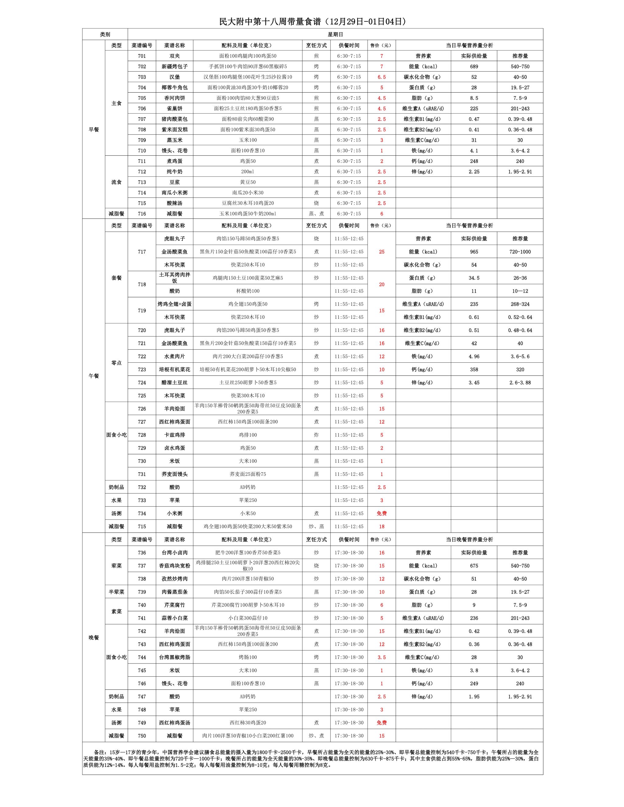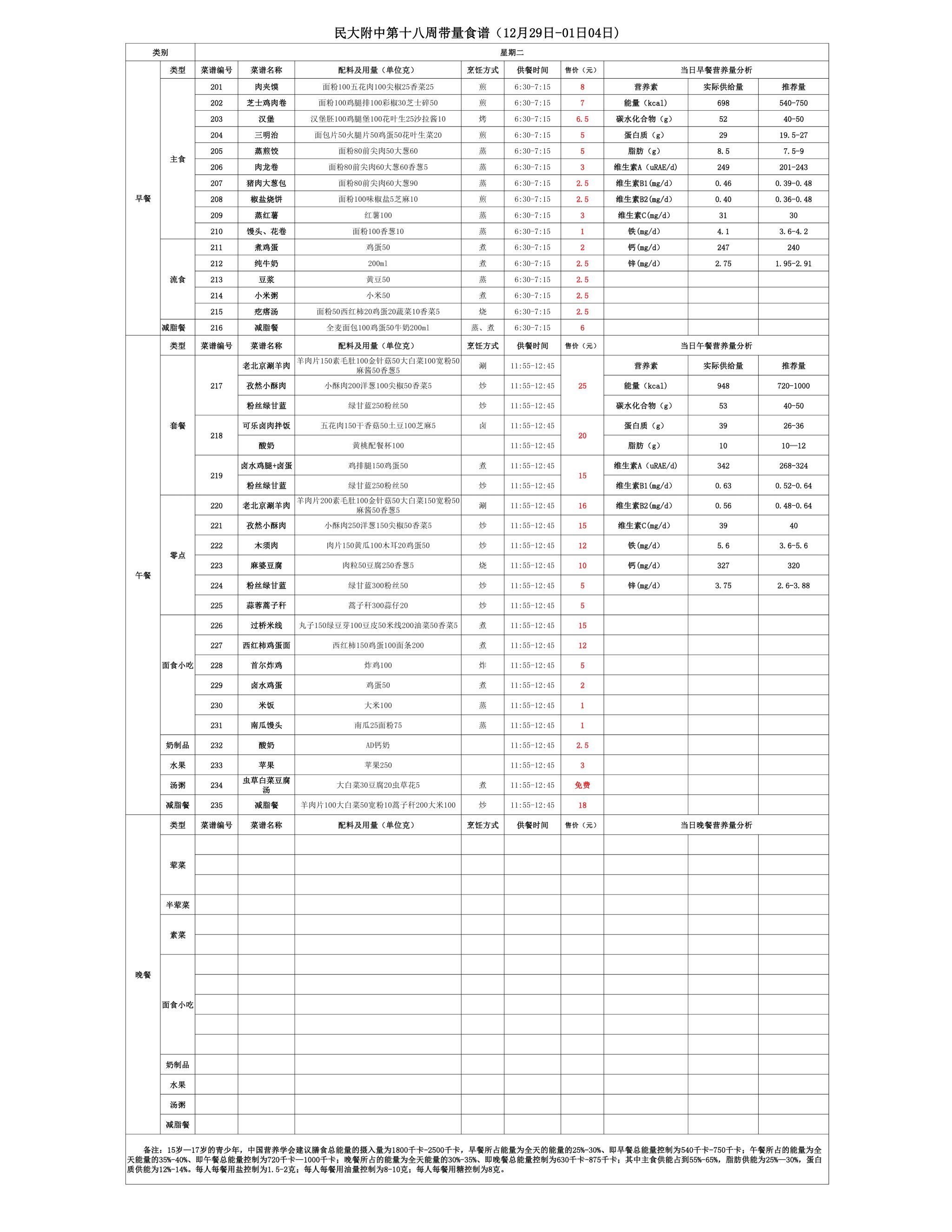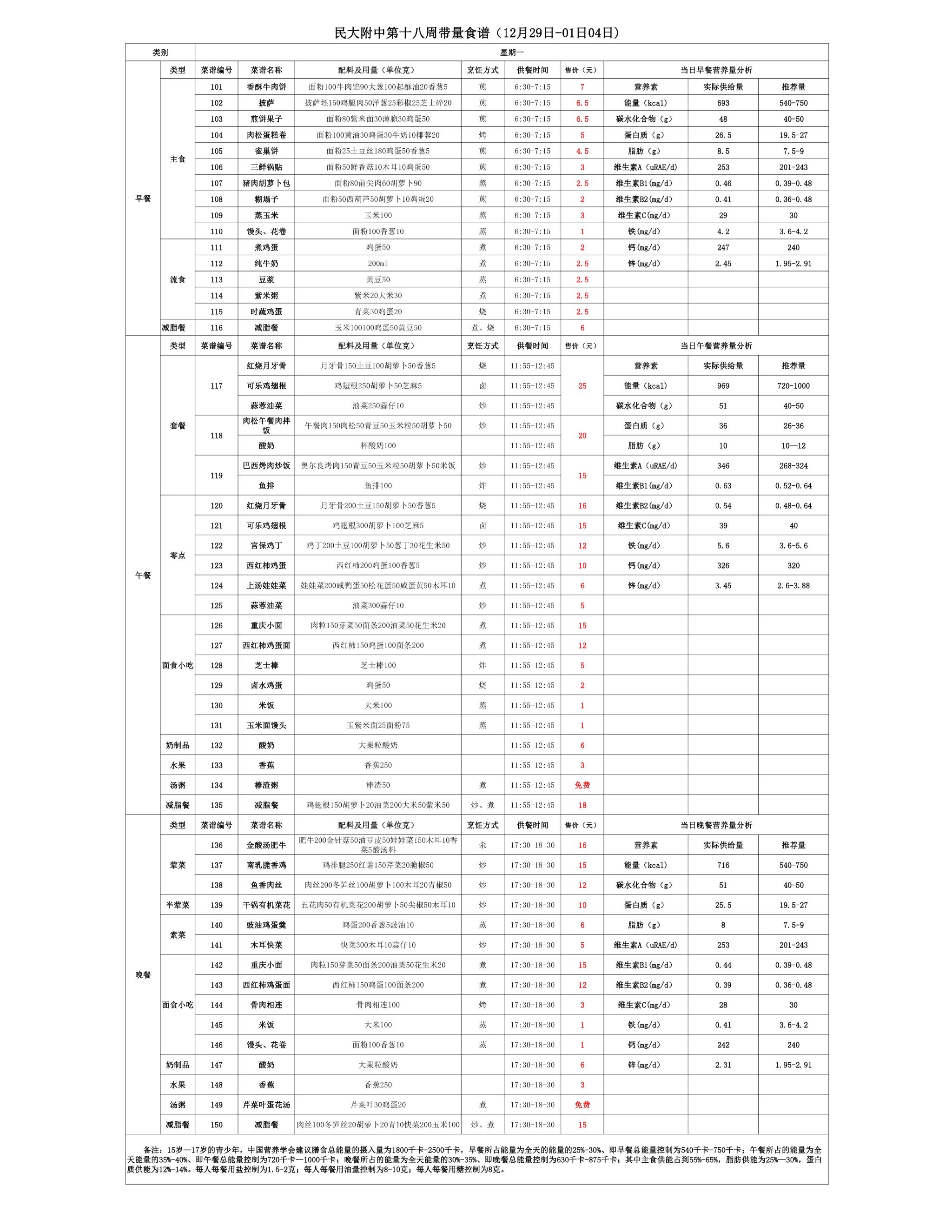 2025年秋季学期民大附中朝阳校区学生食堂菜谱公示(2025.12.29-2026.01.04)