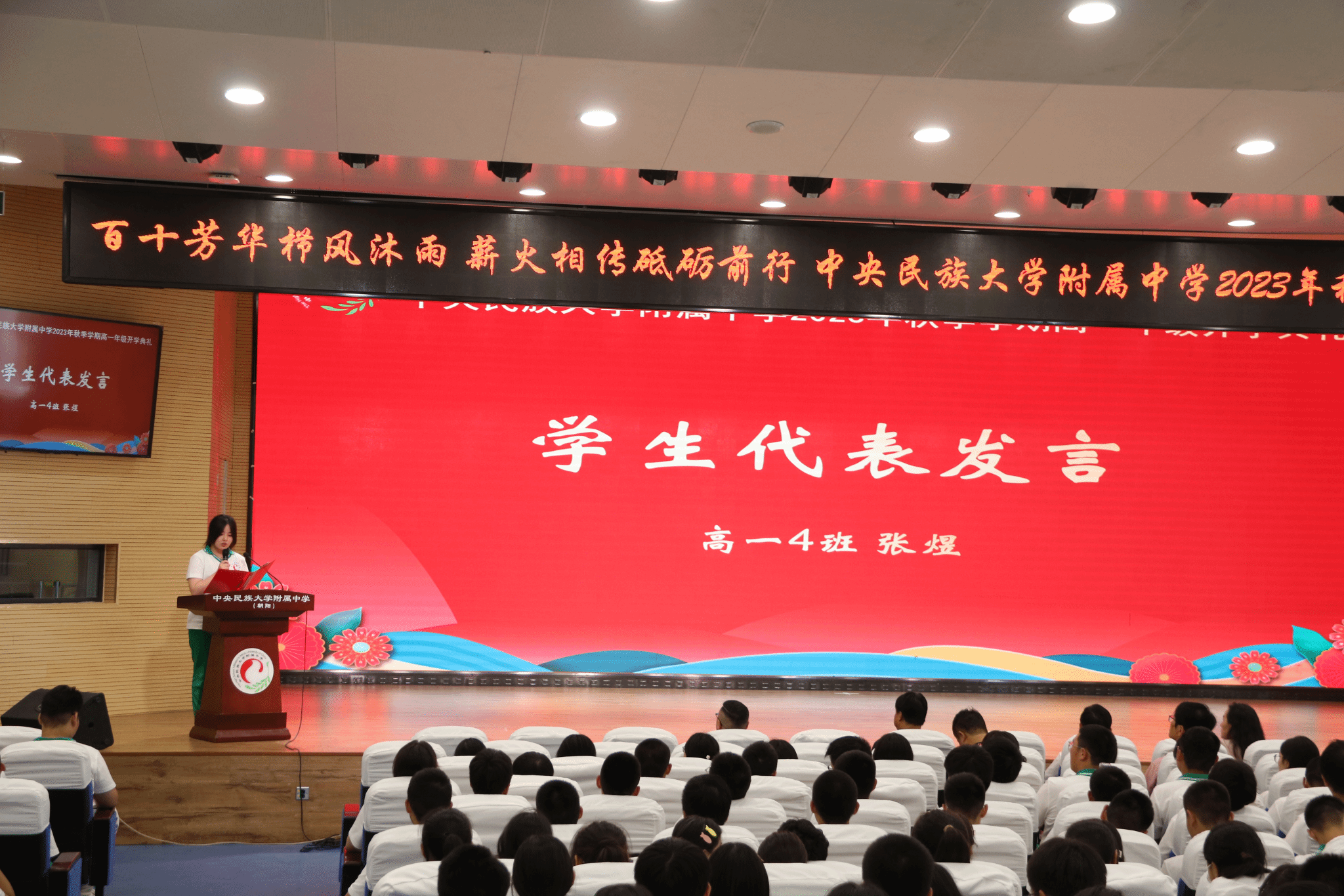 高一4班张煜同学代表新生发言。她分享了逐梦民附的热切期望,号召同学们传承学校的优良传统和红色基因,勤奋刻苦,投身到建设伟大祖国、建设美丽家乡的崇高事业中。