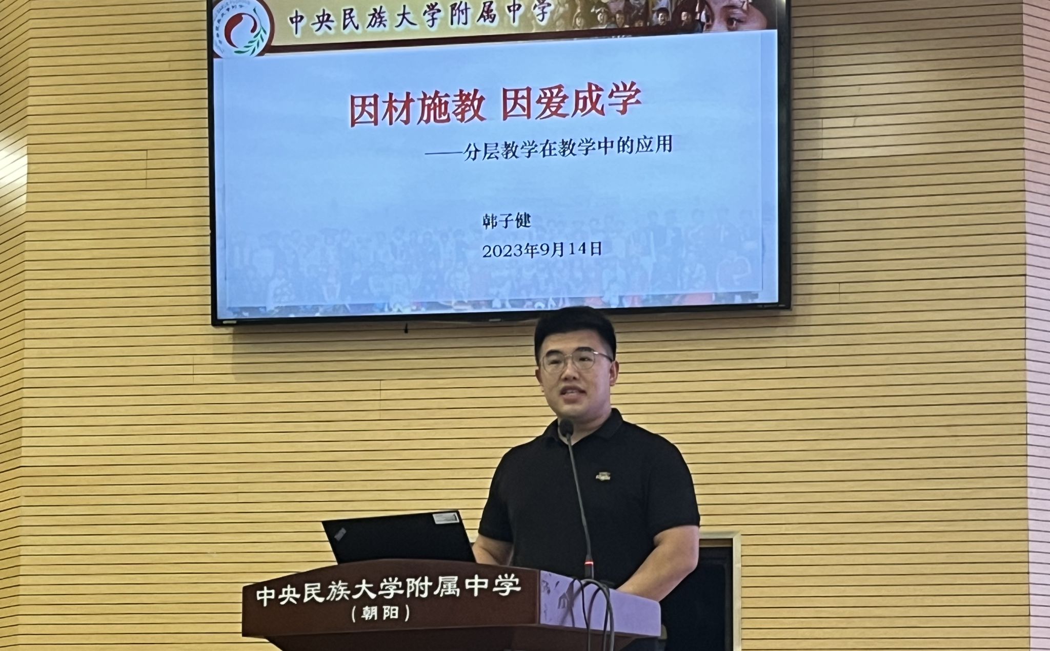 高一年级数学组韩子健老师做了“因材施教,因爱成学”的主题发言,从学生、课堂、评价、反思四个方面进行了分享。