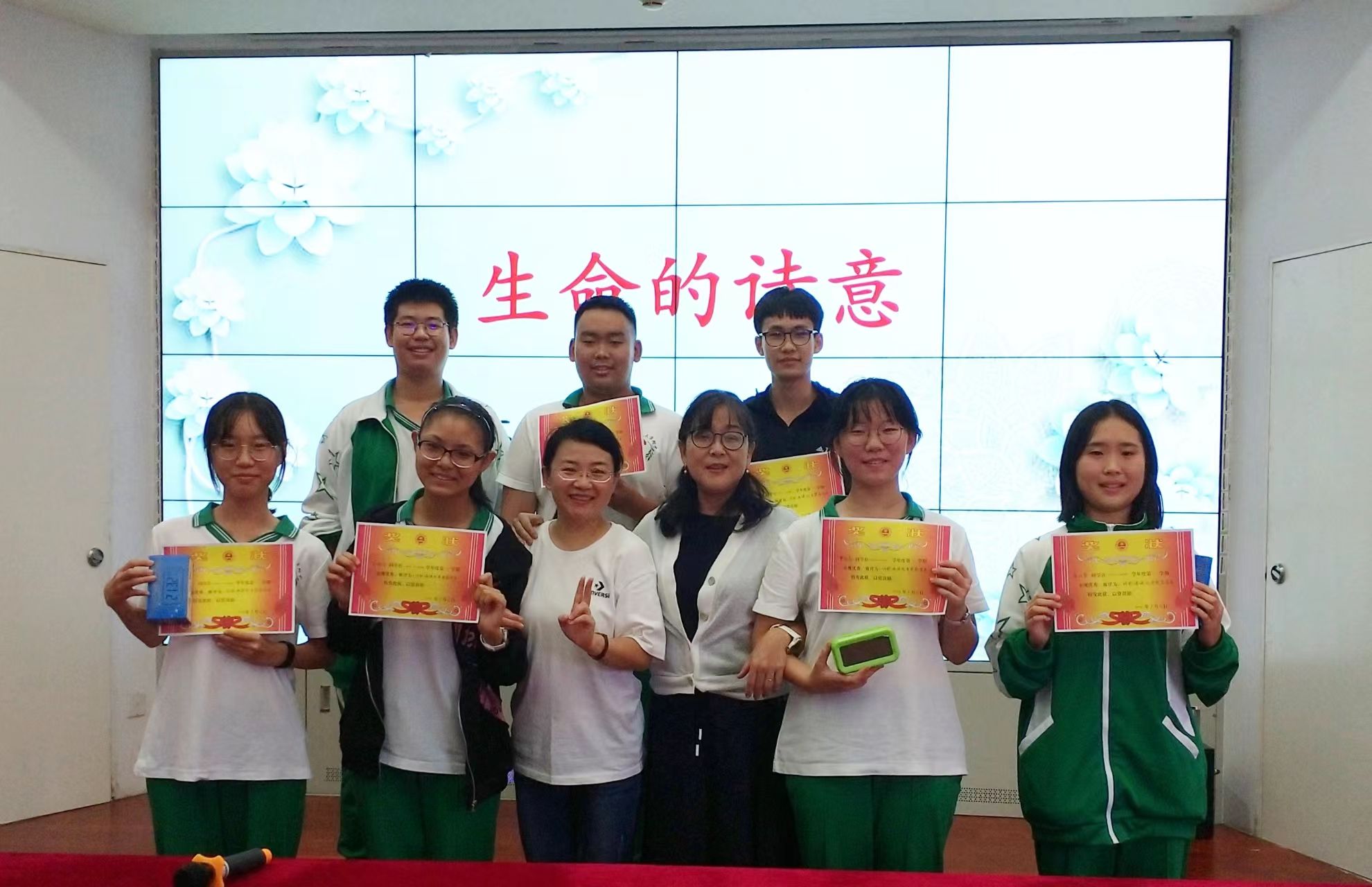 老师们给获奖学生颁发奖状和奖品
