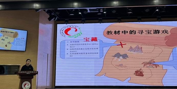 高一年级生物组黄轶老师以“阅读、悦读、越(跃)读——关于教材使用的一些尝试和设想”为题做了经验分享。黄老师立足于新课程背景、考试方向及教研要求,分析阅读教材的必要性。针对学生“不会读、不爱读、不重视”教材的问题,黄老师深度挖掘教材,重构教学内容,创新性地将教学设计与寻宝游戏相结合,以教师为领队,学生为队员、同行者,通过闯关模式完成教学任务,并把整个教学过程贯穿于游戏当中,增强学生体验感,从而帮助学生学会学科阅读、享受阅读乐趣、培养阅读习惯。