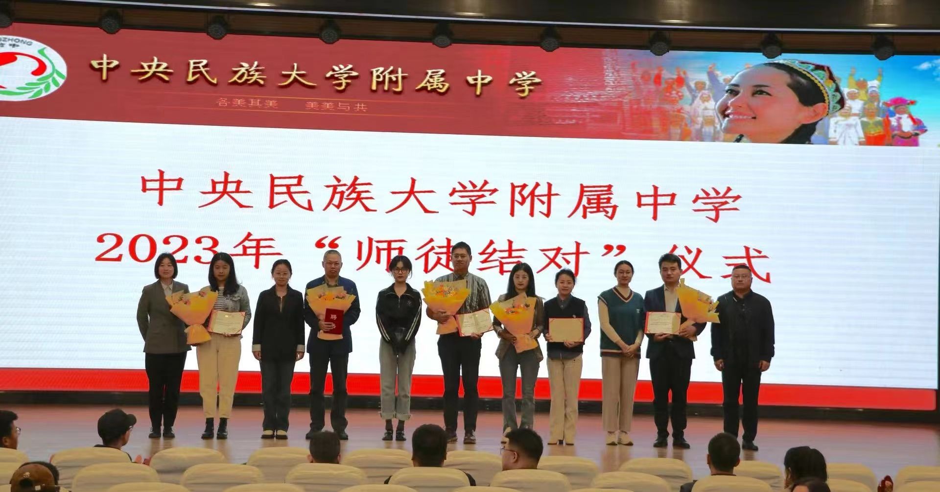 根据民附传统,为提升教师队伍整体素养,充分发挥骨干教师“传、帮、带”的作用,促进青年教师专业化成长,论坛最后举行了师徒结对仪式。由教务科周雅楠副科长宣读师徒结对名单,民大附中朝阳校区执行校长魏立功向指导教师们颁发了导师聘书,徒弟们怀着真诚的敬意向师傅鞠躬、献花并合影留念。