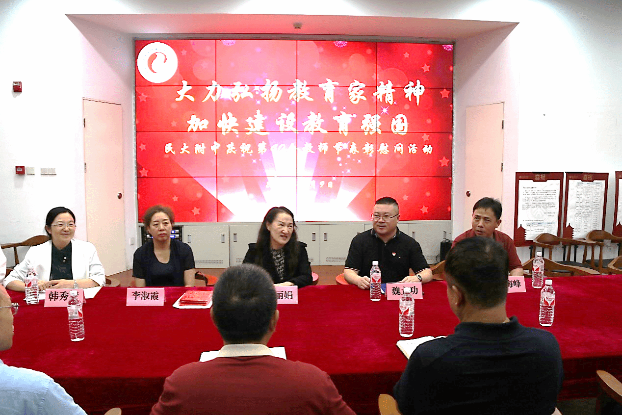 2024年9月9日下午,民大附中党委常务副书记佟丽娟、民大附中校长助理李淑霞、民大附中集团办主任廖海峰来到朝阳校区,代表学校慰问朝阳校区教职工,送来教师节的祝福。朝阳校区执行校长魏立功、朝阳校区副校长韩秀清,朝阳校区部分处室主任以及教师代表参加了慰问活动。