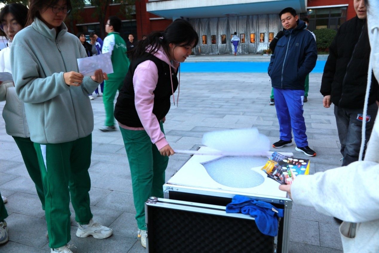 造云机的展示让同学们亲眼见识到人工云的形成过程,浓密的白色云雾在机器的推动下逐渐升腾,仿佛云朵从实验台上“飞”入了天空,引发了同学们对气象与物理原理的浓厚兴趣。