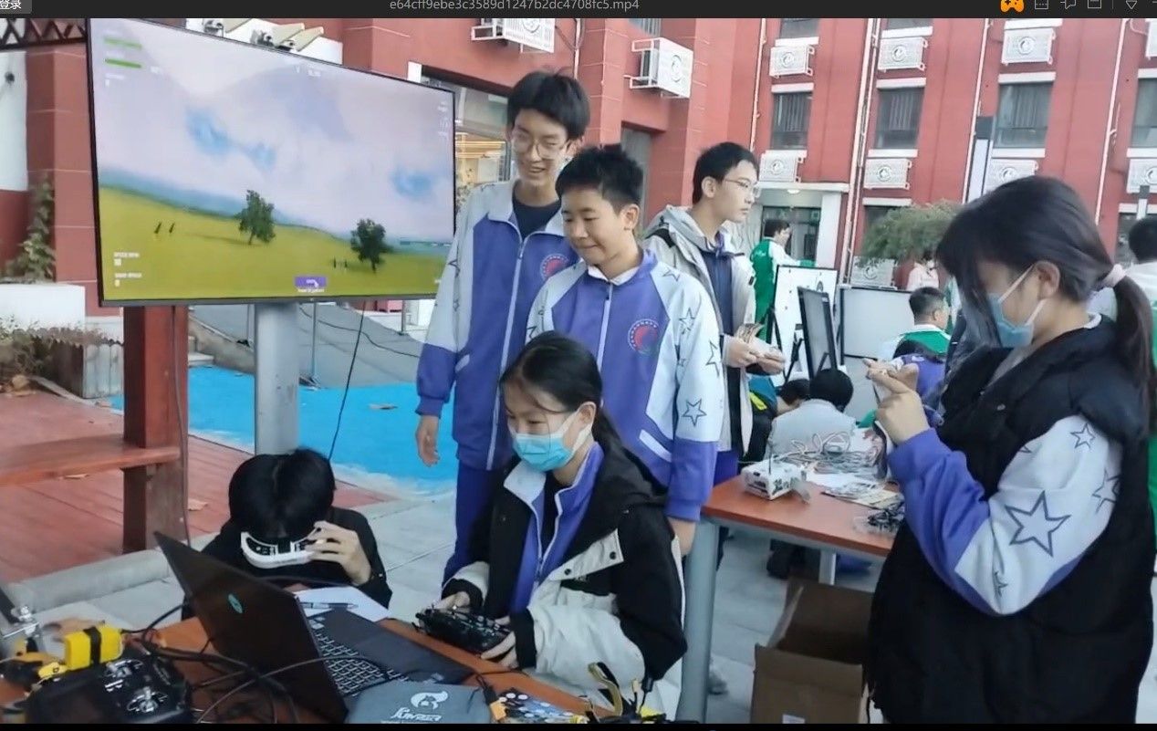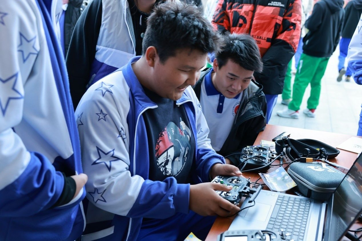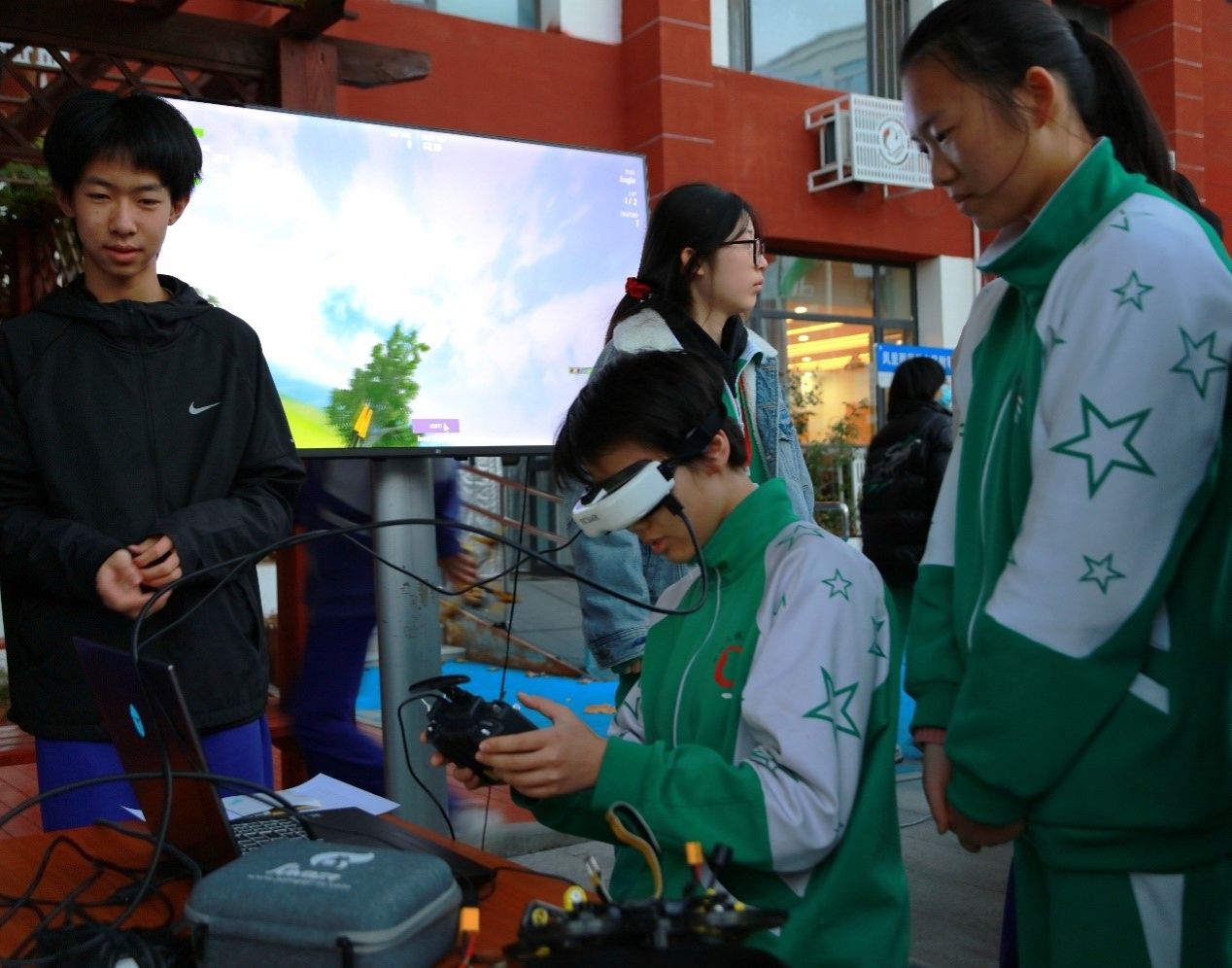 穿越机模拟器的挑战区域内,参与的同学们戴上虚拟现实眼镜,在虚拟世界中,操控着飞行器穿越重重障碍,体验飞行的刺激与紧张。这不仅是同学们对自身反应能力和空间思维的挑战,也是对科技创新应用的一次切身体验。